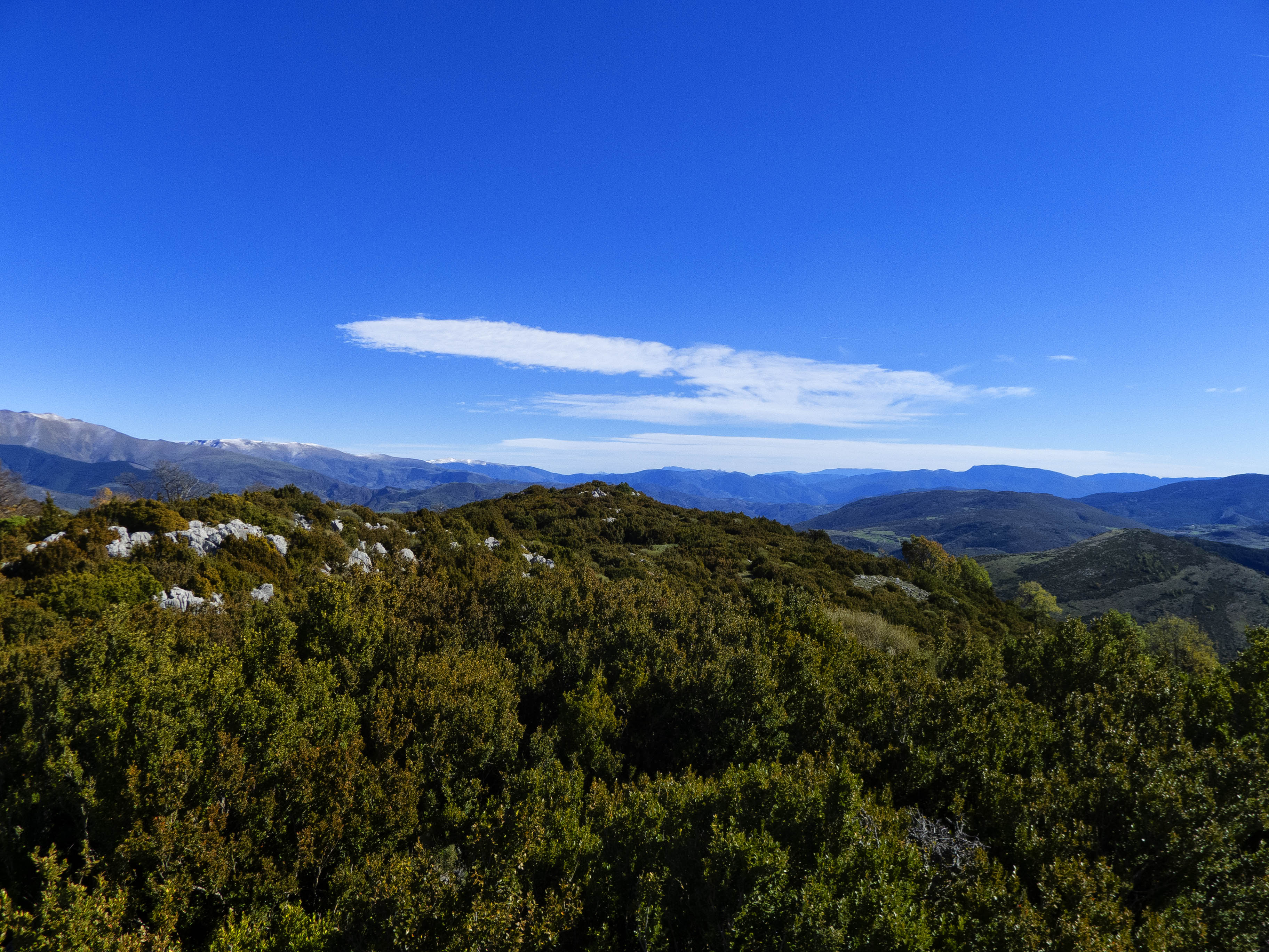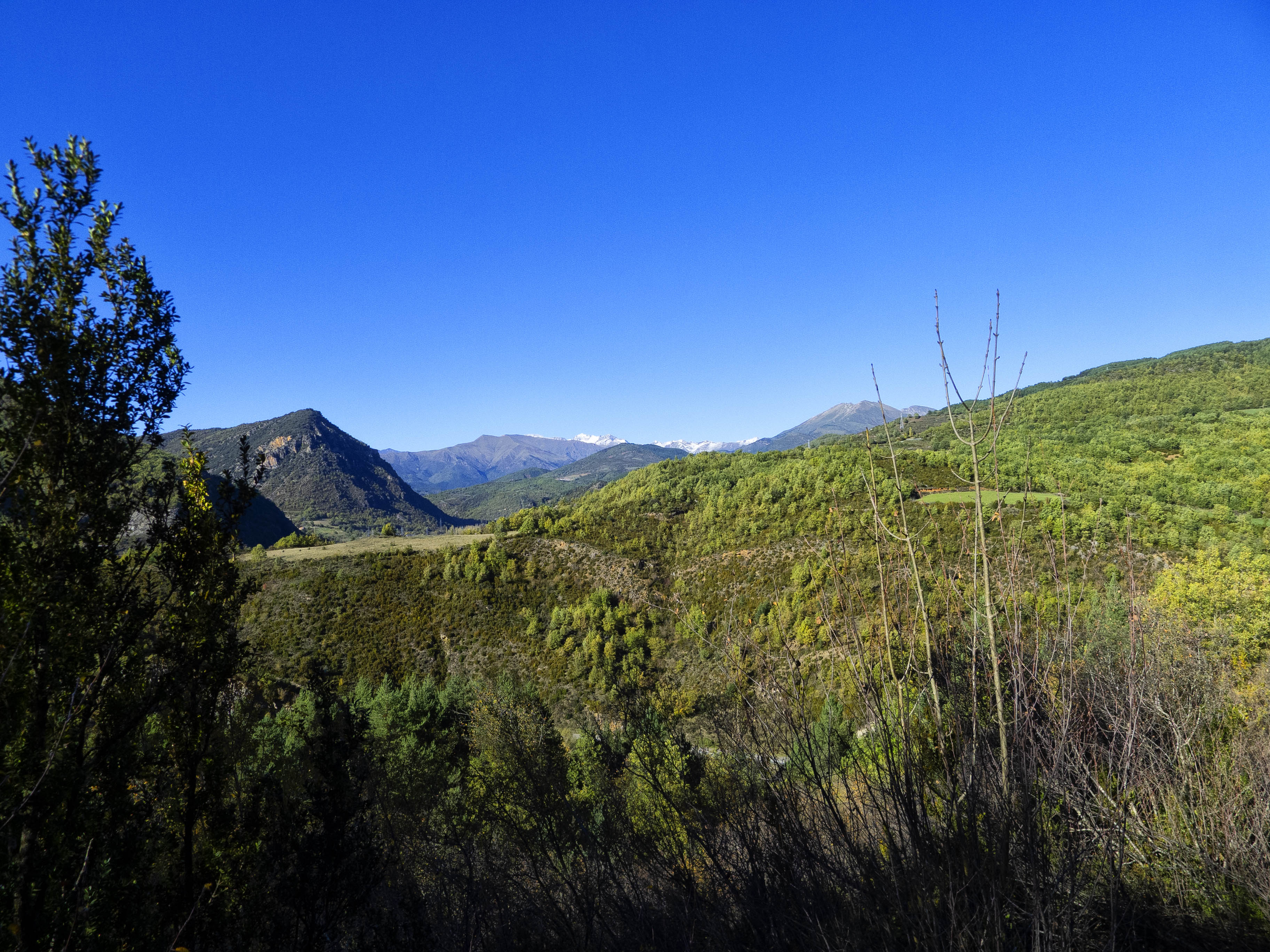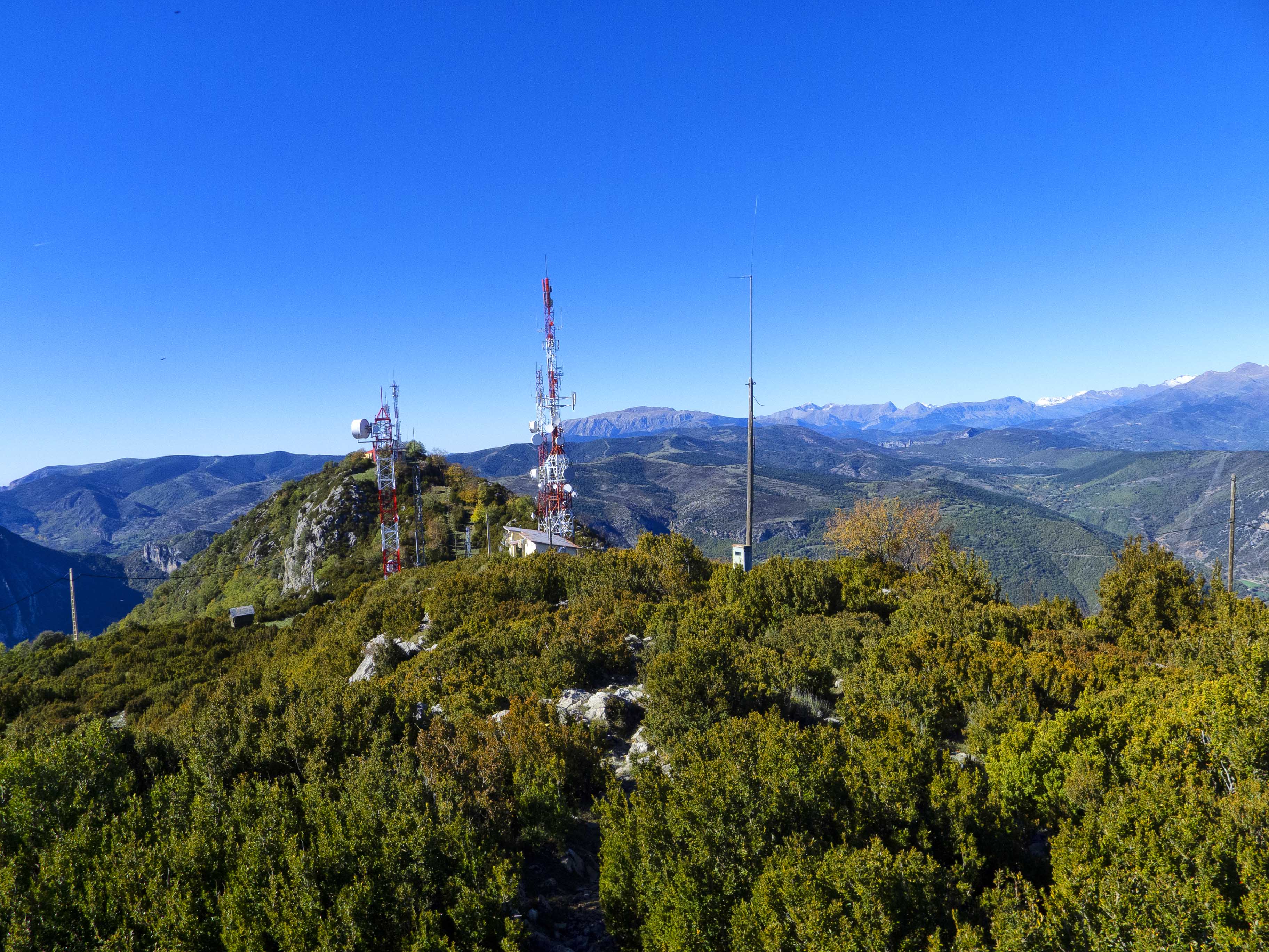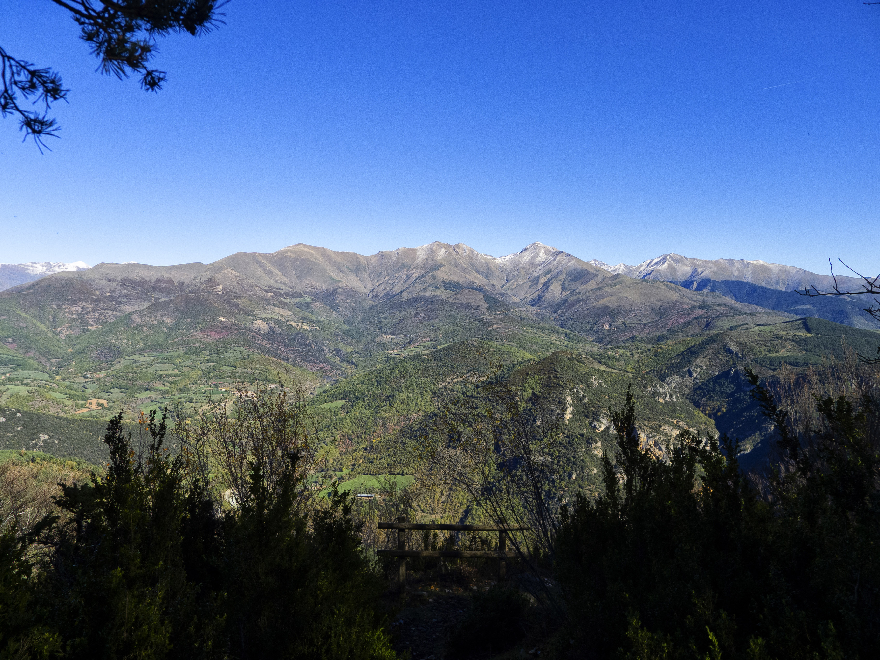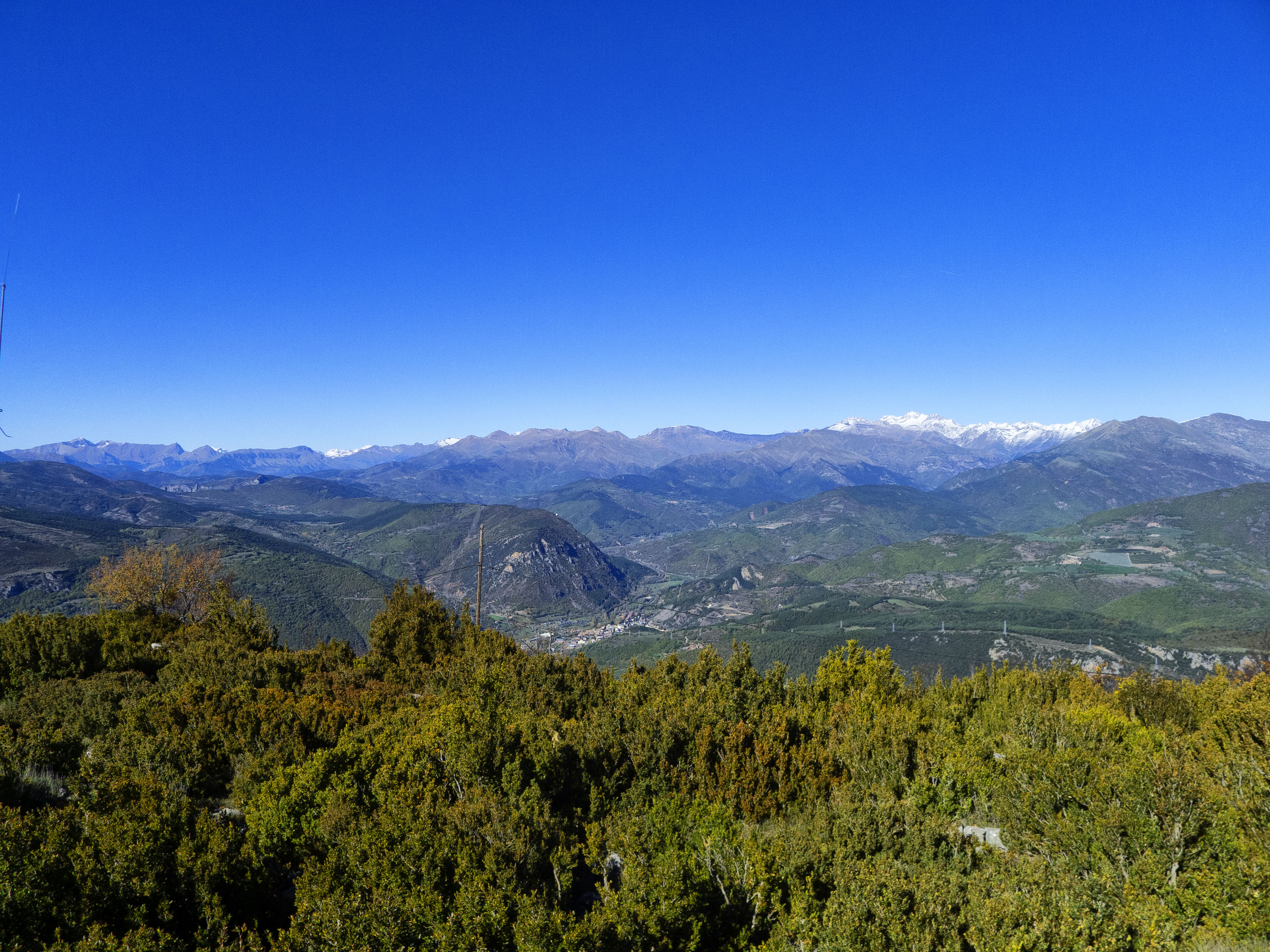 La cumbre, que compartimos con un vértice geodésico, es un mogote calcáreo que se eleva un par de metros por encima de una selva de matorral bastante incómodo. Gracias a esta elevación podemos ver vistas que de otro modo nos serían complicadas de ver, como este panorama septentrional de la Ribagorça, tanto la catalana como la aragonesa, que se ve coronada por el blanco intenso de la Maladeta, en su parte más alta.
