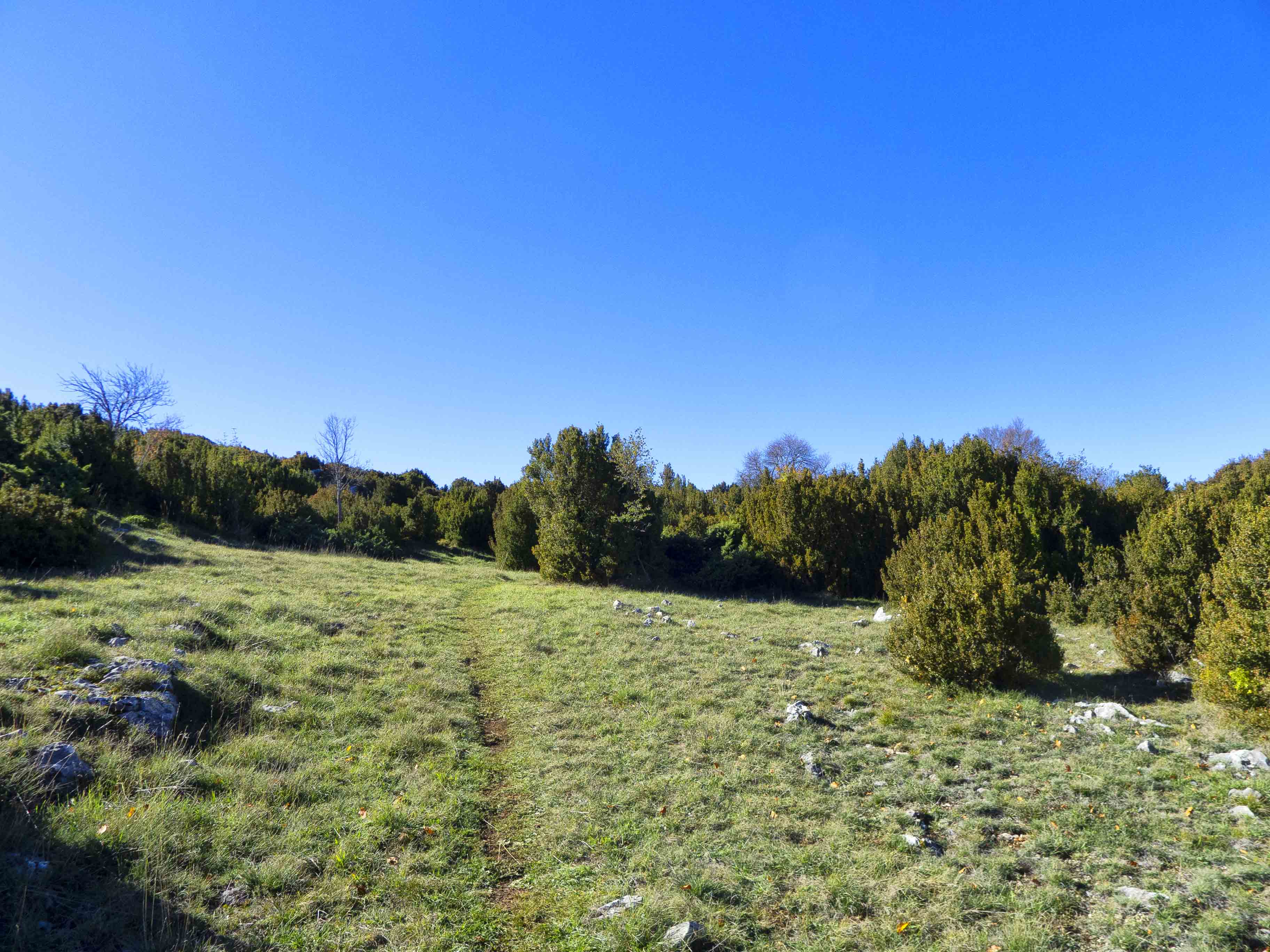 Atravesamos una bonita pradera donde empiezan a aparecer cantos de caliza, antesala del karst que ocupa enteramente la cumbre de la montaña.