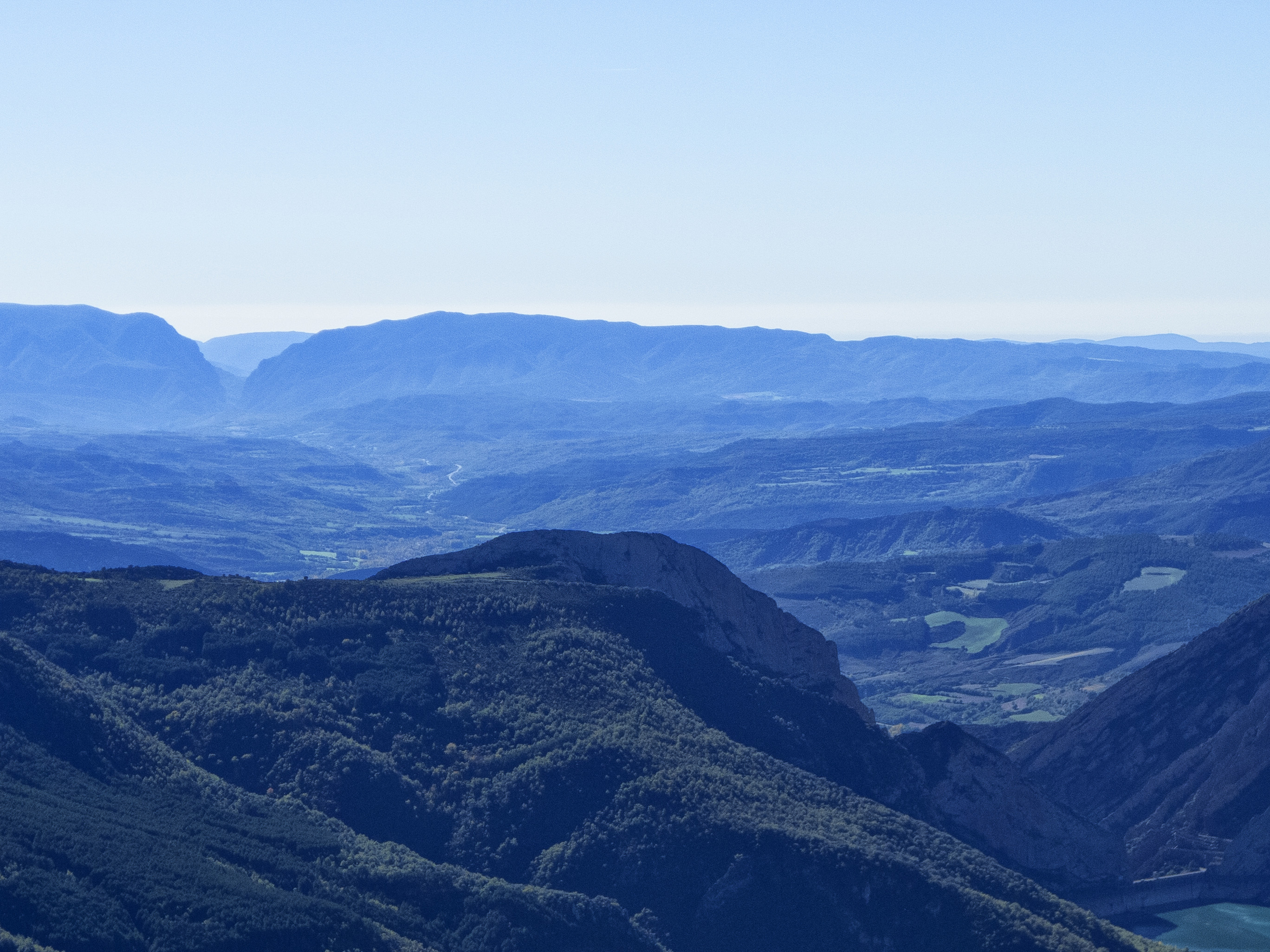 Hacia el este, la cresta sigue en una altura tan similar que nos tapa parte de la vista, aunque podemos ver la gran masa del Boumort a la derecha y, más lejano, el Cadí e incluso las dos puntas del Pedraforca. A la izquierda, en el Pallars, la blanca cúpula de la Torreta de l'Orri.