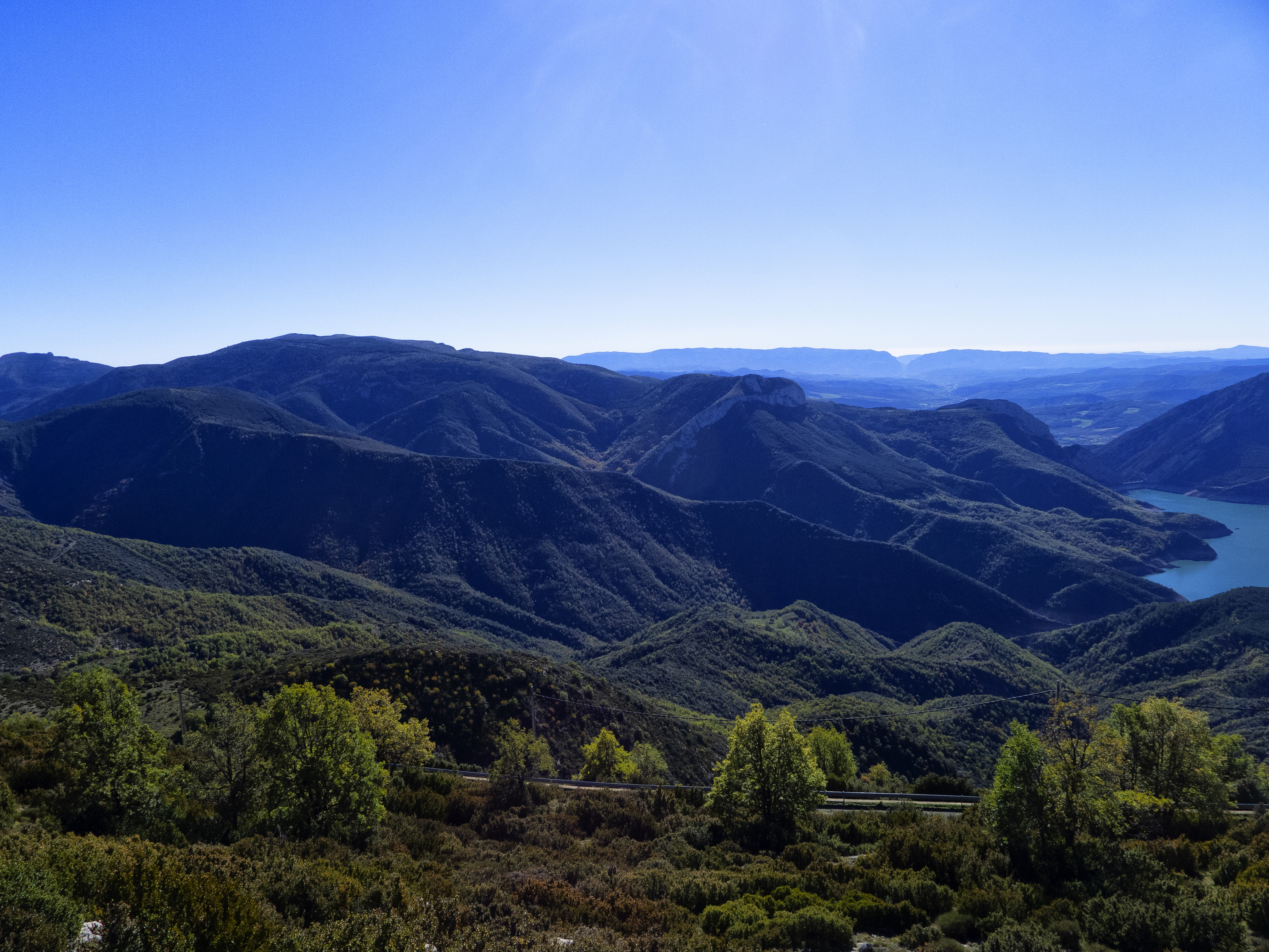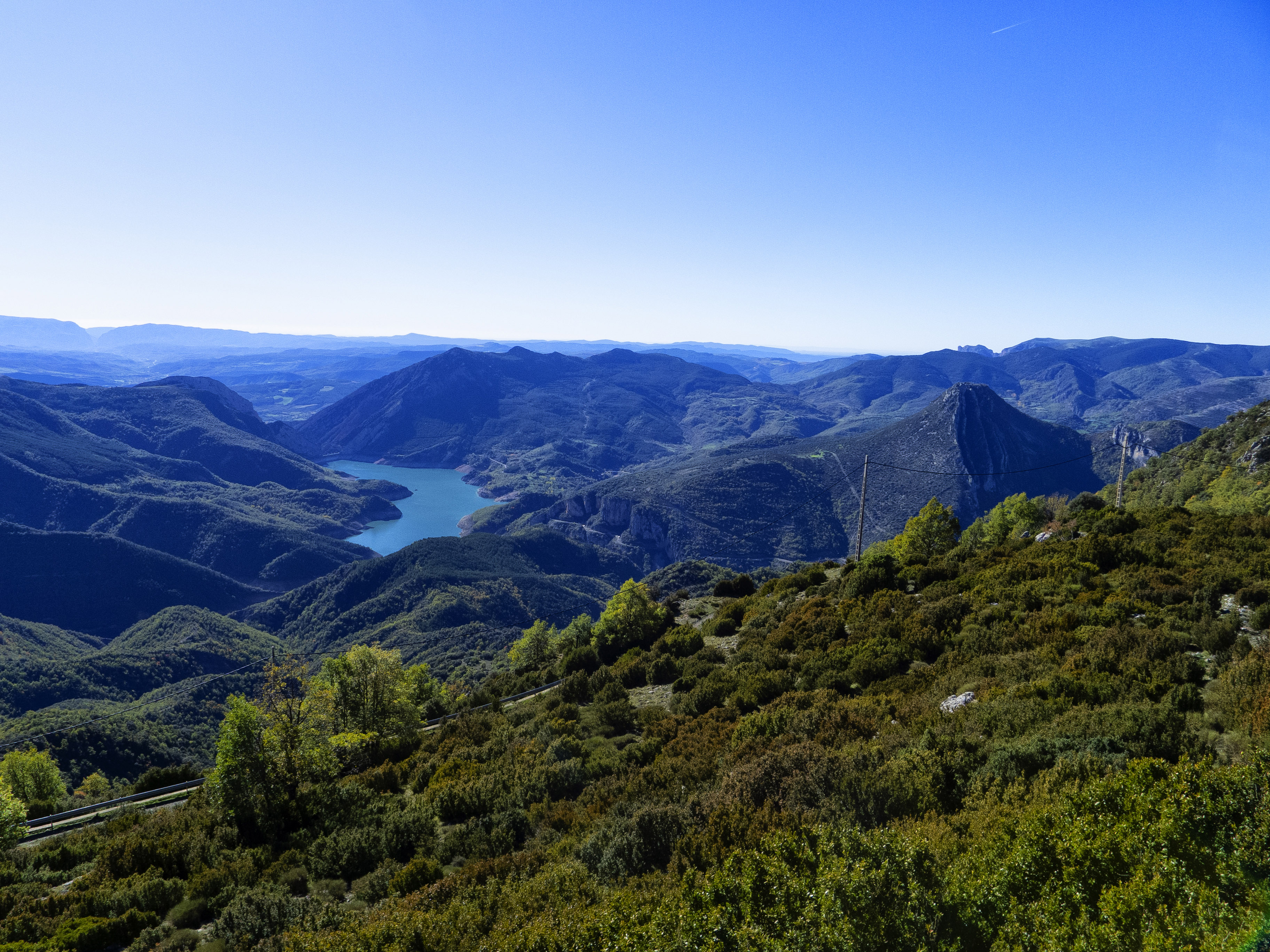 Hacia el sur, Sant Gervàs domina indiscutiblemente la zona. En segundo plano, cuando la Noguera Ribagorçana ya ha superado la presa de Escales...