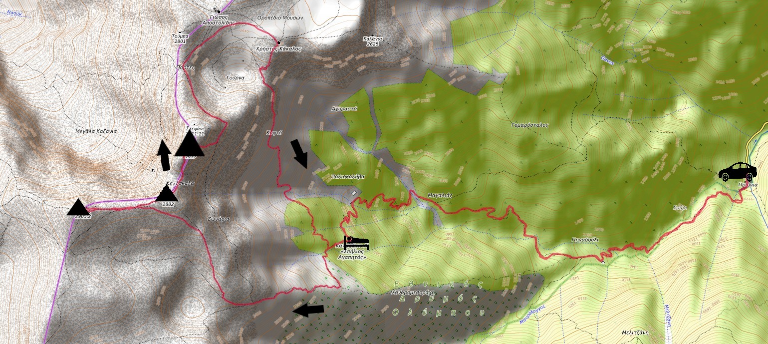 Cerca de este punto encontramos el desvío de la senda que va hacia el Christos Kakkalos por Zonaria, con la que sube hacia el Skolio. Empezamos a subir por la segunda, entrando en una ancha vaguada, mientras que a la primera llegaremos tras el descenso al Mytikas.