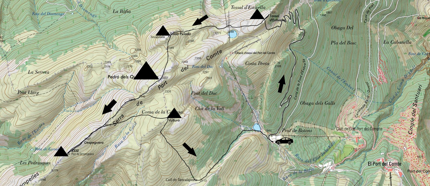 Se puede dividir el macizo en dos partes: la Serra de Querol, que forma su parte sur y que tiene el Puig de les Morreres (2.211) como su máximo exponente, y la Serra del Port del Comte propiamente dicha, donde se encuentran sus cumbres más elevadas, coronando el macizo el Pedró dels Quatre Batlles (2.387 m). Aunque la intención inicial era la de unir estas dos sierras en una gran circular, por motivos logísticos al final no fue posible y tuvimos que conformarnos con ascender todas las cumbres de la segunda, cerrando una bonita circular mañanera.