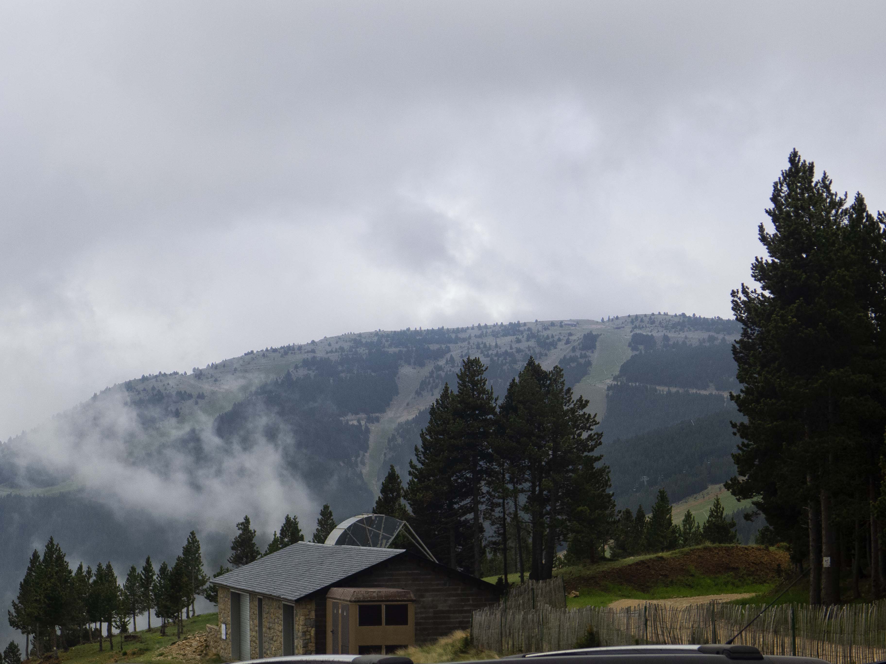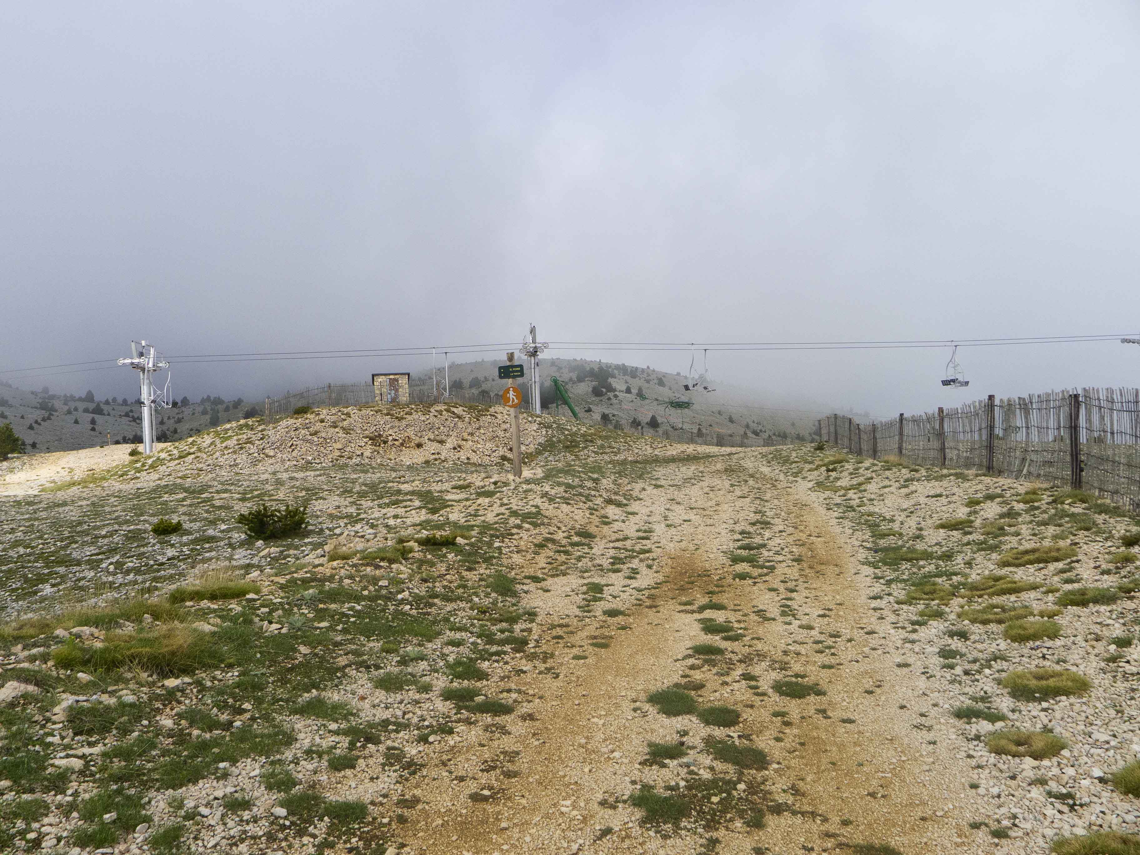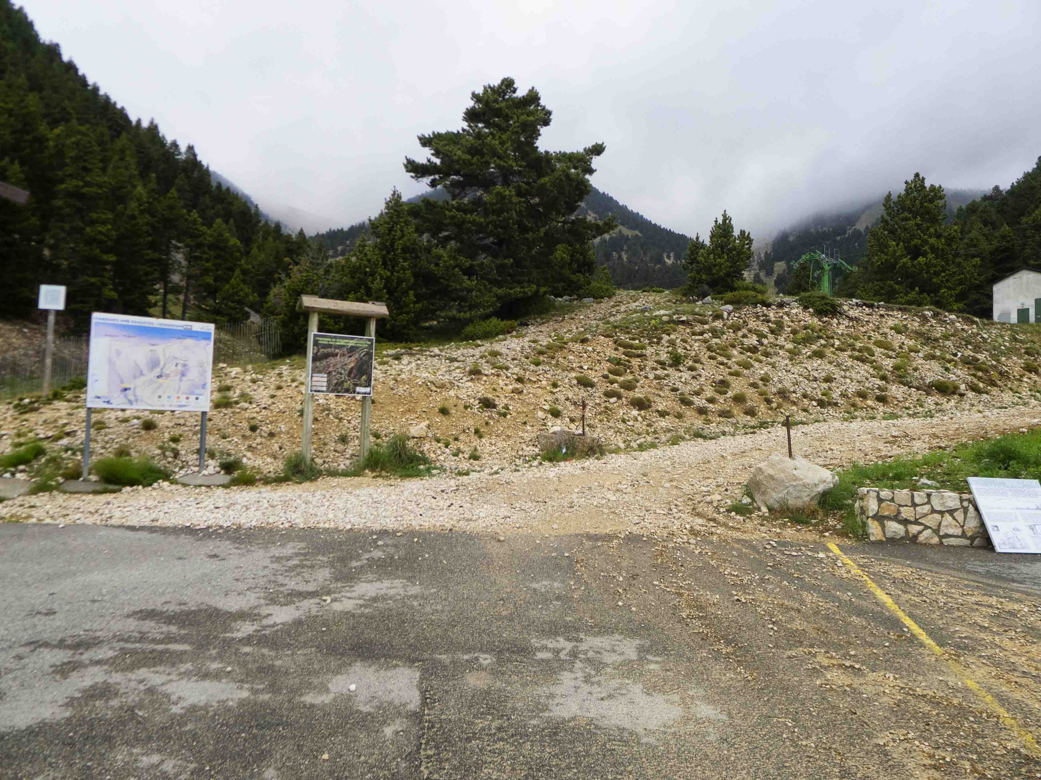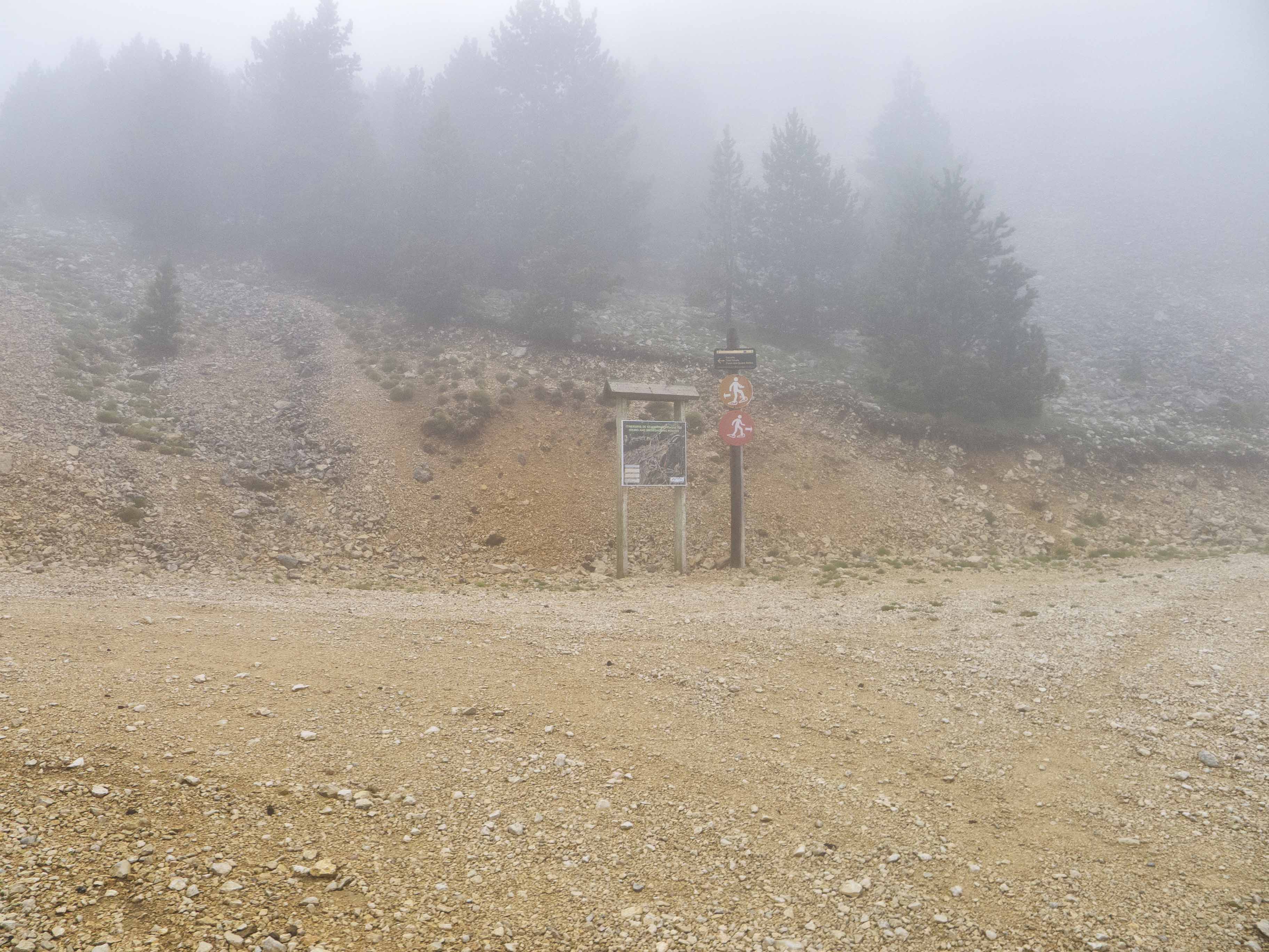 Bajo un cielo encapotado y viéndonos constantemente envueltos entre nieblas, ya vemos que hoy va a ser un día bastante malo en cuanto a visibilidad. Empezamos nuestra andadura en el parking d'Estivella, el más alto de la estación, situado antes de una gran balsa. Tomamos una pista que sale del mismo aparcamiento.