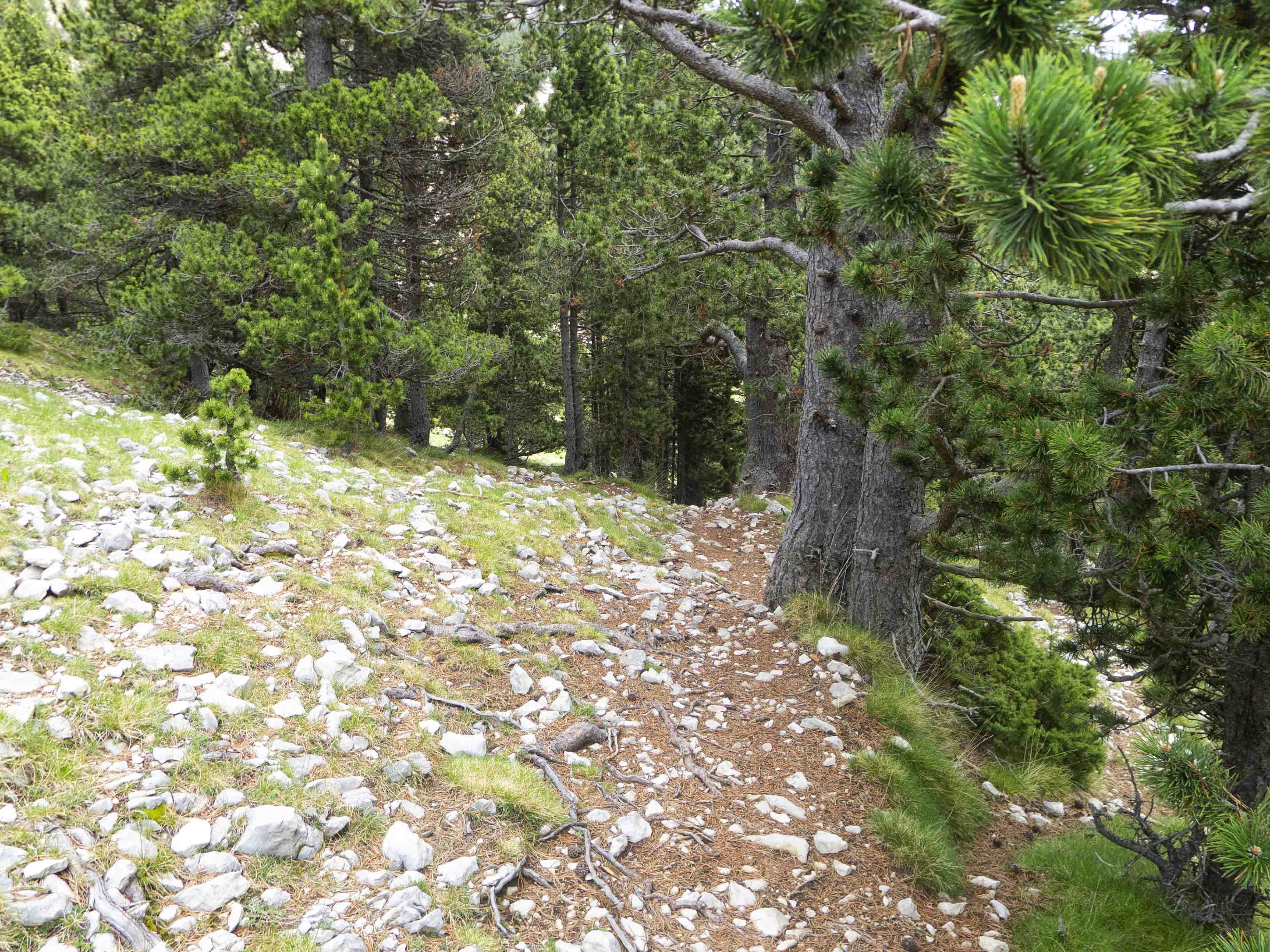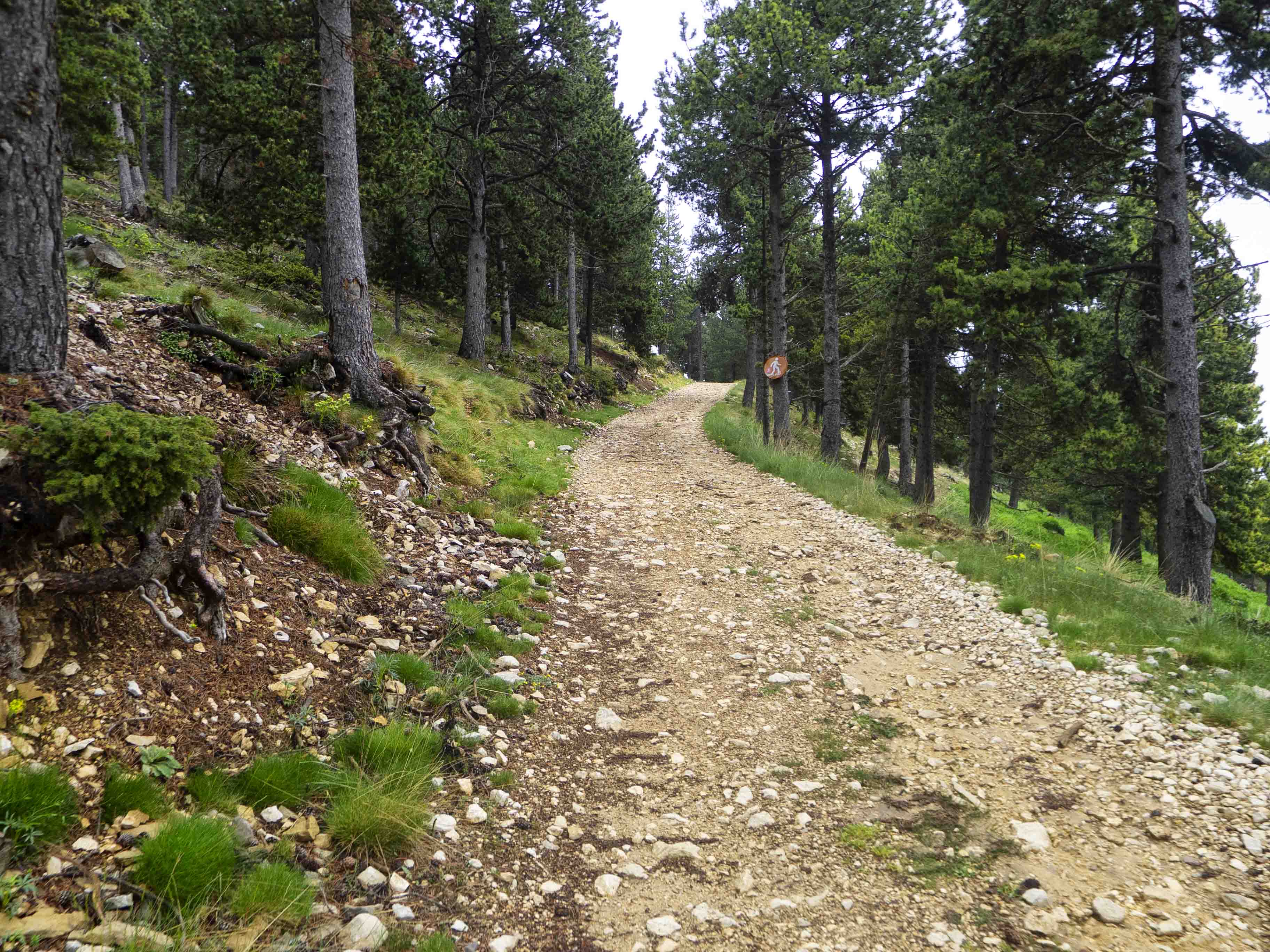Un buen sendero desciende entre el bosque de abetos, perdiendo cómodamente altura hasta que...