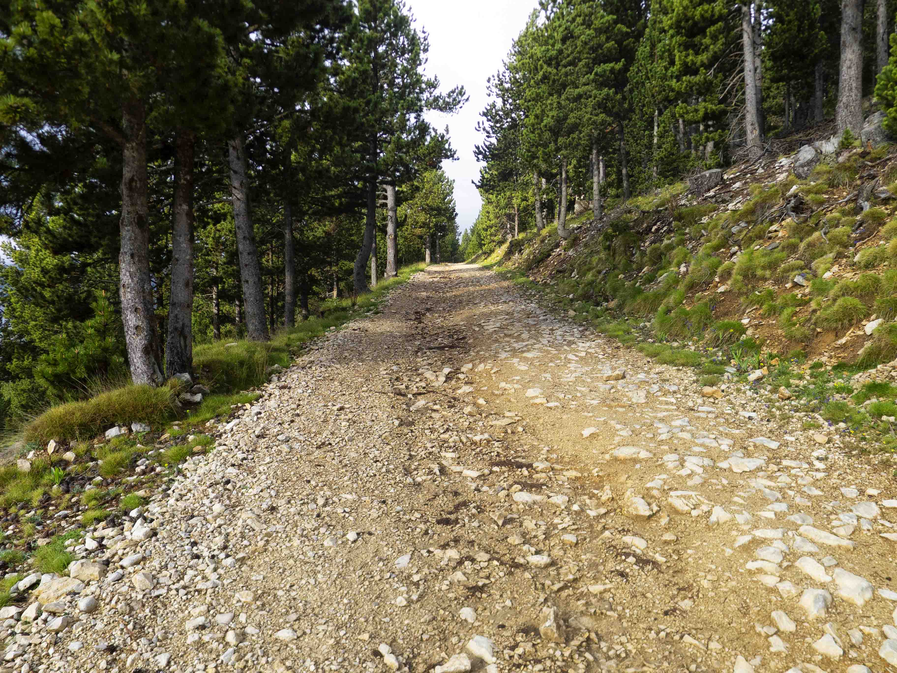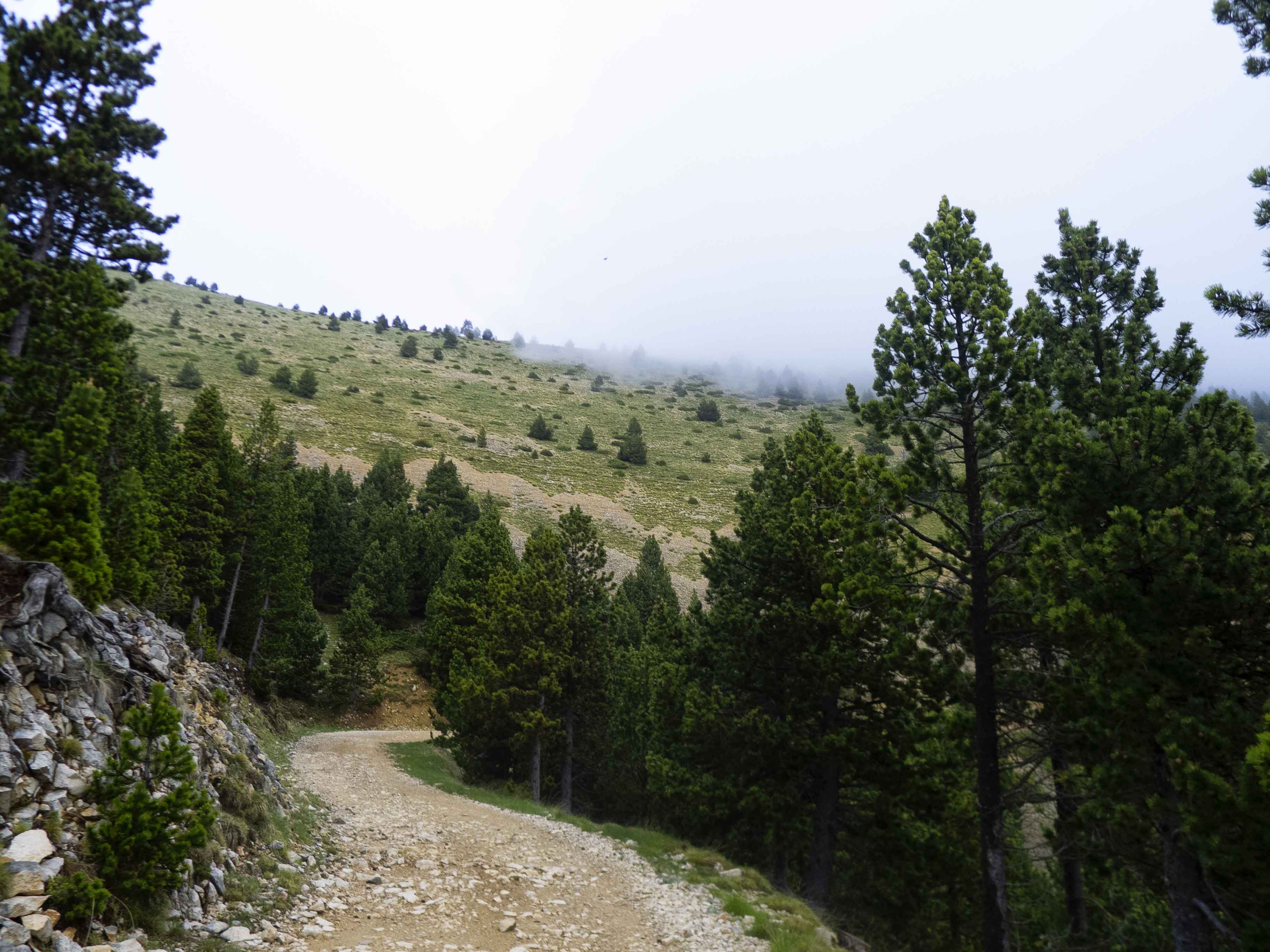 Tras el descanso, volvemos a la pista para encaminarnos a la cumbre más occidental del Port del Comte, la Gespeguera, de la que nos separan casi dos kilómetros en línea recta. La pista desciende suavemente del Pedró, mientras vemos como las nieblas se van retirando hacia el norte, dándonos cierta visión de lo que llevamos hecho.