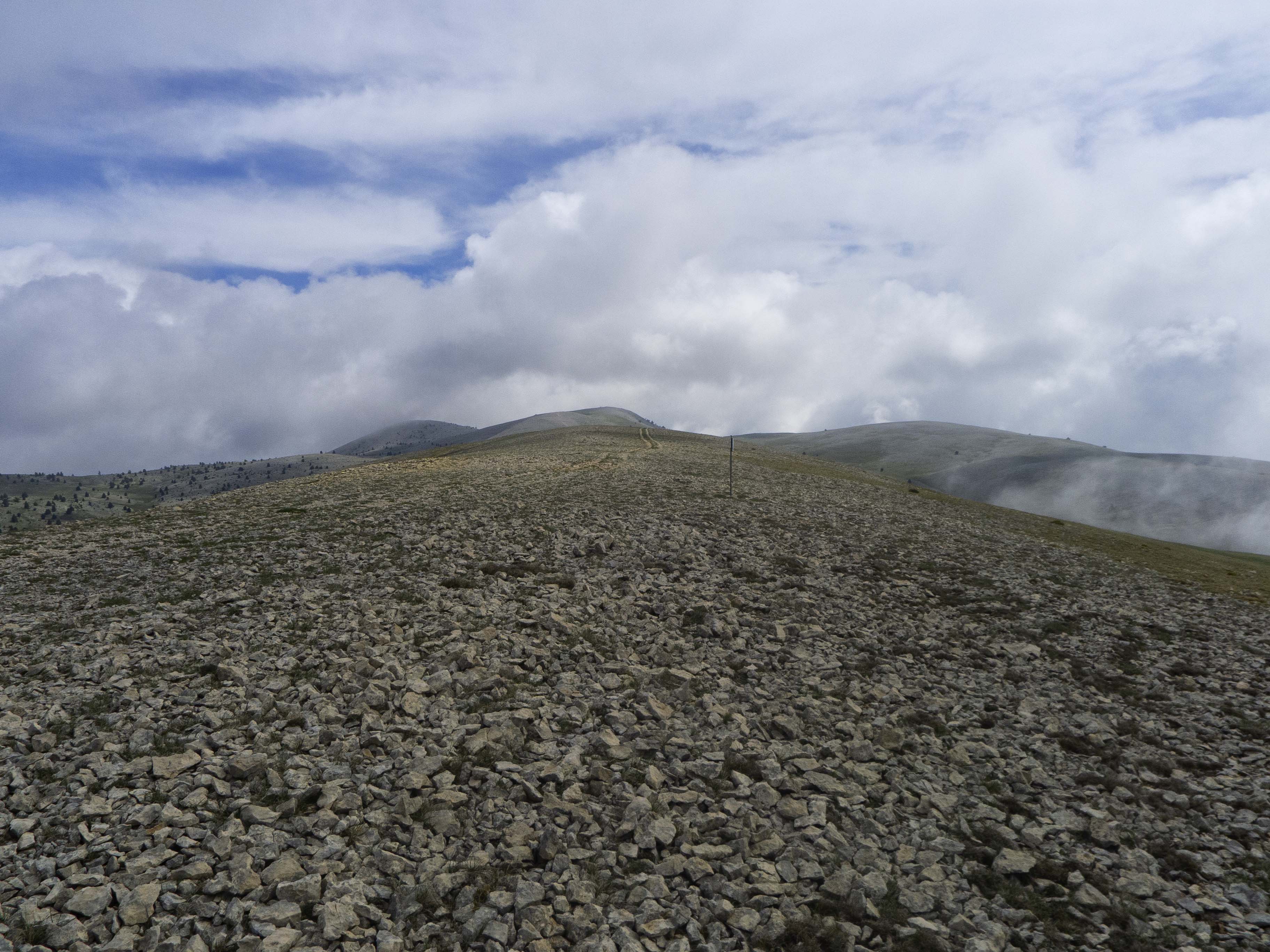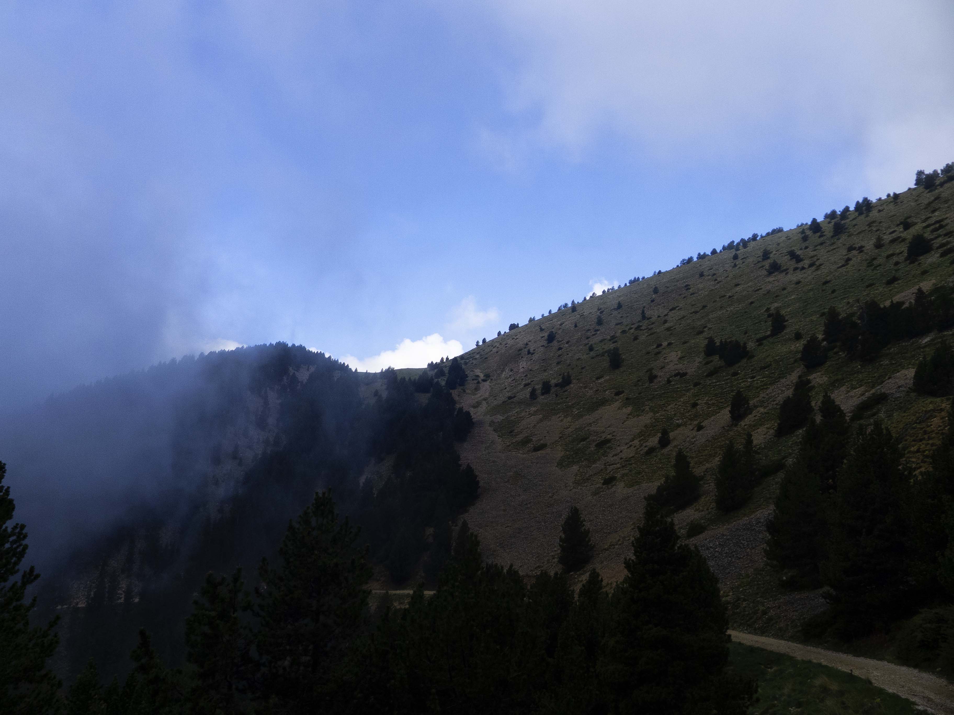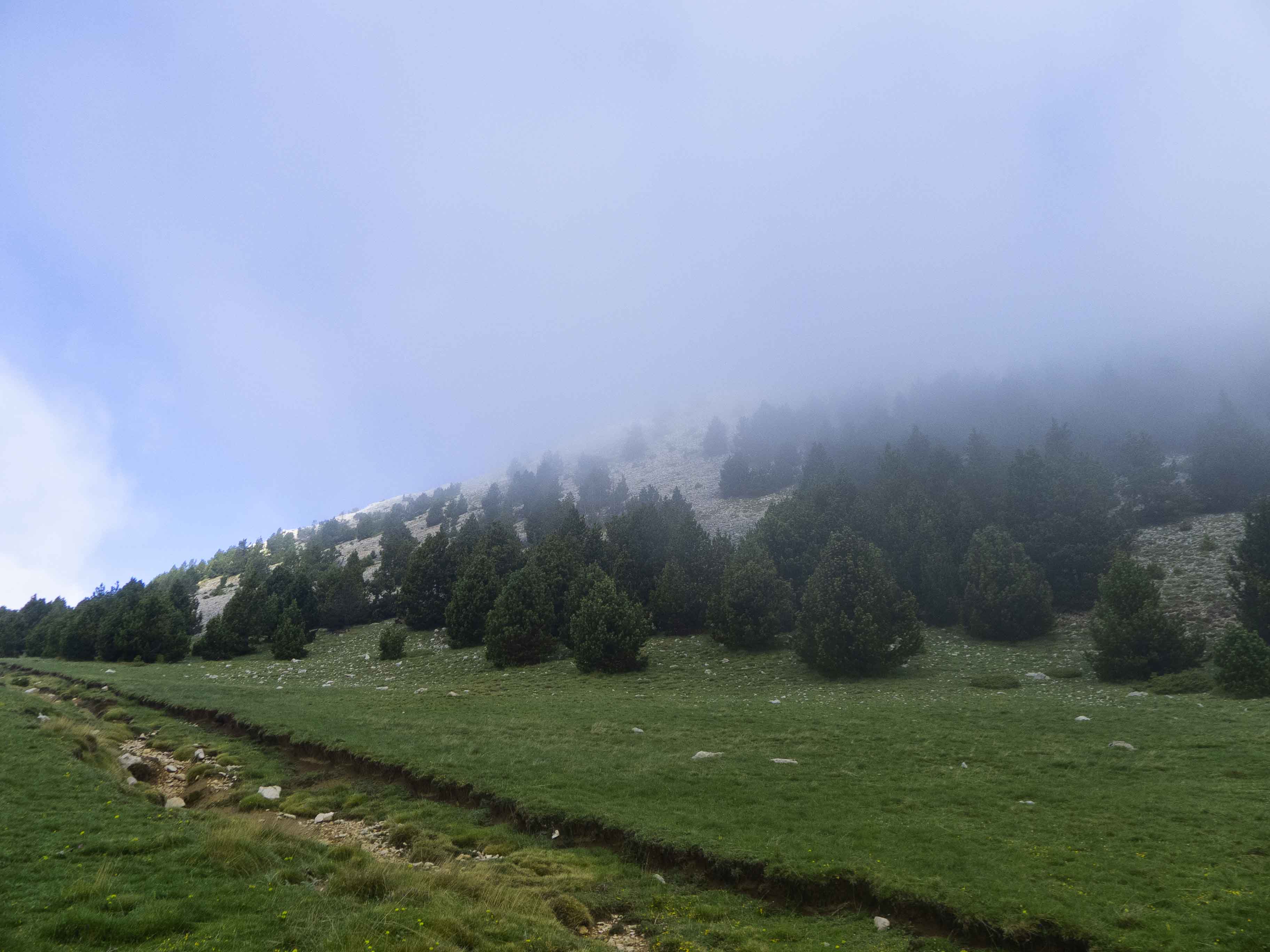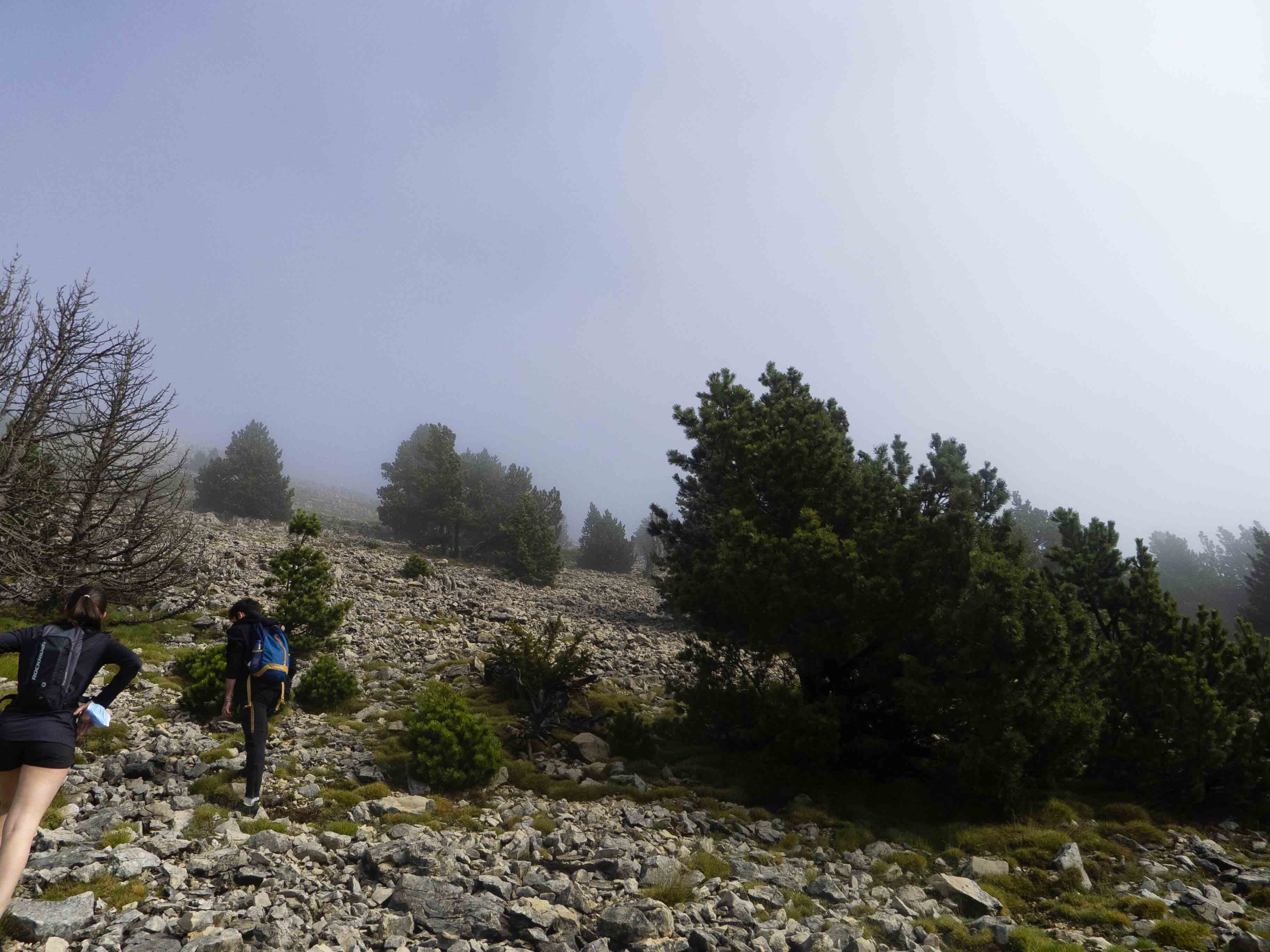 La niebla, algo alta ahora, nos permiten ver la Tossa Pelada delante nuestro, a la que llegamos siguiendo un caminillo que avanza por su lomo este.