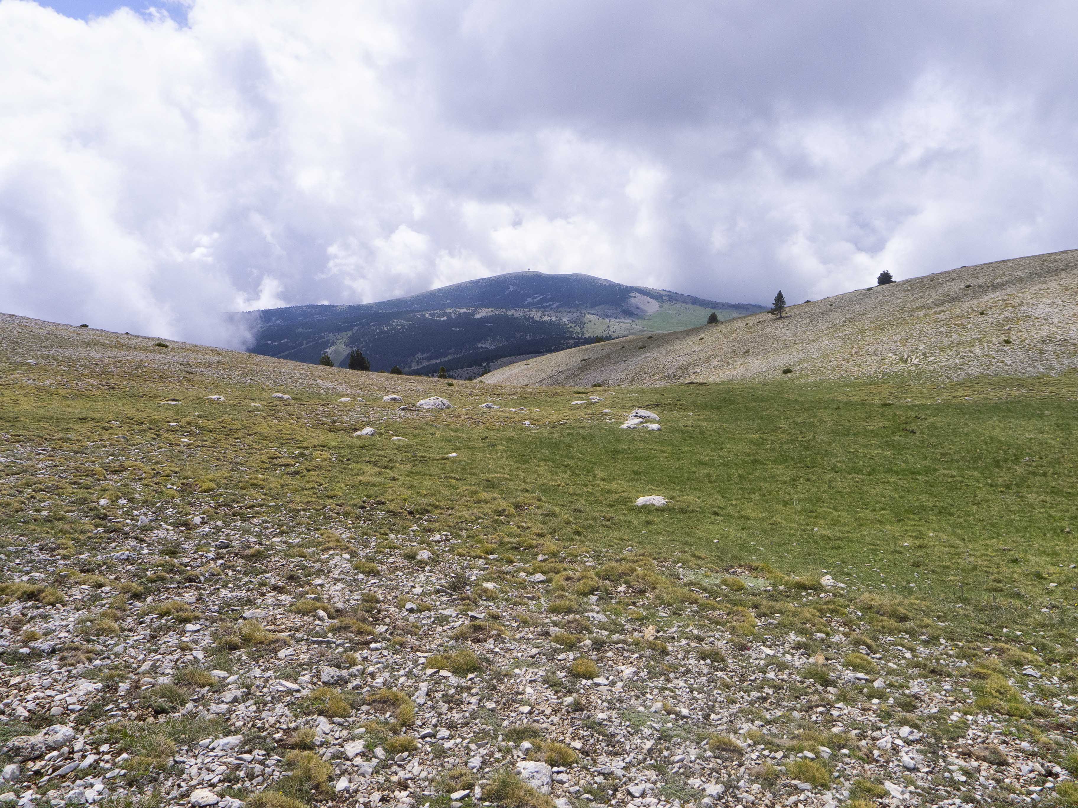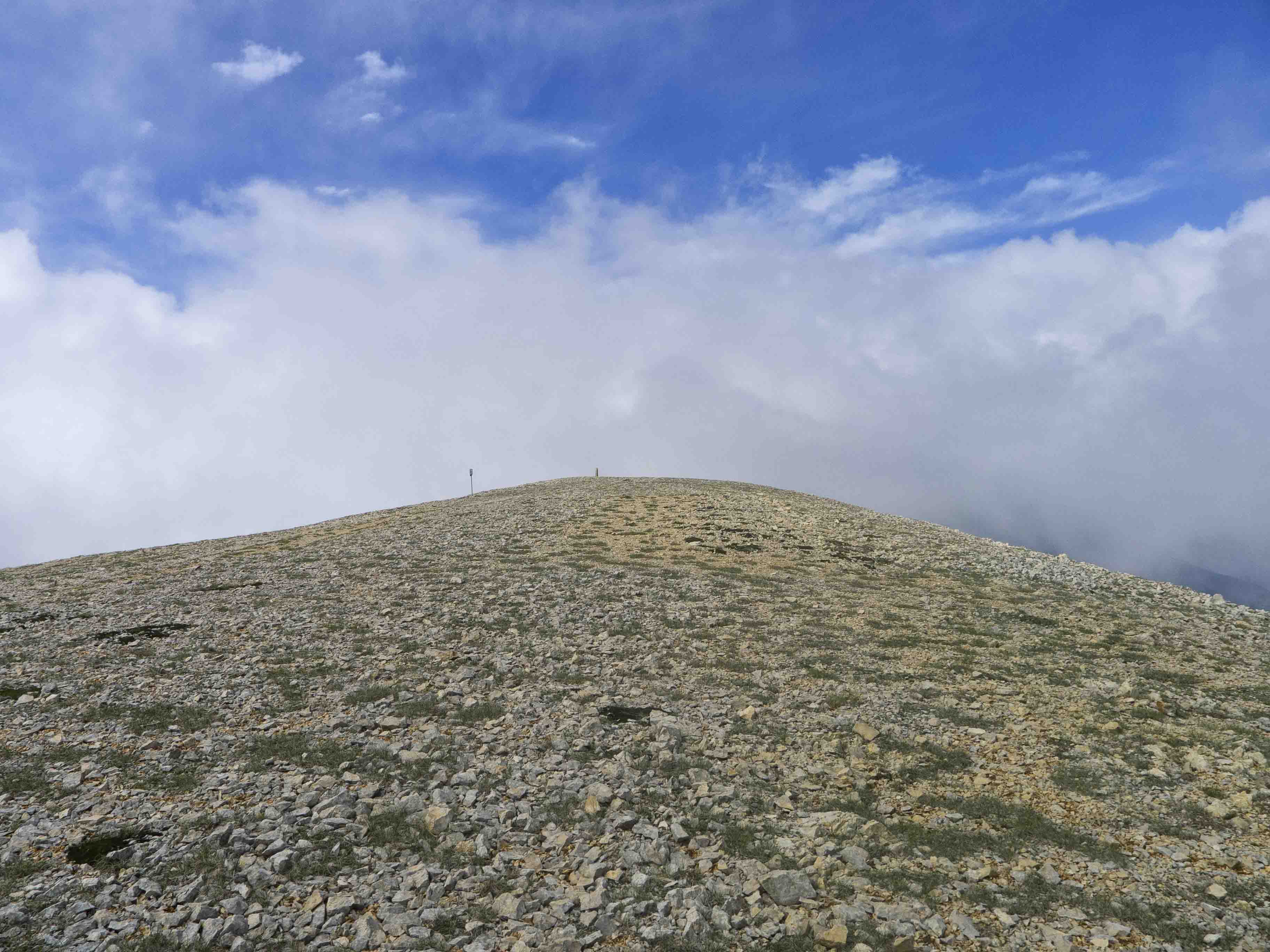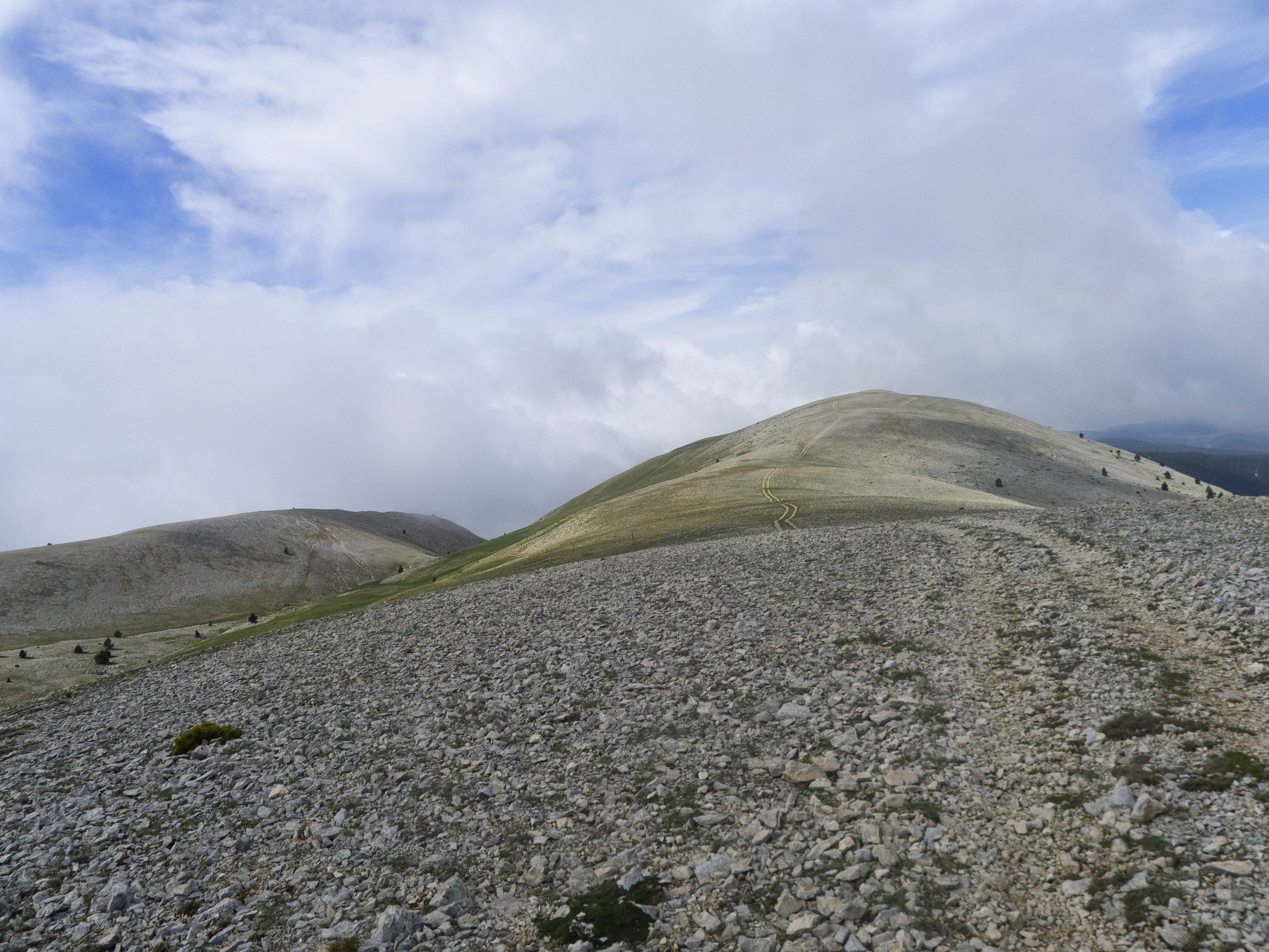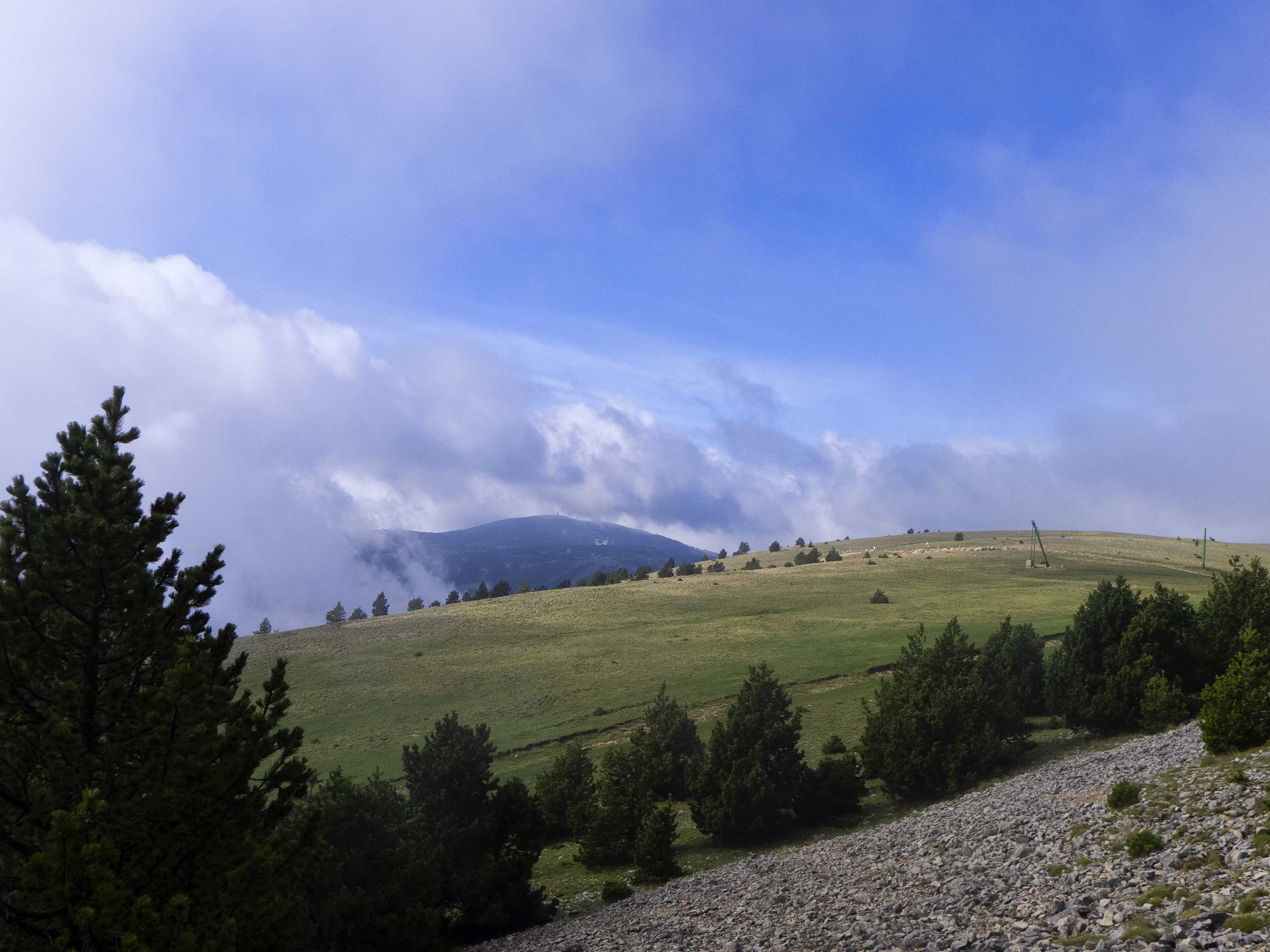 La niebla, algo alta ahora, nos permiten ver la Tossa Pelada delante nuestro, a la que llegamos siguiendo un caminillo que avanza por su lomo este.