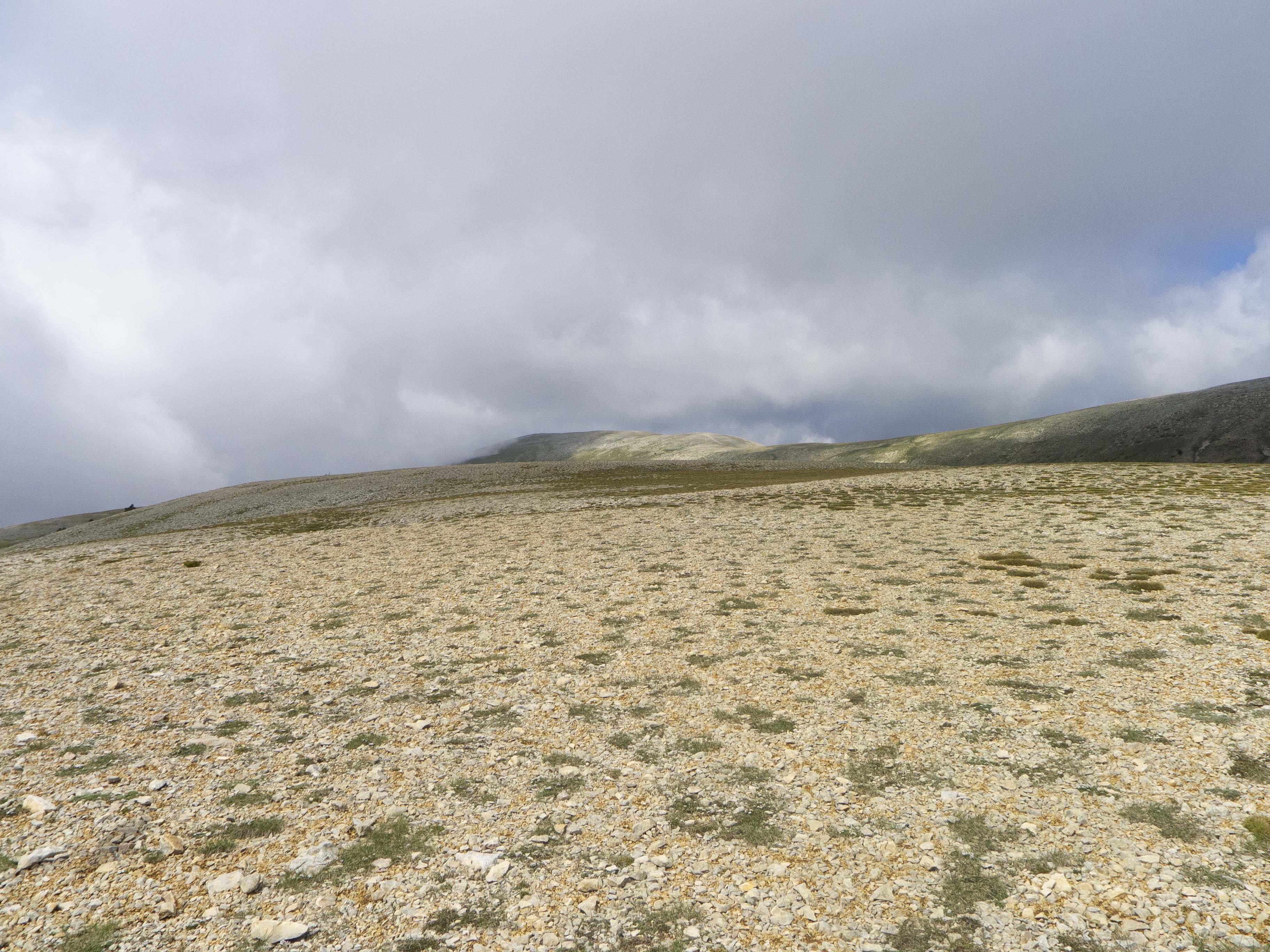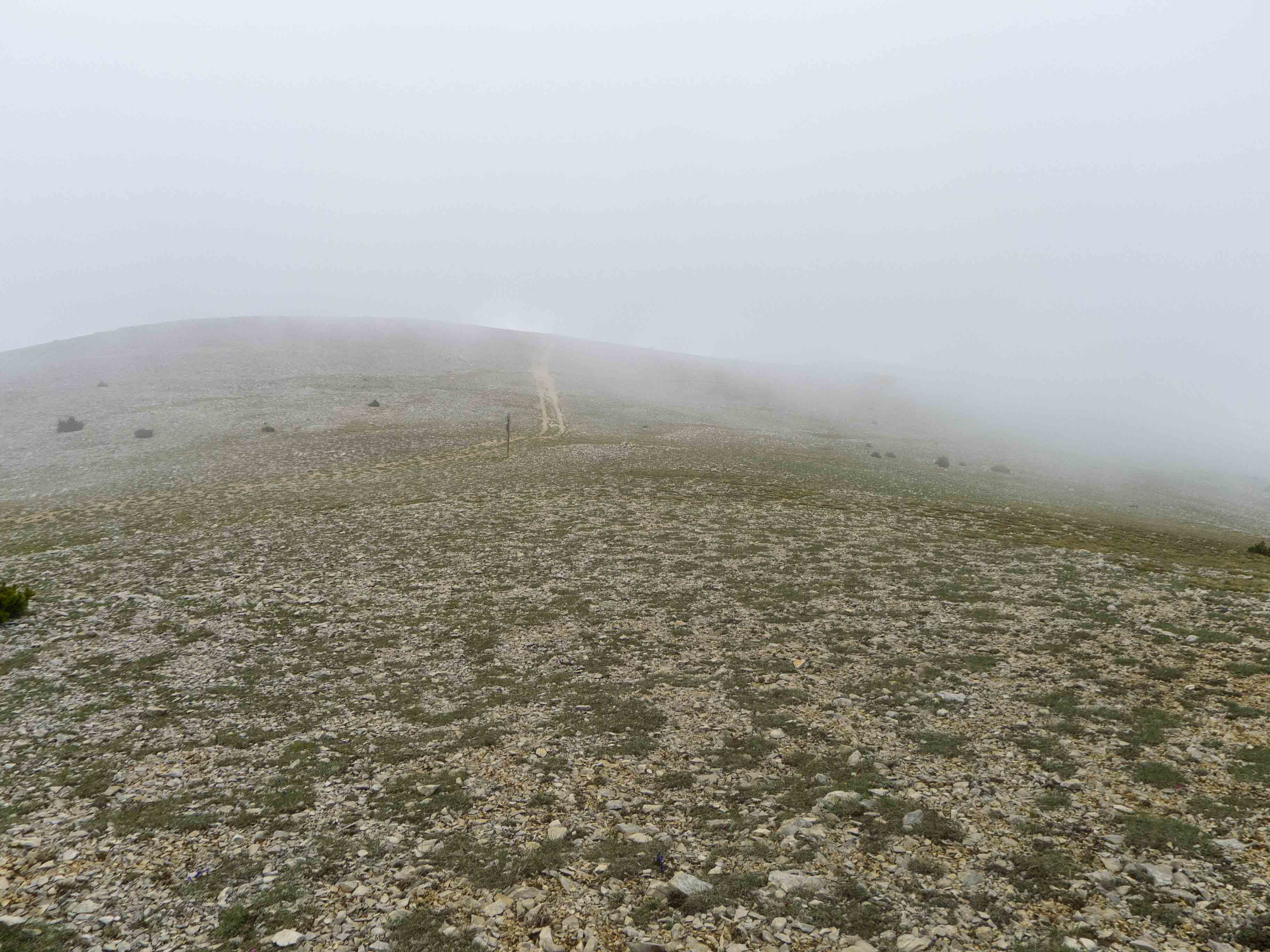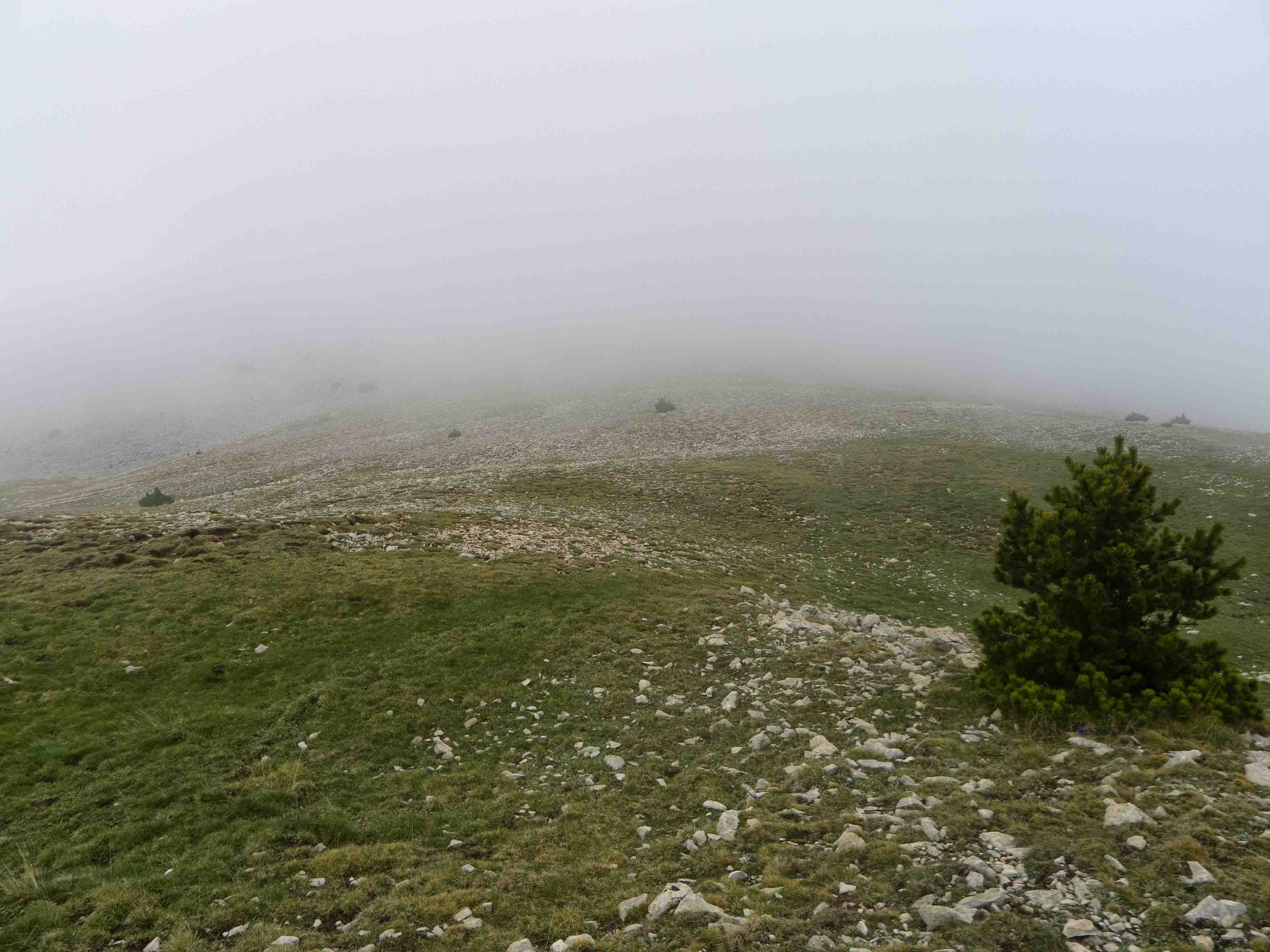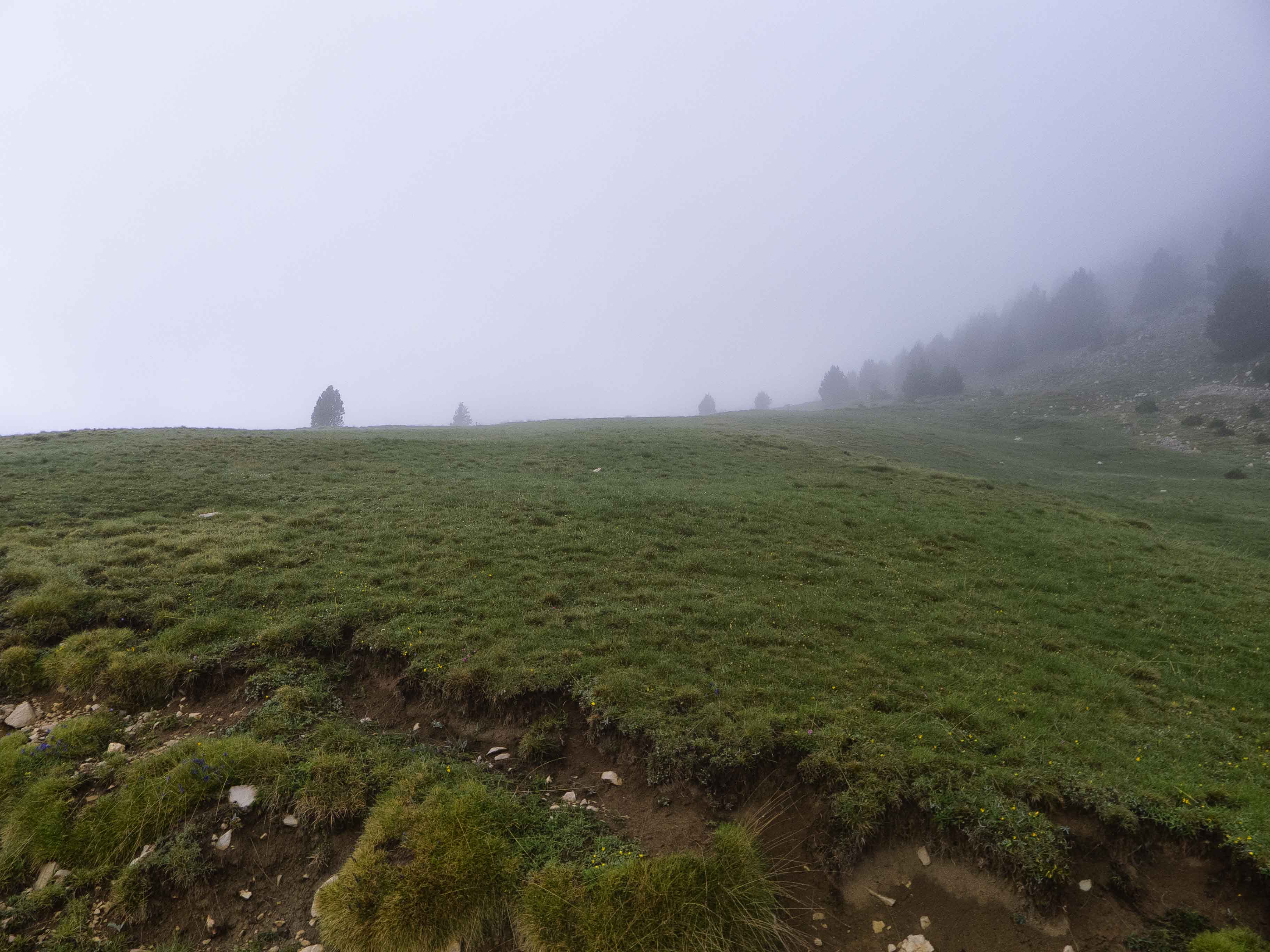 Por terreno algo más herboso descendemos unos treinta metros hacia el collado, que solo intuimos. En estas condiciones de visibilidad, la orientación aquí arriba es muy complicada debido a lo homogéneo del terreno, por lo que para los que visiten por primera vez este sitio recomiendo GPS y prudencia.