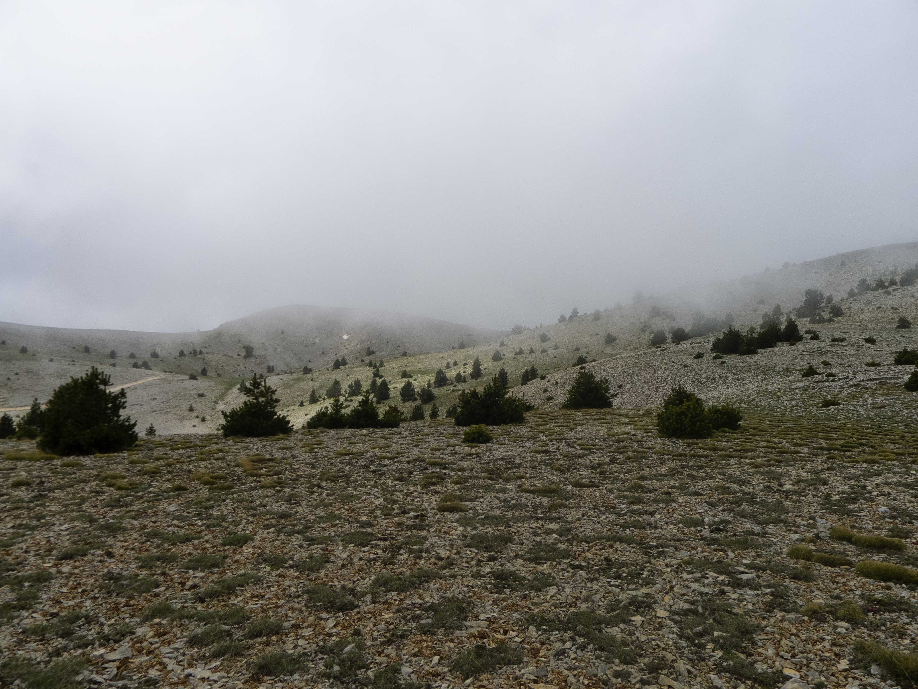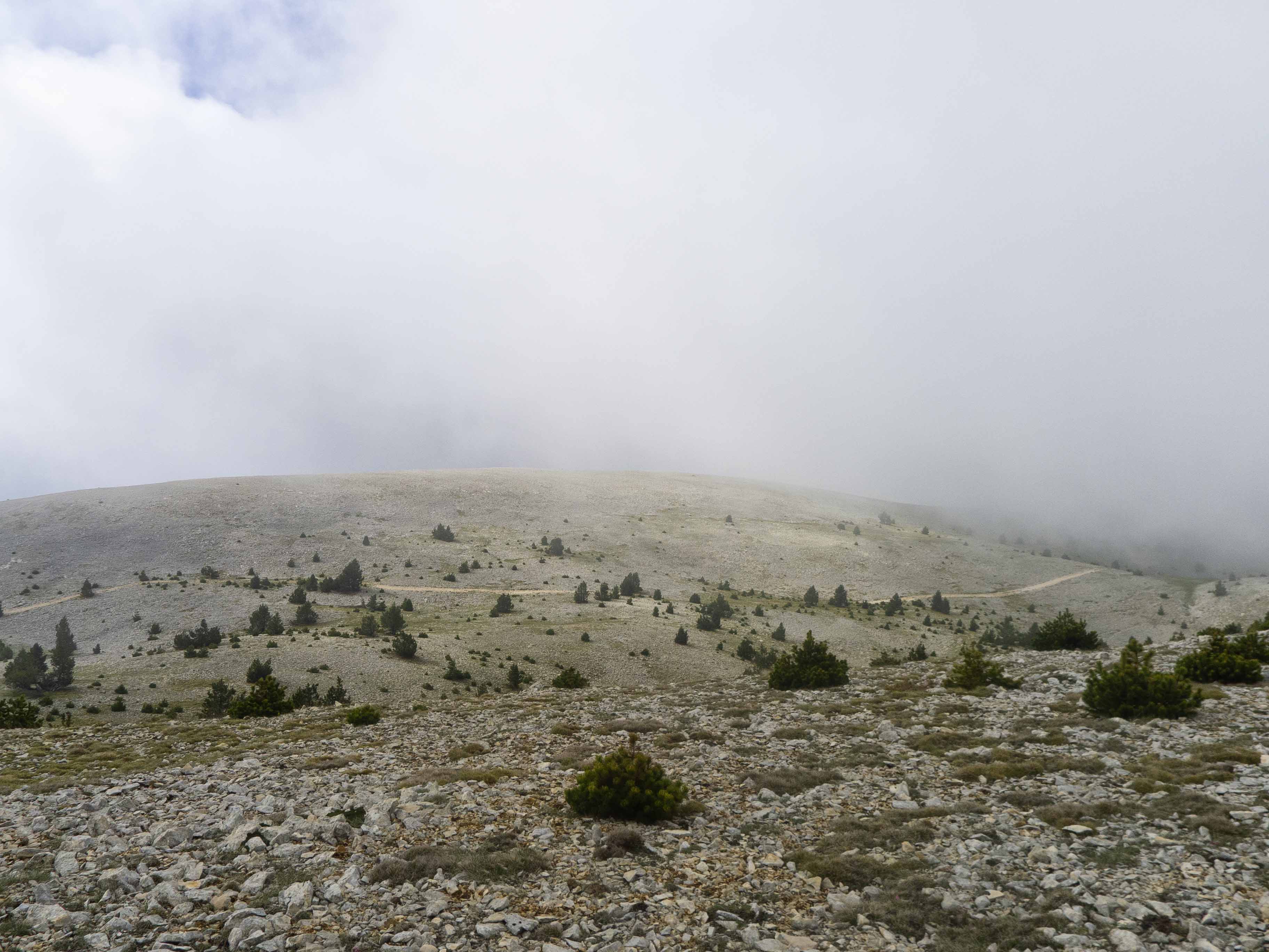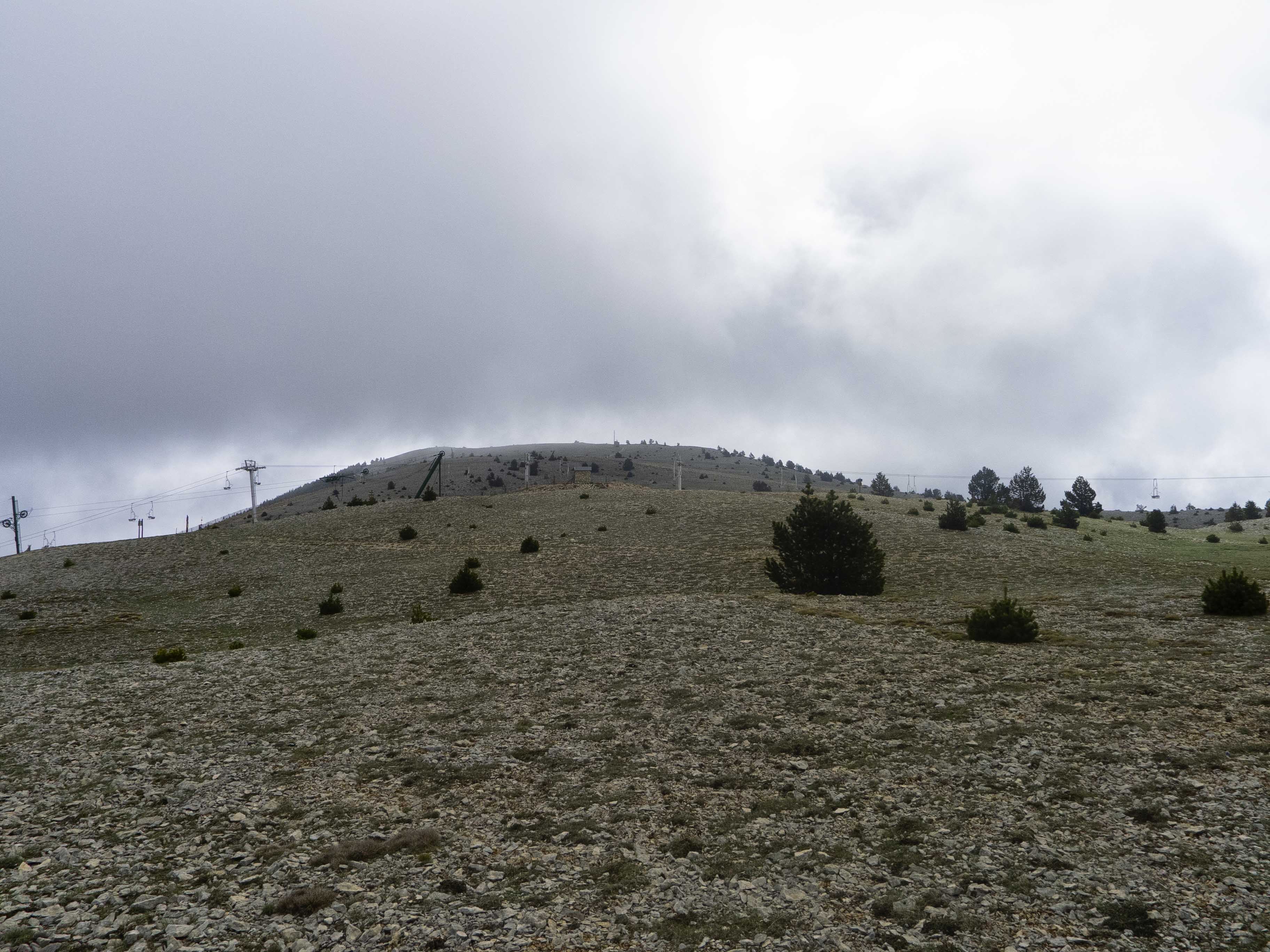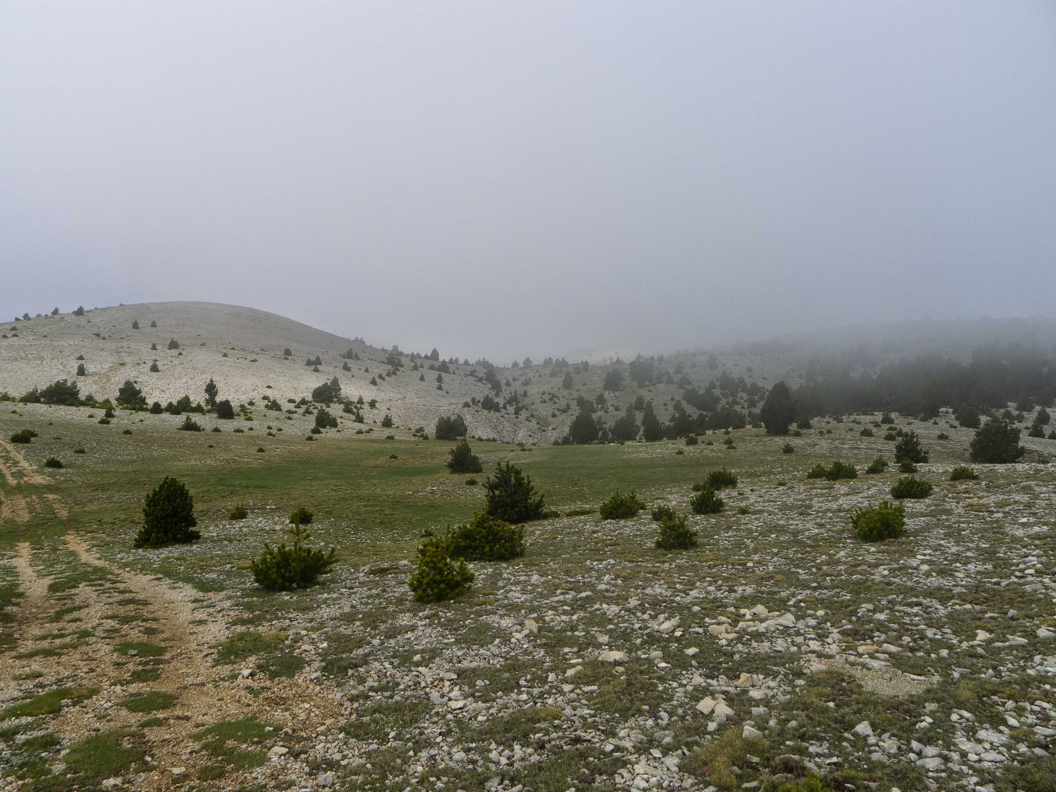 Por terreno algo más herboso descendemos unos treinta metros hacia el collado, que solo intuimos. En estas condiciones de visibilidad, la orientación aquí arriba es muy complicada debido a lo homogéneo del terreno, por lo que para los que visiten por primera vez este sitio recomiendo GPS y prudencia.