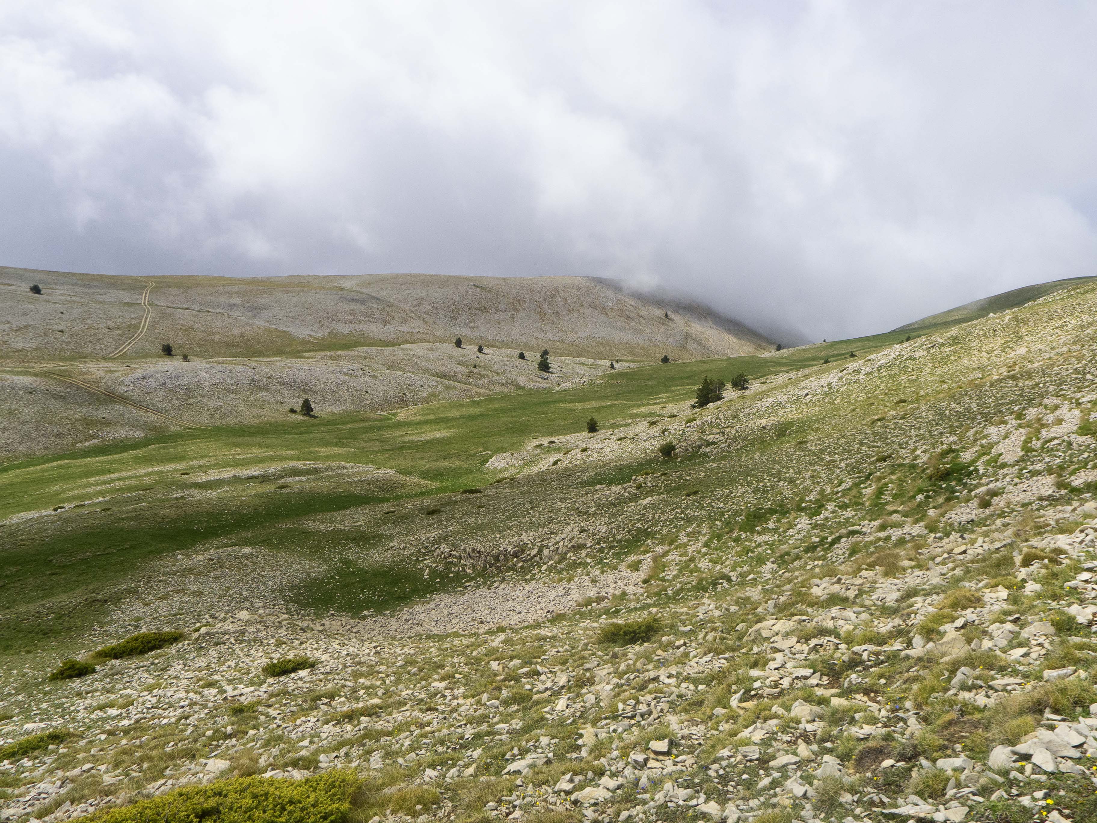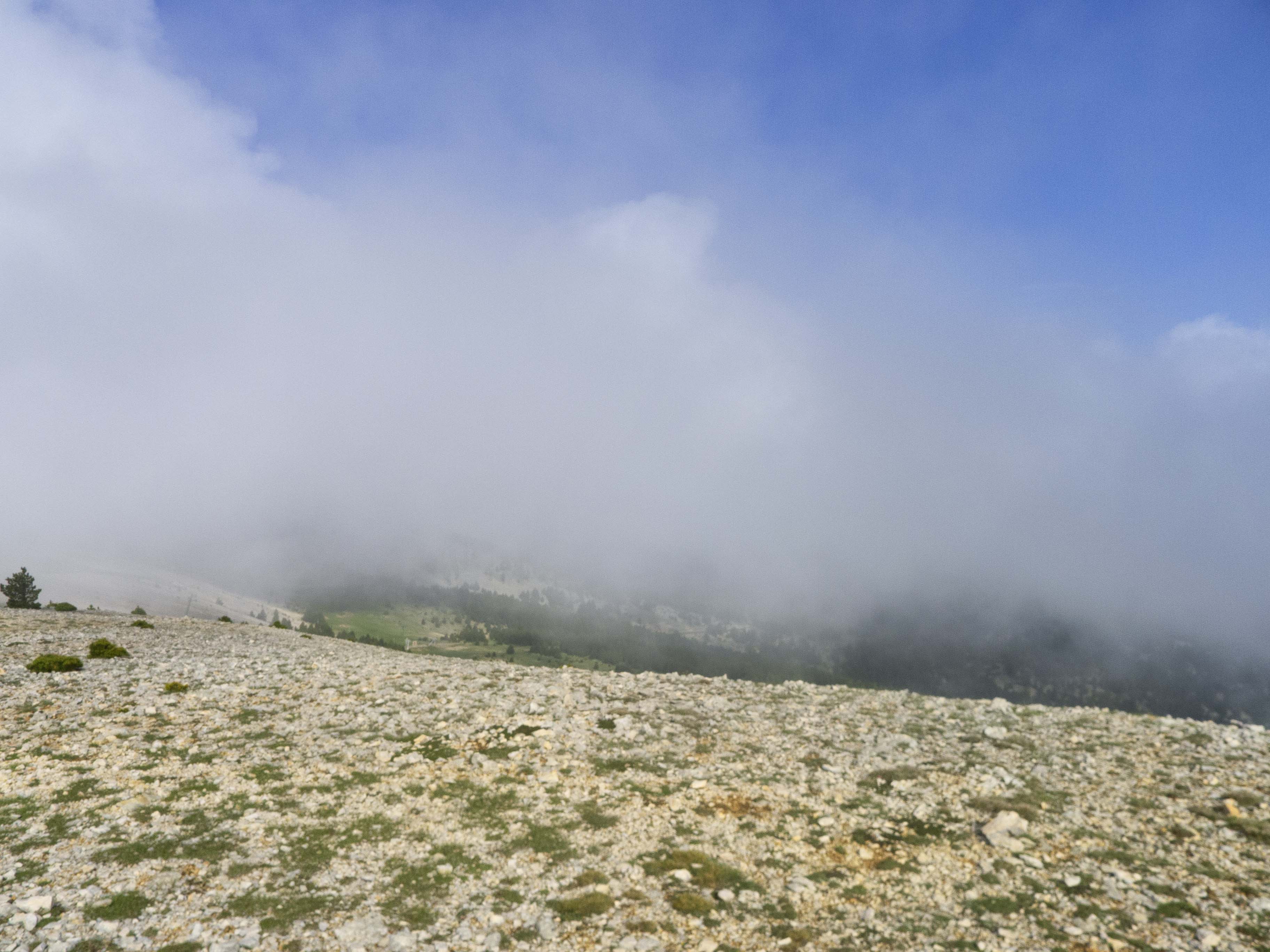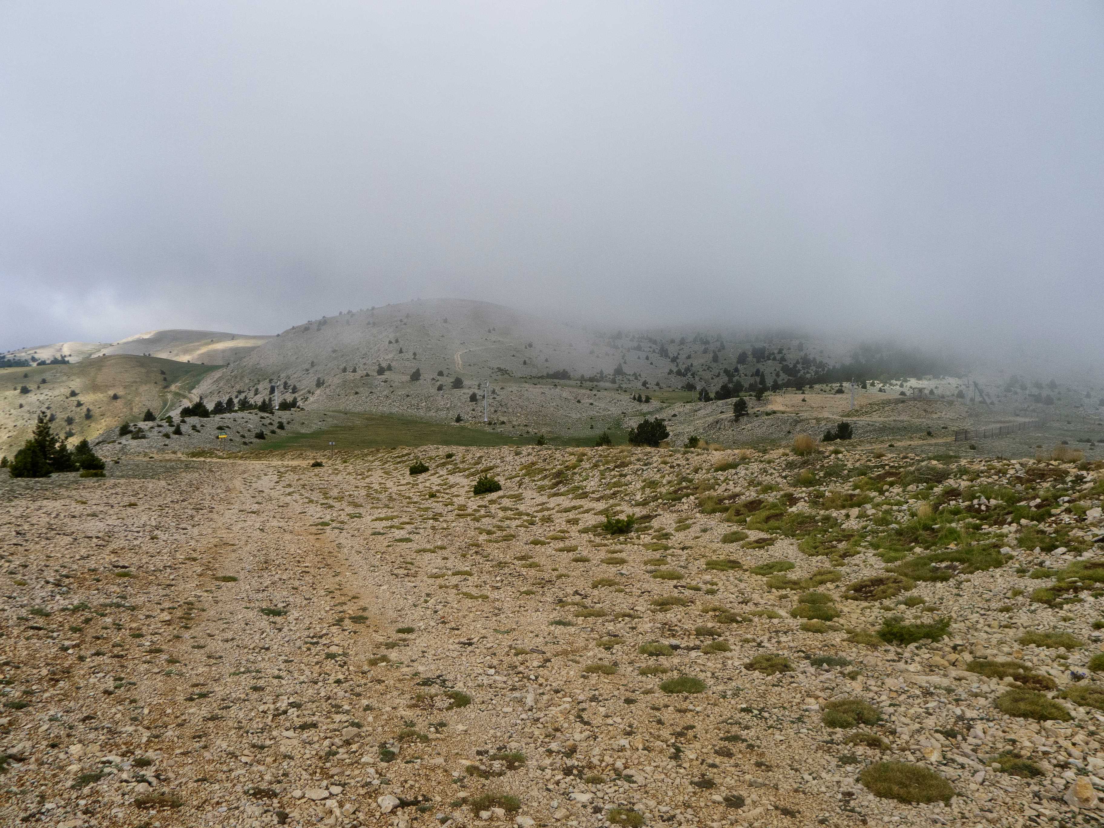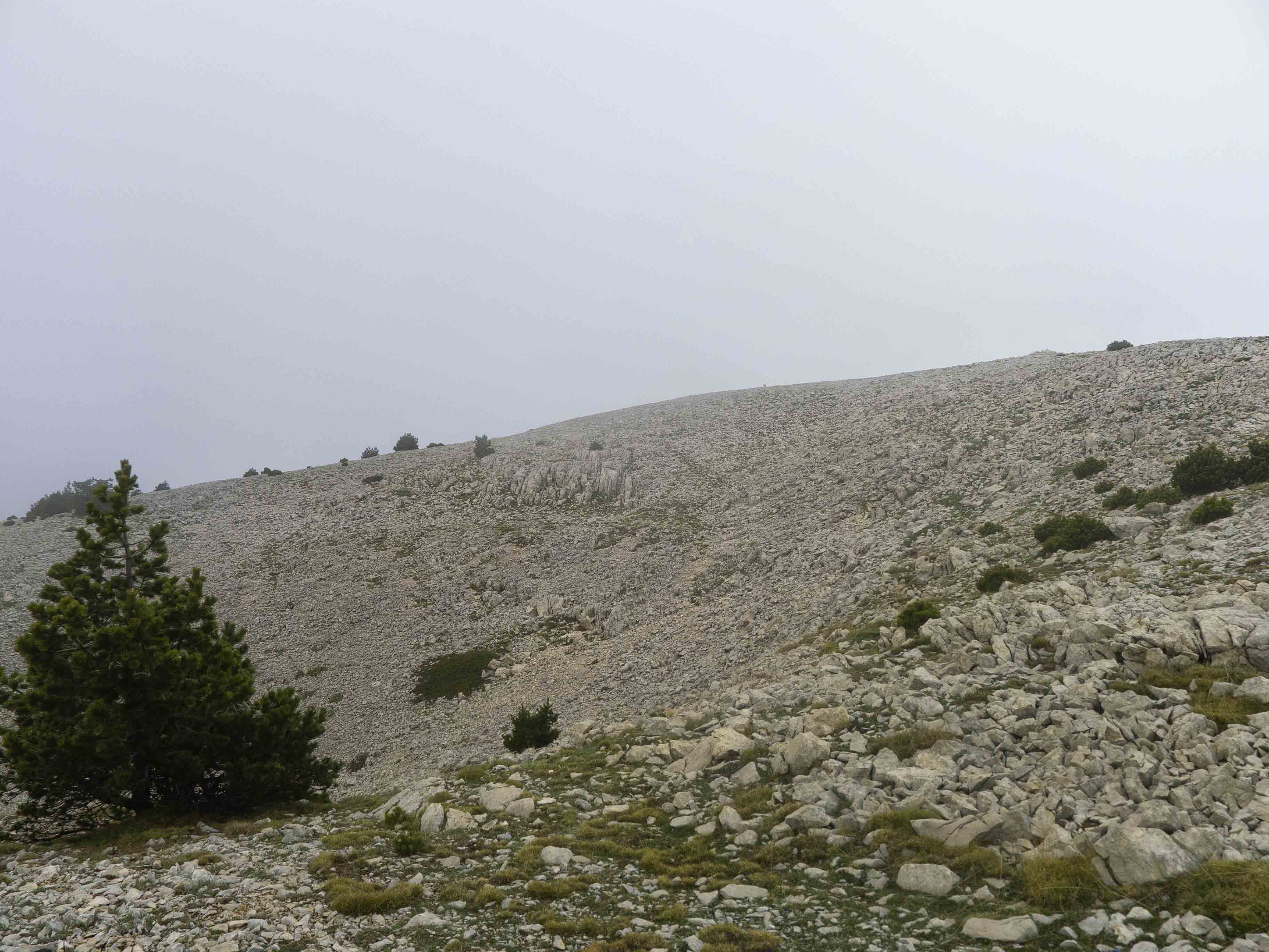 Por terreno algo más herboso descendemos unos treinta metros hacia el collado, que solo intuimos. En estas condiciones de visibilidad, la orientación aquí arriba es muy complicada debido a lo homogéneo del terreno, por lo que para los que visiten por primera vez este sitio recomiendo GPS y prudencia.