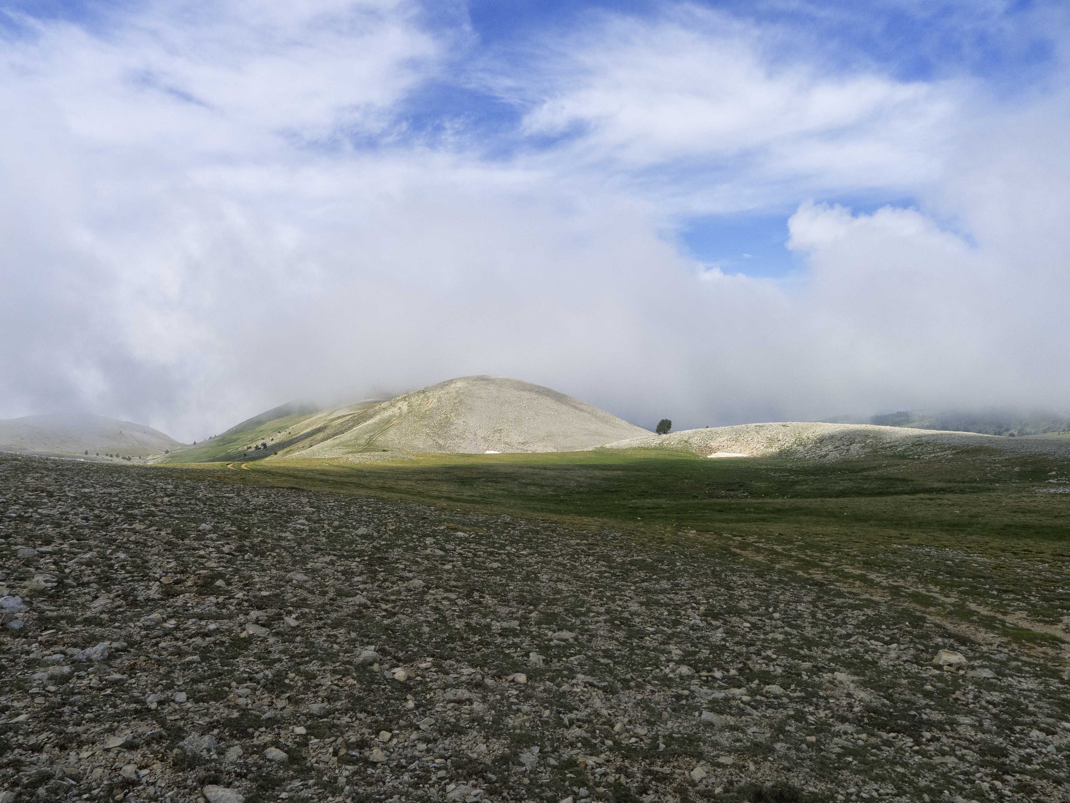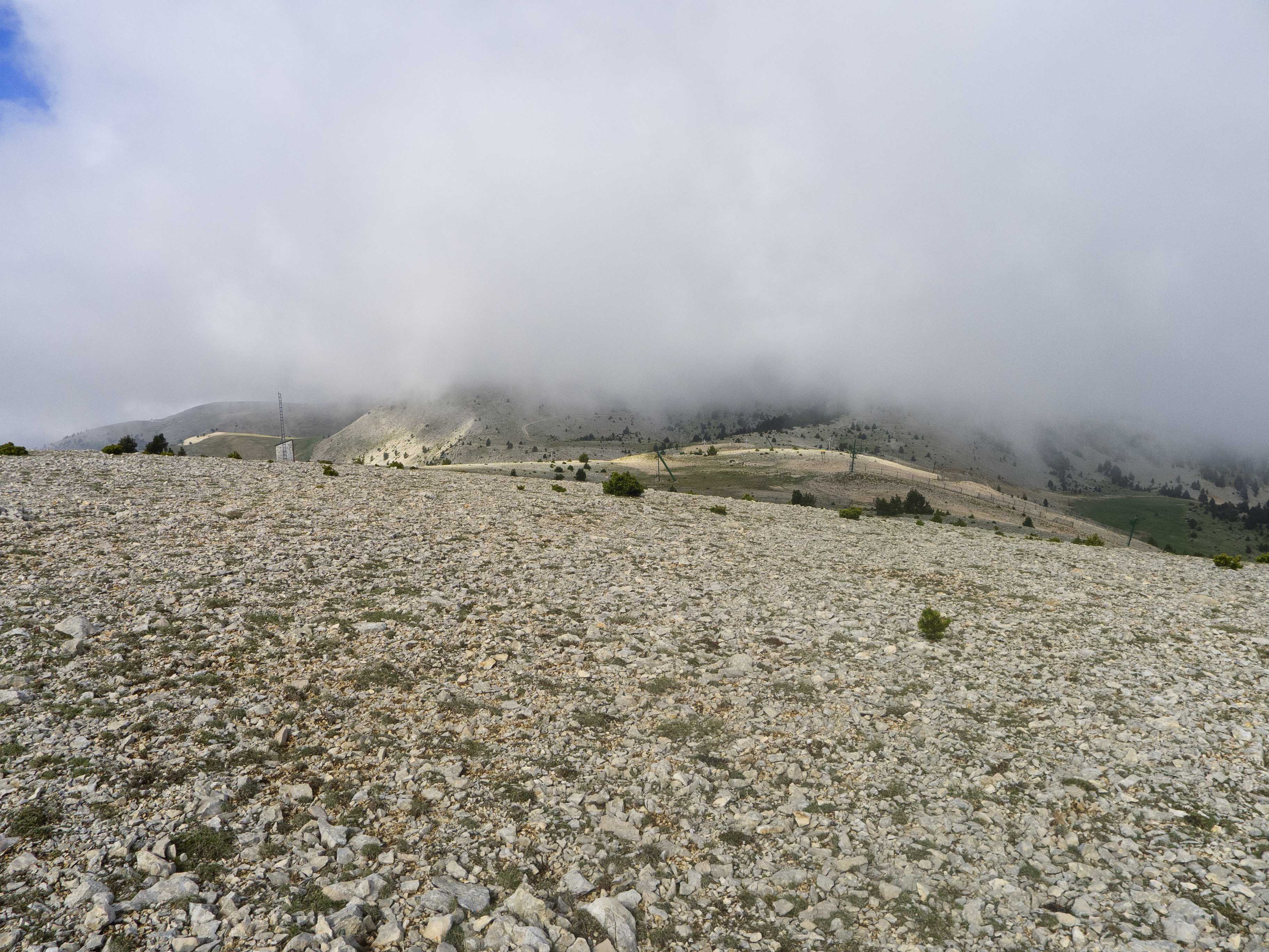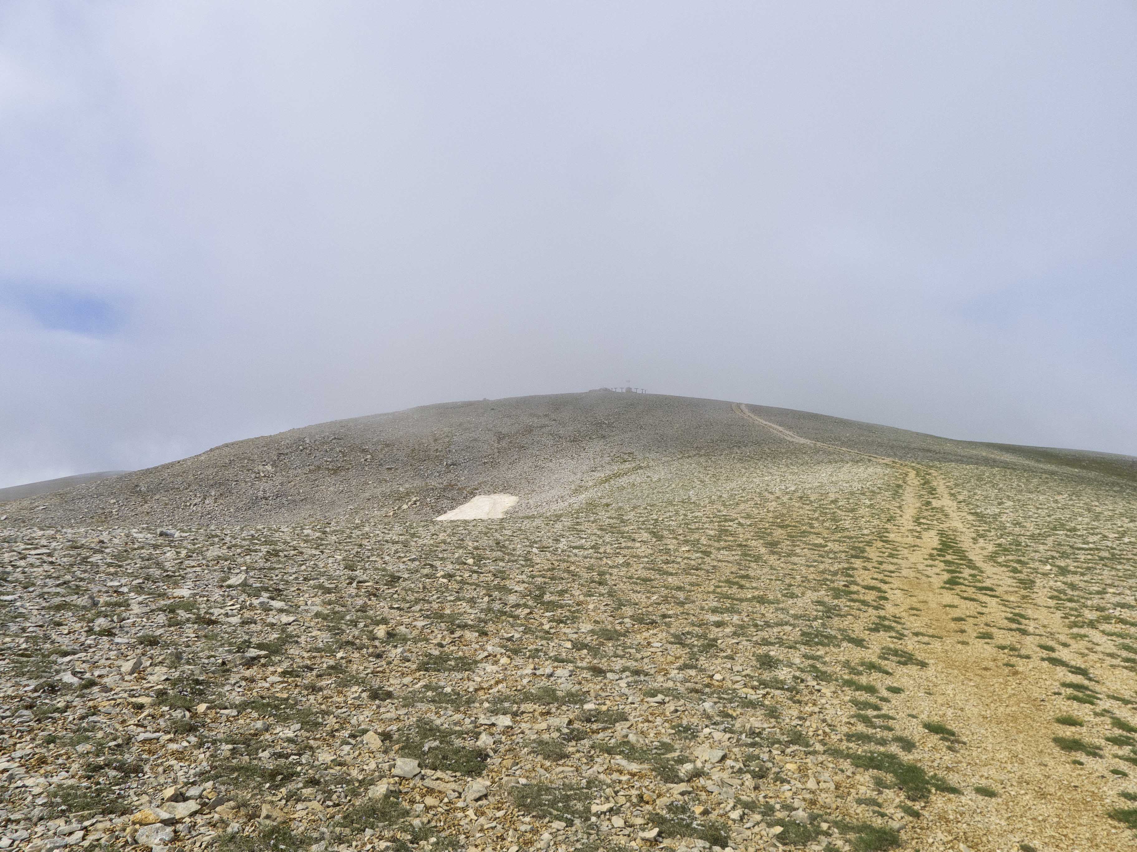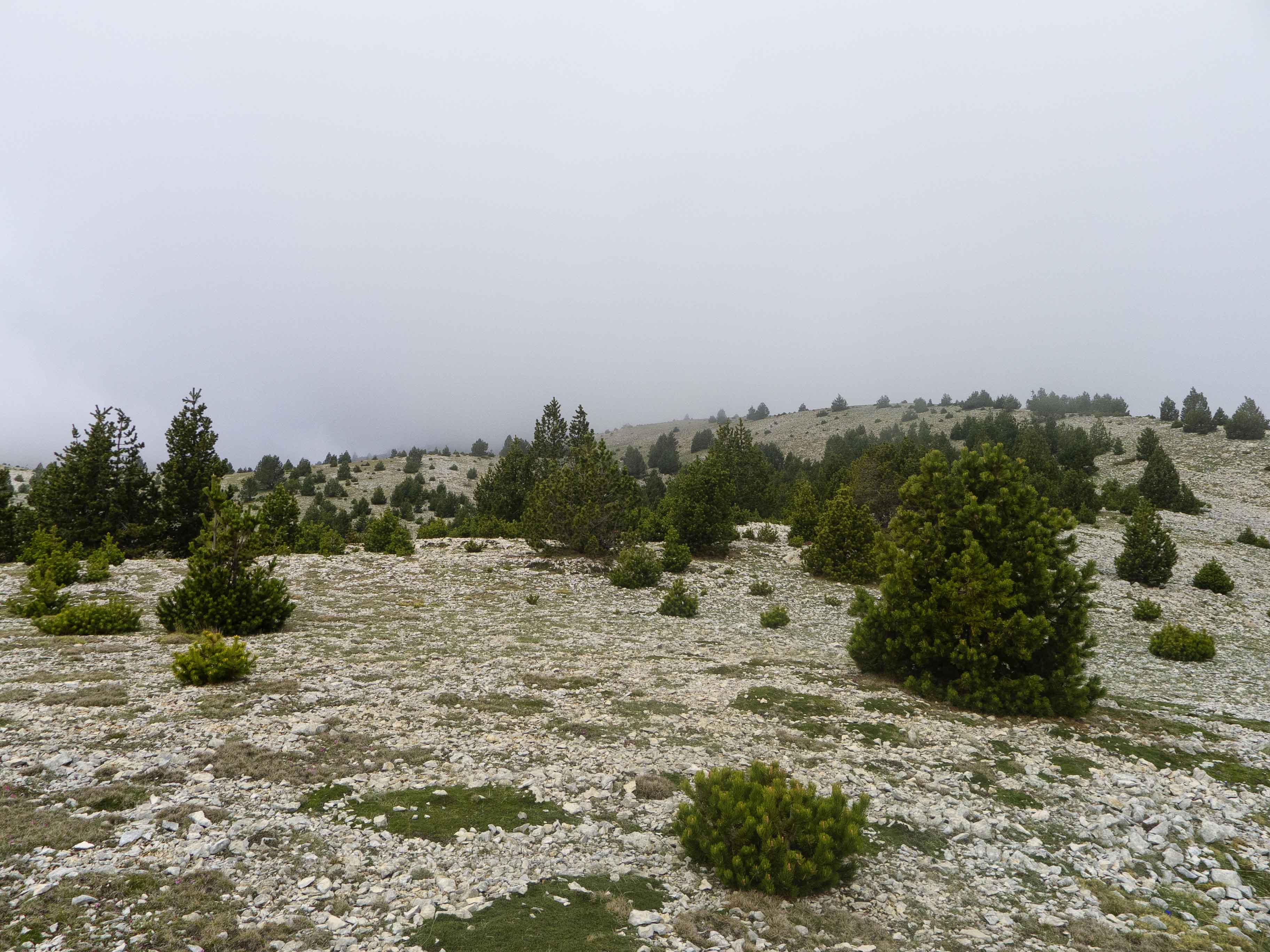 Por terreno algo más herboso descendemos unos treinta metros hacia el collado, que solo intuimos. En estas condiciones de visibilidad, la orientación aquí arriba es muy complicada debido a lo homogéneo del terreno, por lo que para los que visiten por primera vez este sitio recomiendo GPS y prudencia.