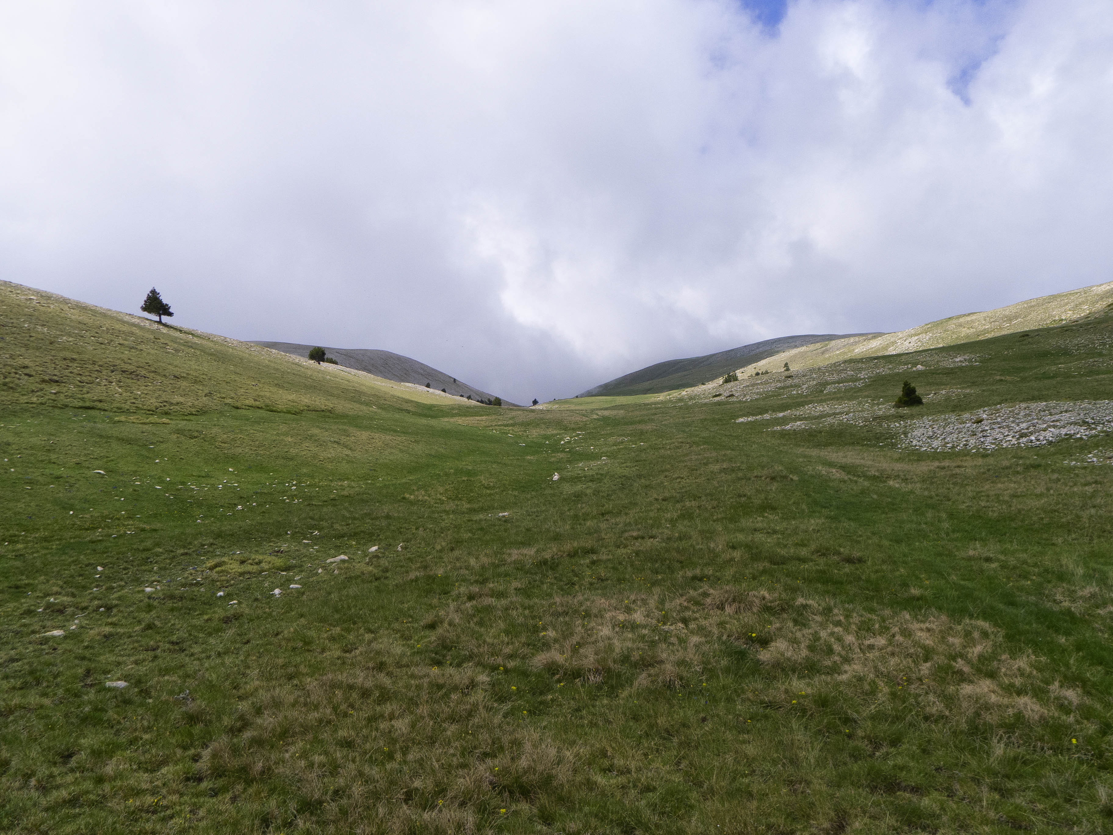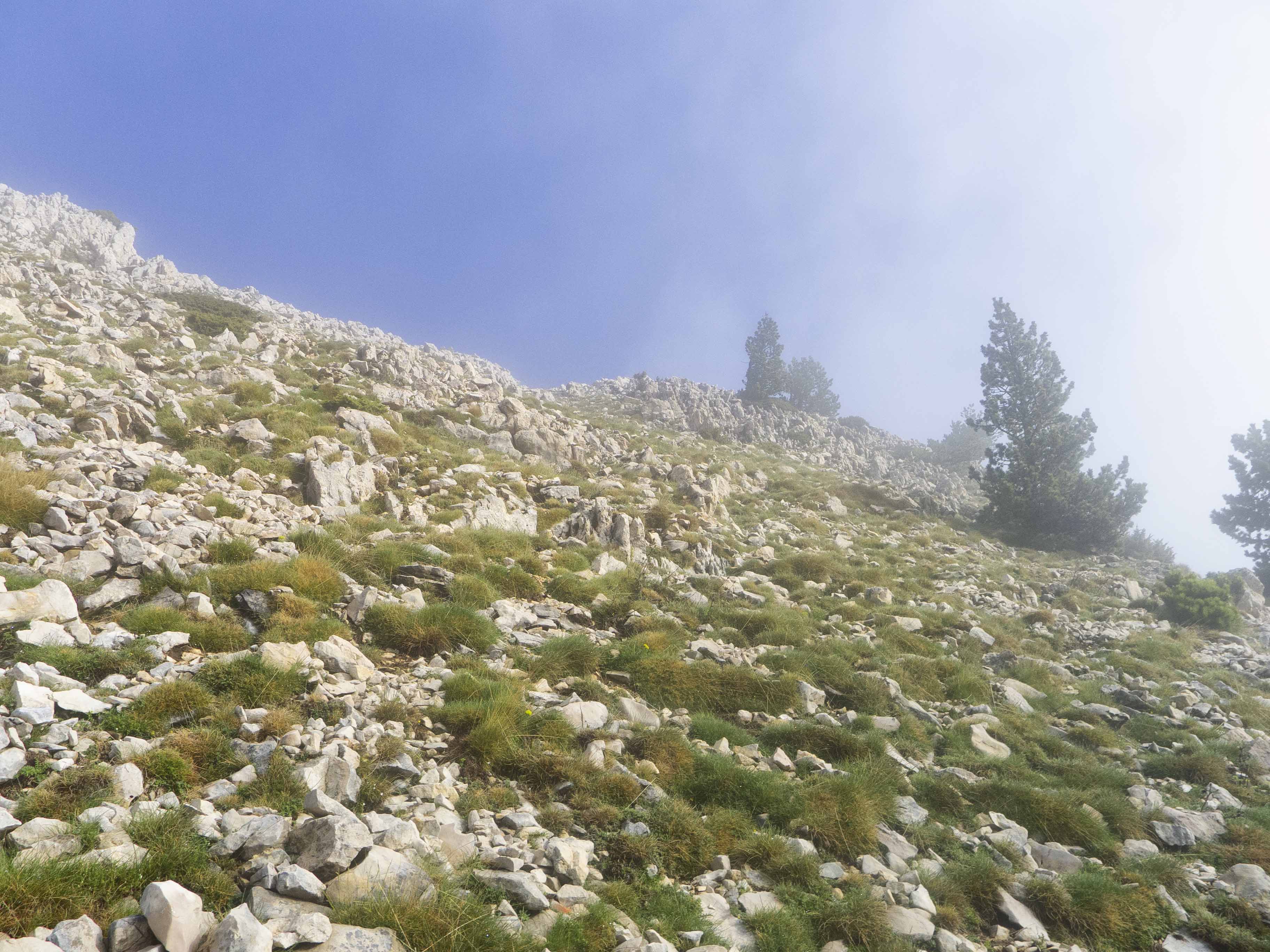 Entramos ahora en un impresionante terreno mineral que llega incluso a intimidar. Seguramente se vea acrecentada nuestra sensación por el gris ambiente impreso por la niebla pero ya de por sí, el albino yermo mineral que nos rodea es espectacular. Una gran dolina separa las dos lomas; nosotros seguiremos por la derecha, salpicada al principio de abetos.