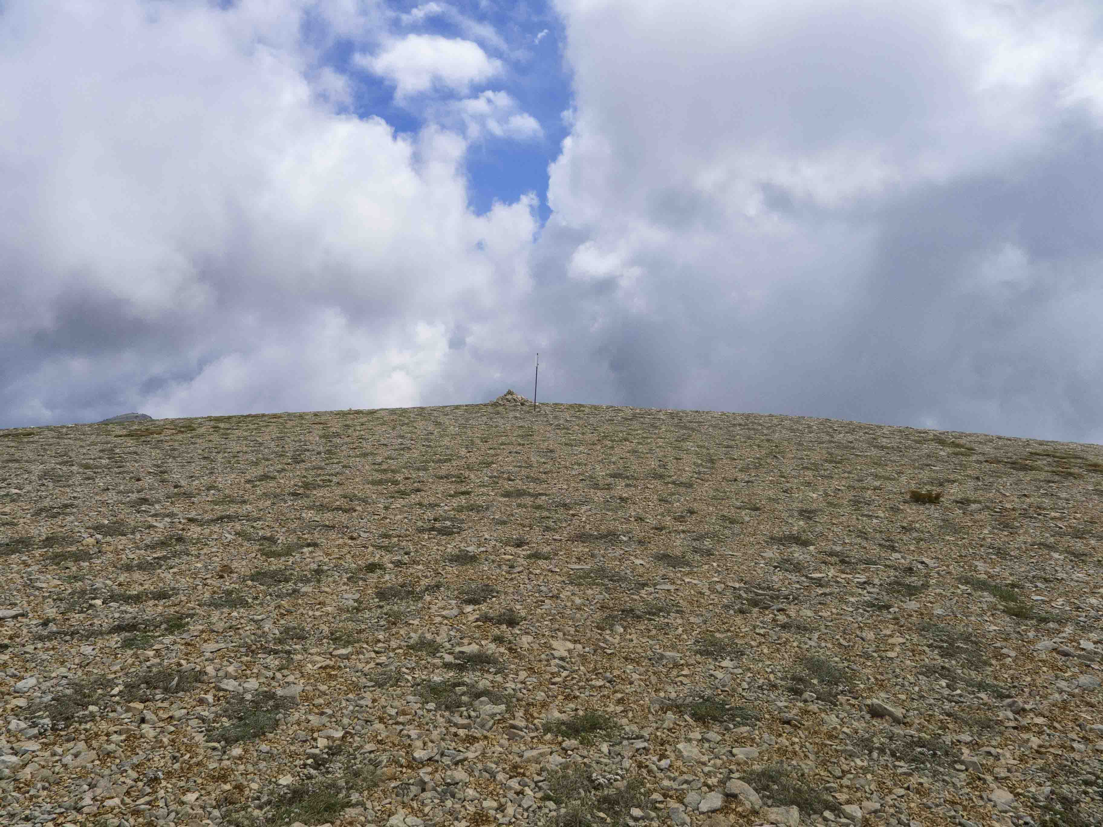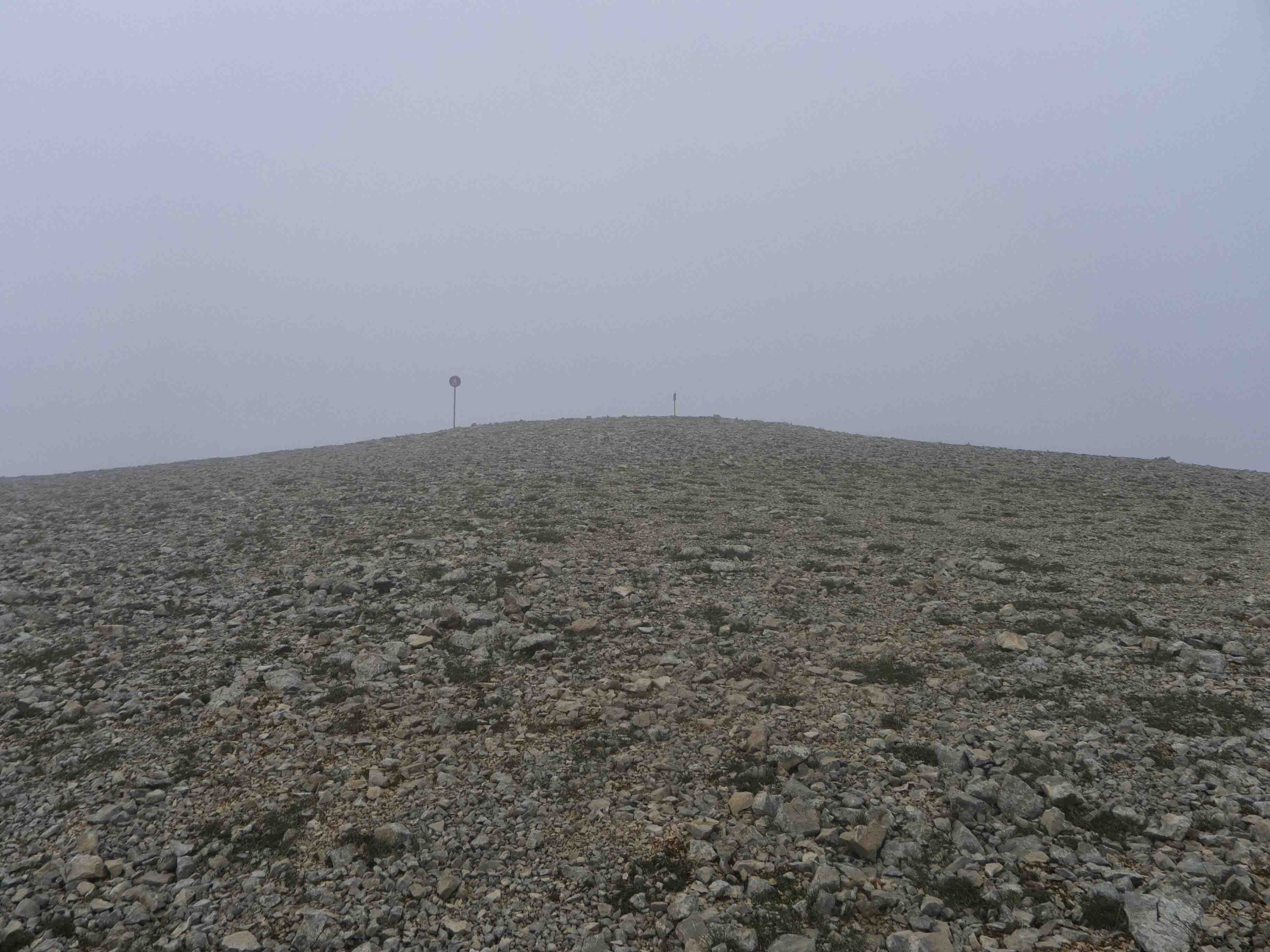 La cumbre de la Gespeguera, totalmente llana, no está marcada. El vértice está al fondo, dos o tres metros por debajo de esta achatada cumbre. Cosas de topógrafos.