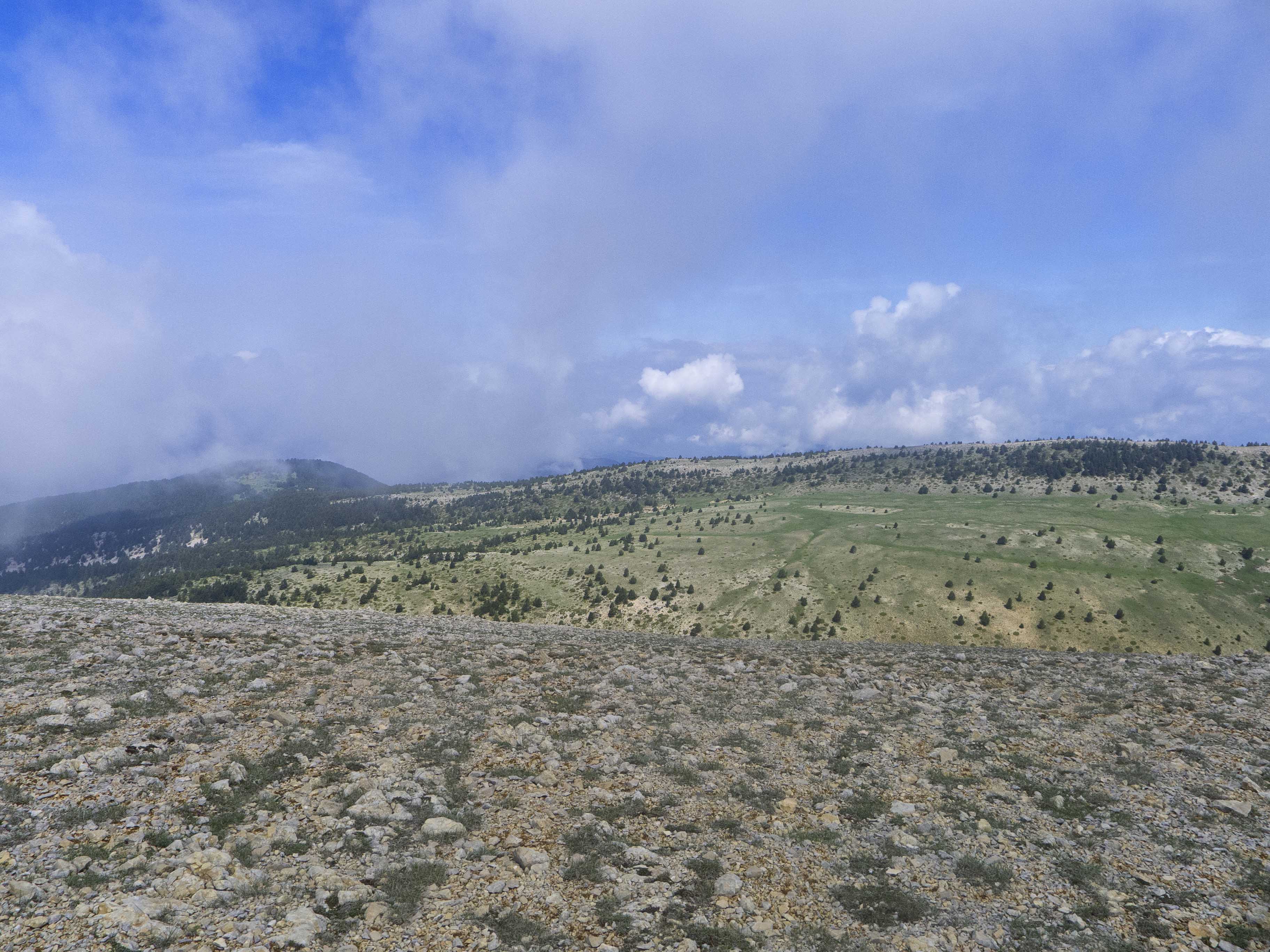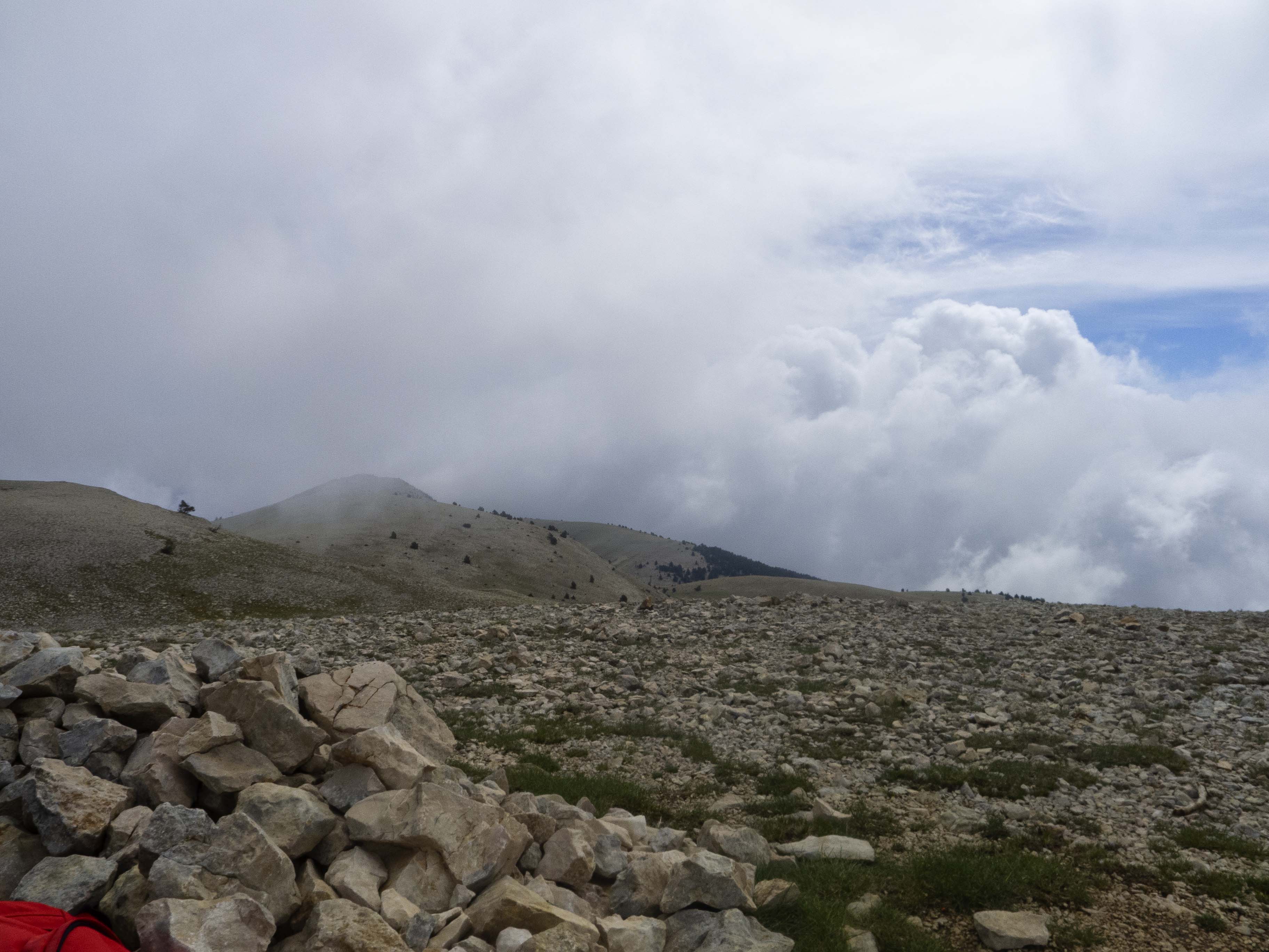 Cumbre del Tossal d'Estivella. Hacia allí se tendría que ver el Cadí pero apenas vemos el Prat d'Arderic a nuestros pies.
