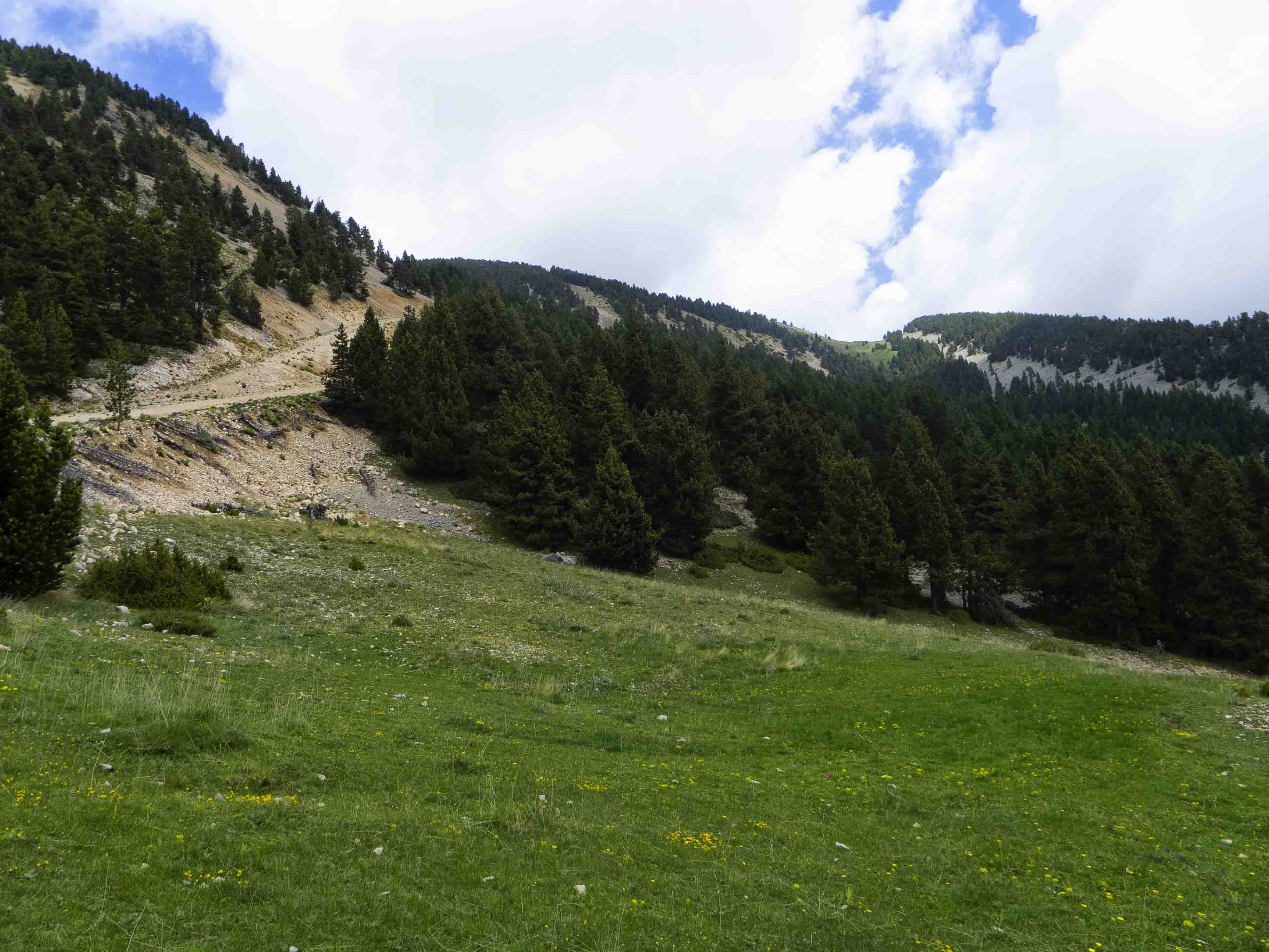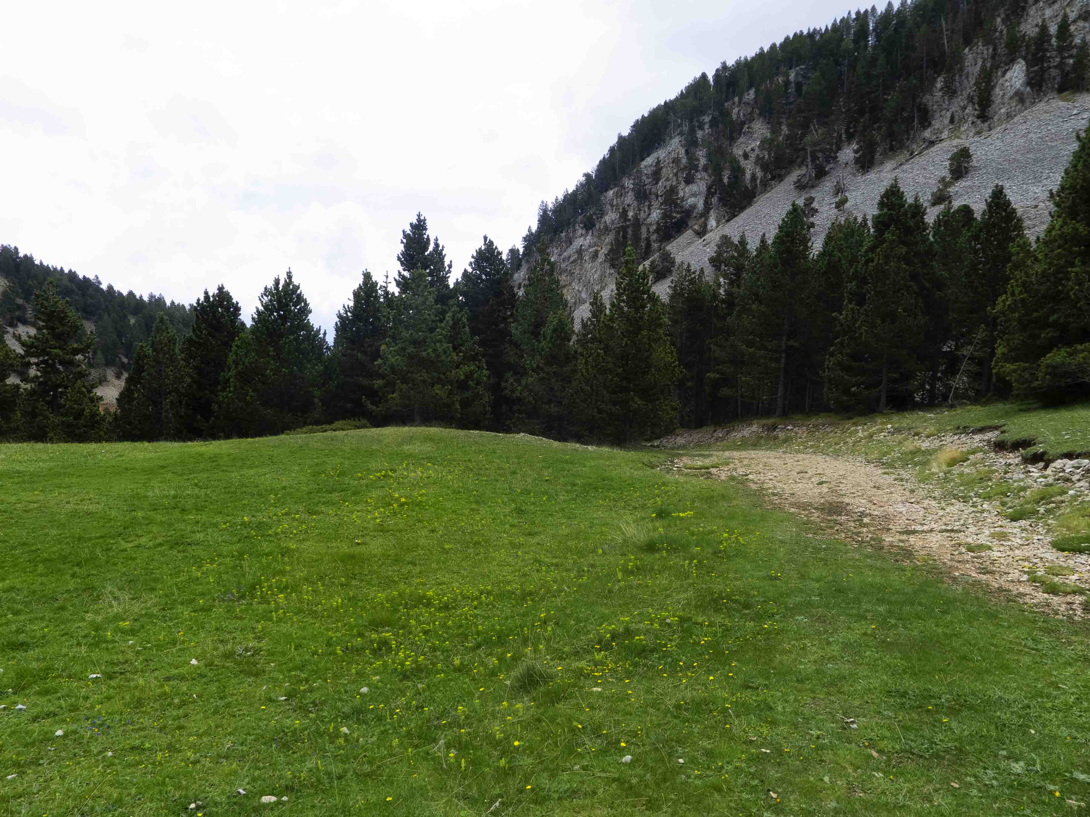 Tras unos zigzags, la pista se acerca a un prado herboso, donde la abandonamos para avanzar un trecho por el mismo.