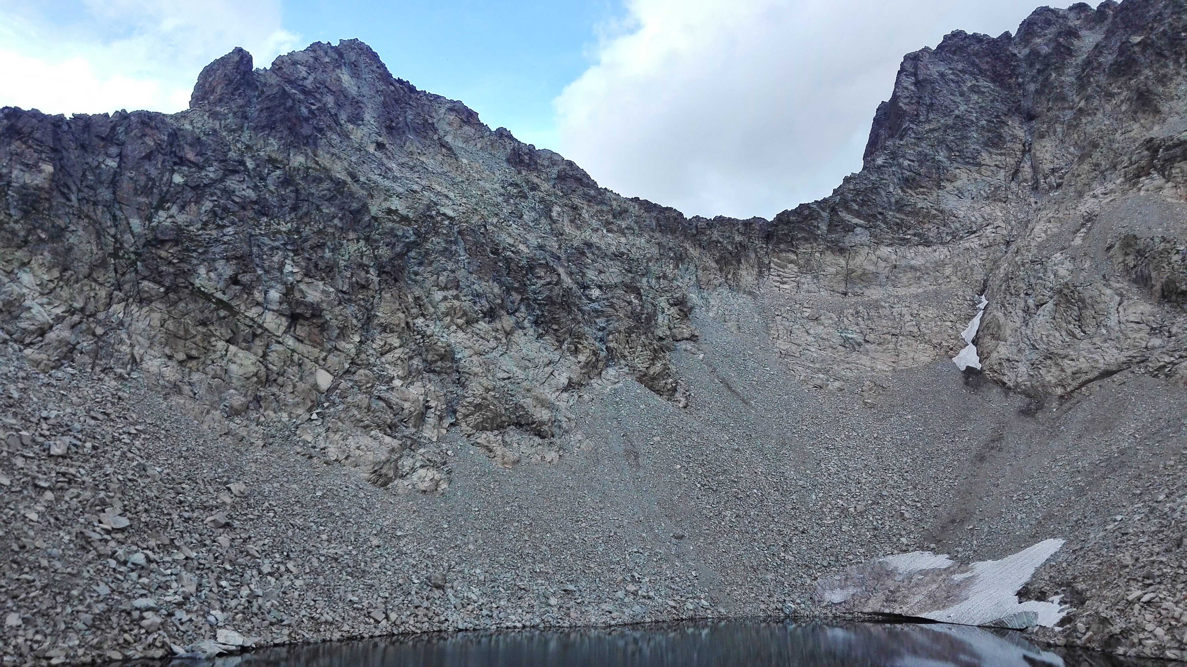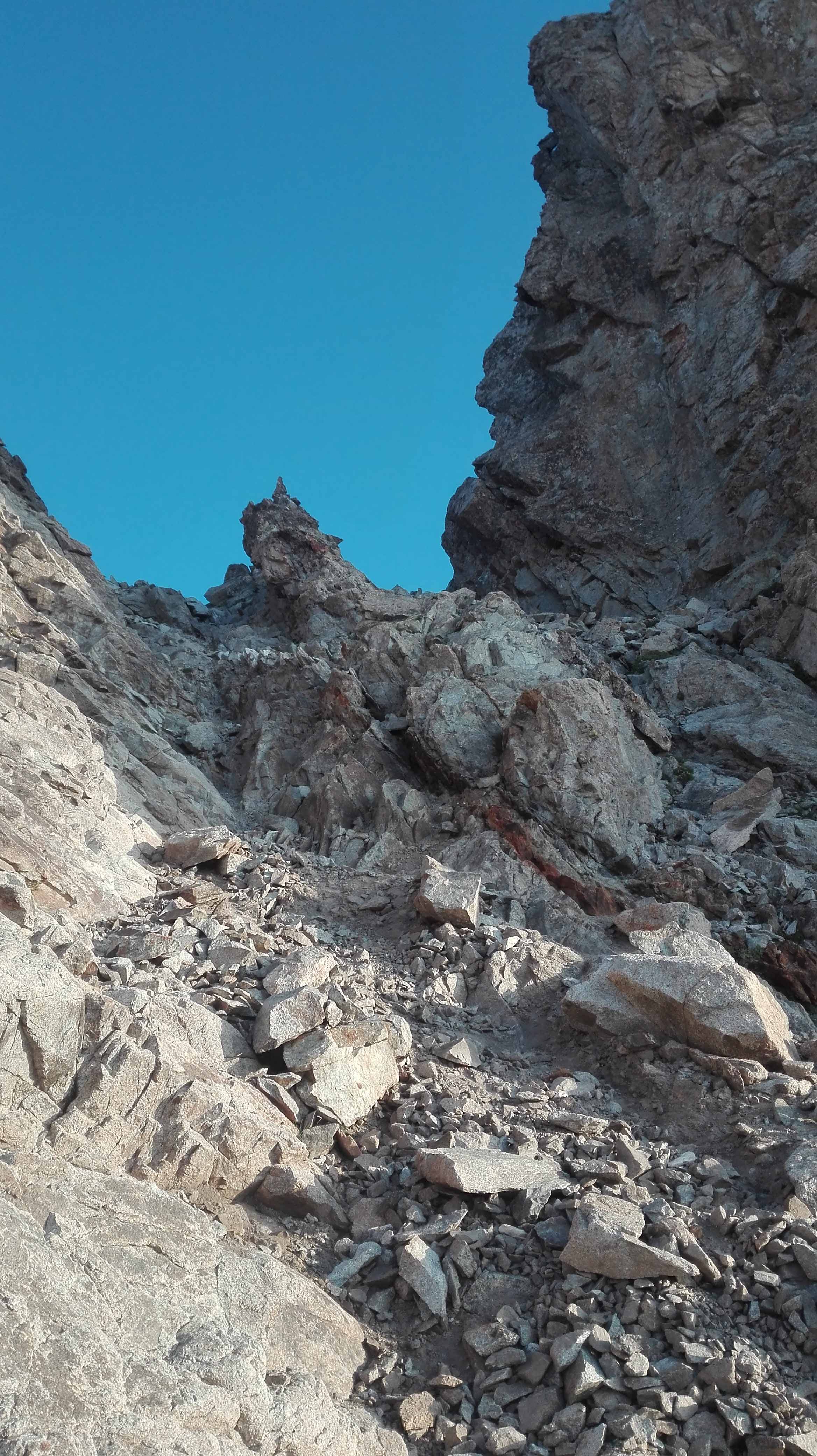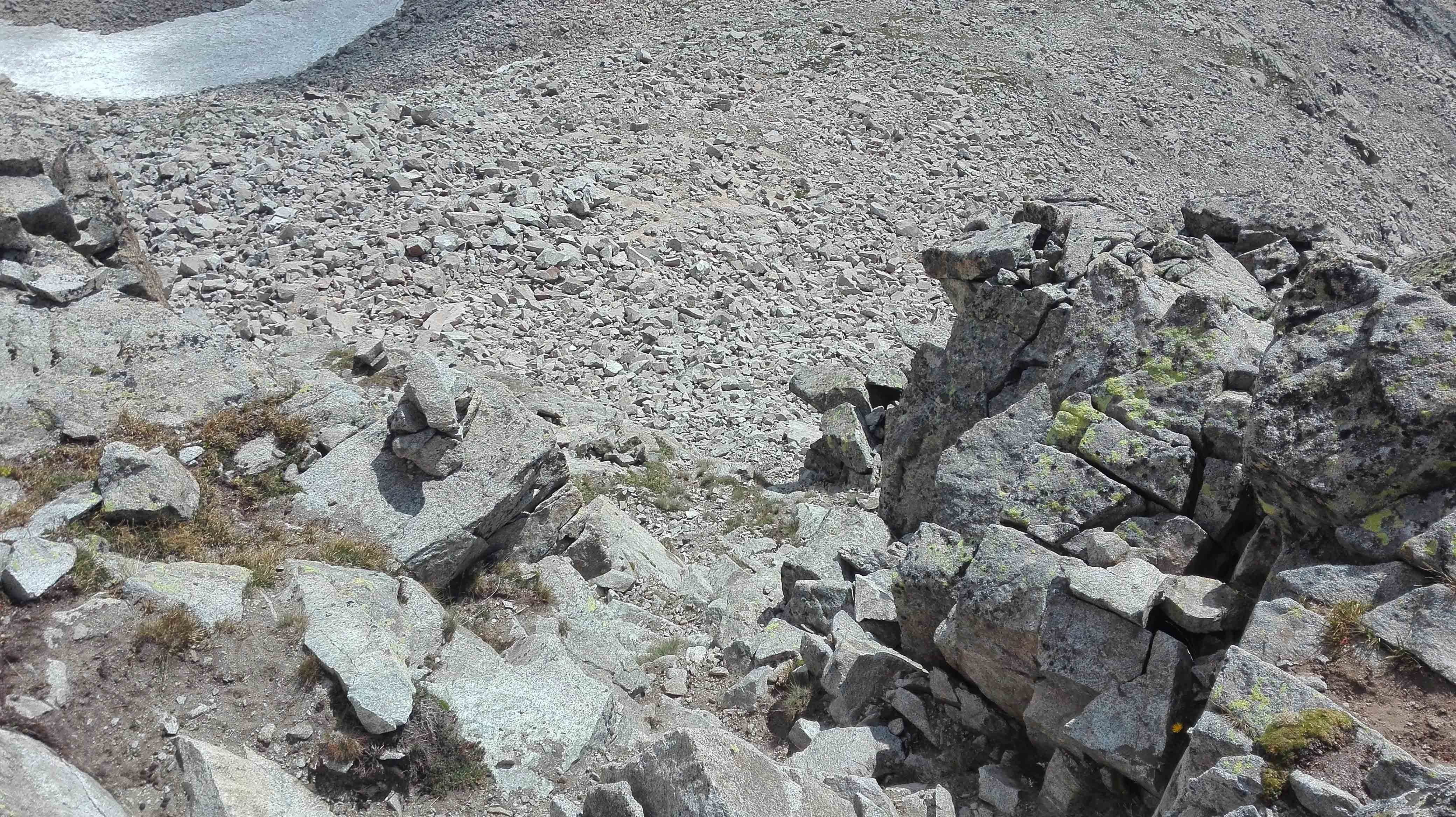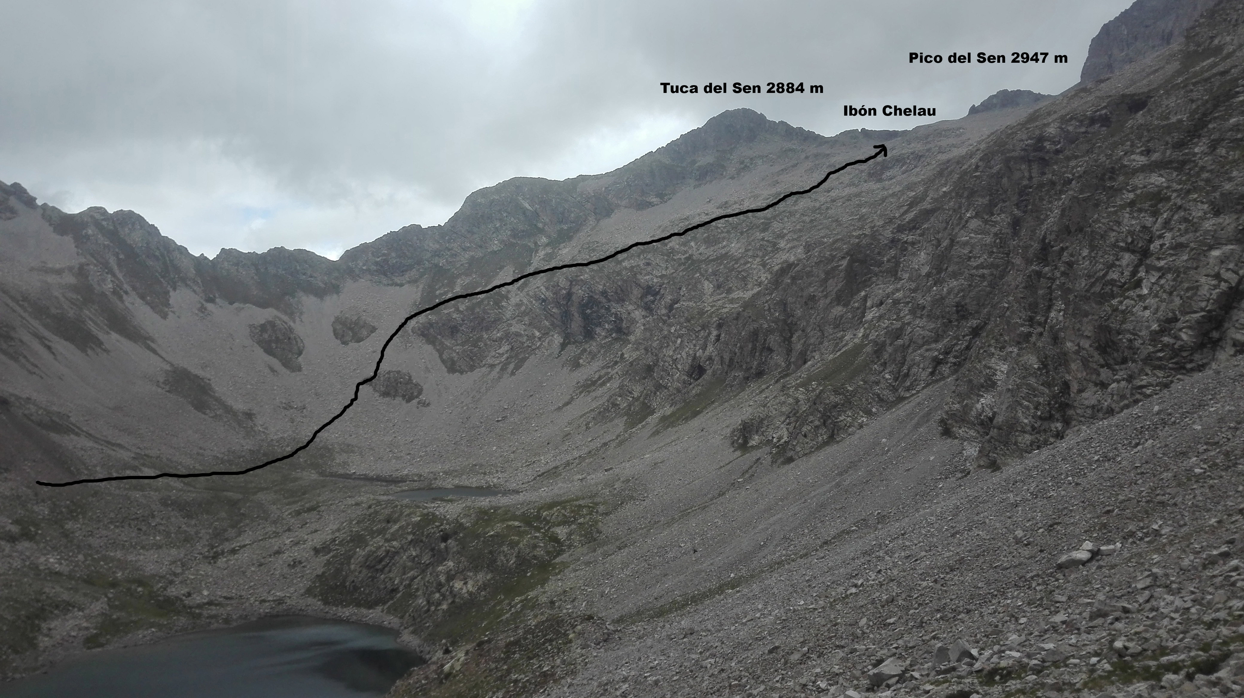 En la pedrera intermedia trazamos una pequeña diagonal hacia la derecha para encarar un segundo murete, de dificultad similar al anterior pero más corto. Cuando llegamos a la mitad de éste, vamos desviándonos hacia la izquierda para llegar a la pedrera desde donde sale la canal, muy clara y marcada con algún hito. Ganando altura hacia la canal, tenemos buenas vistas del Ibón Chelau, donde hemos dormido, y la Tuca del Sen.