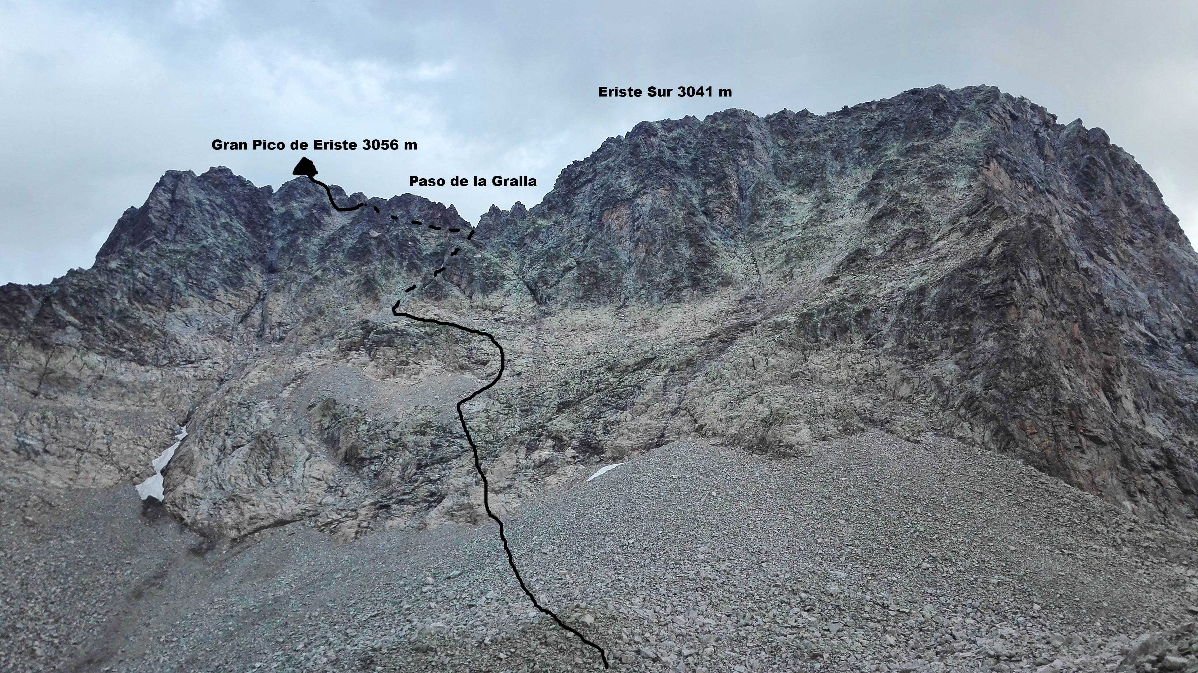 Dificultad técnicaAlgún paso de II para el Paso de la Gralla, I+ para el Gran Pico de Eriste, II continuado para el Eriste Norte, II+ en la chimenea del Eriste Sur
