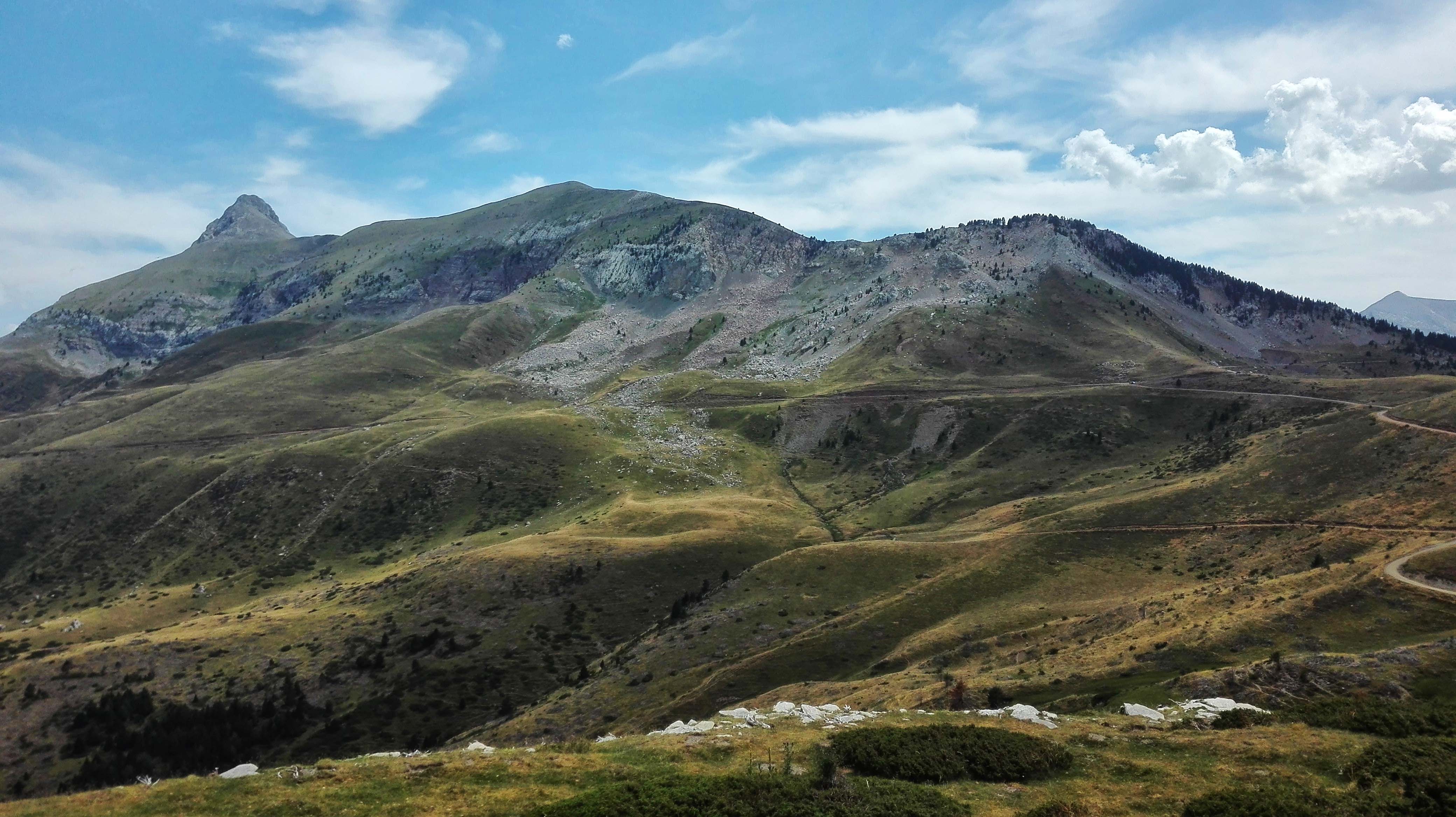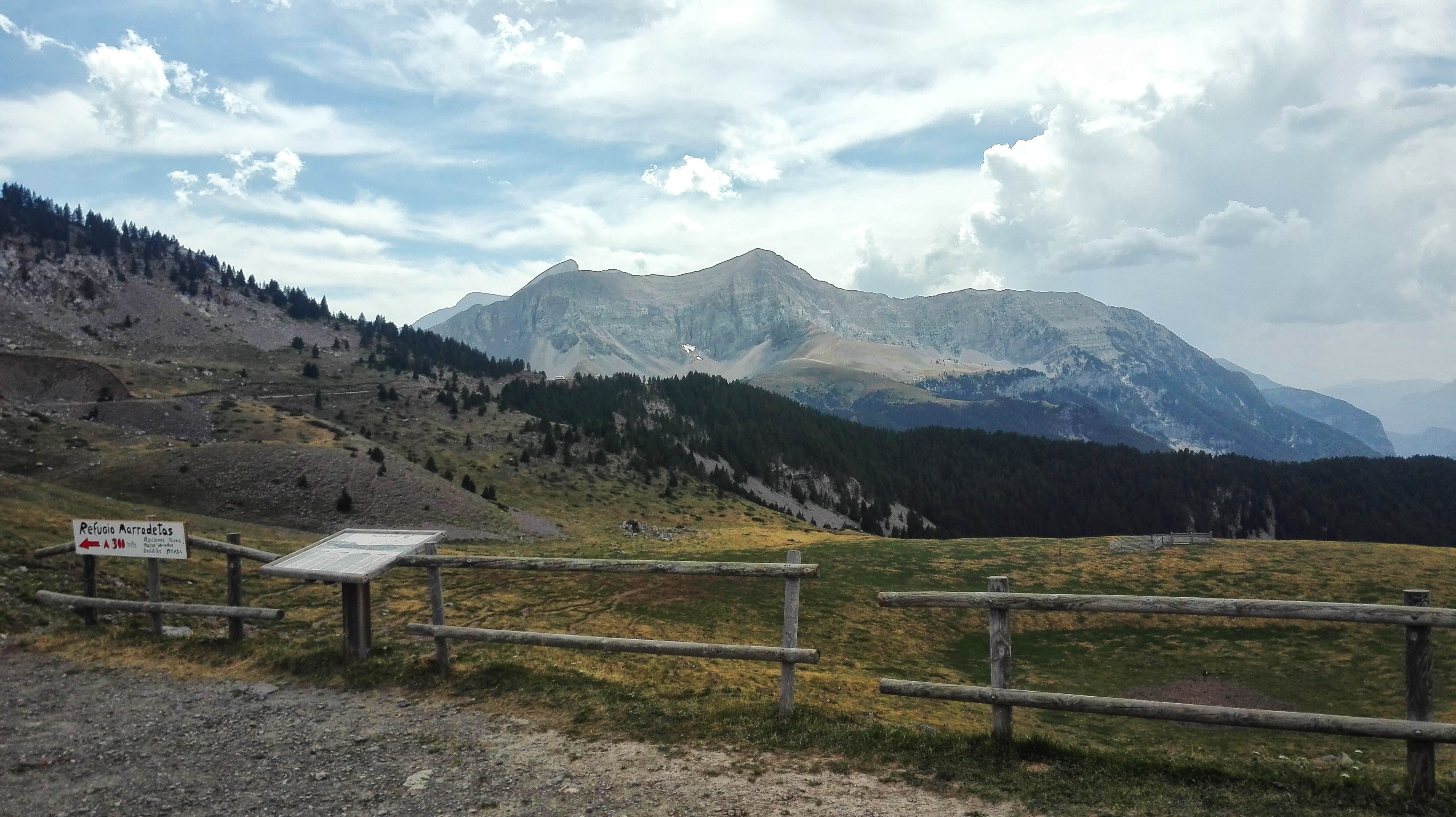 El Puerto de Sahún es el inicio de esta excursión y, como divisoria de los valles de Chistau y Benás, es un mirador extraordinario, con unas grandísimas vistas sobre el Valle de Pineta y las Maladetas. Desde el collado, tenemos estas vistas del macizo de Cotiella, con la Peña las Once haciendo de muro frontal.