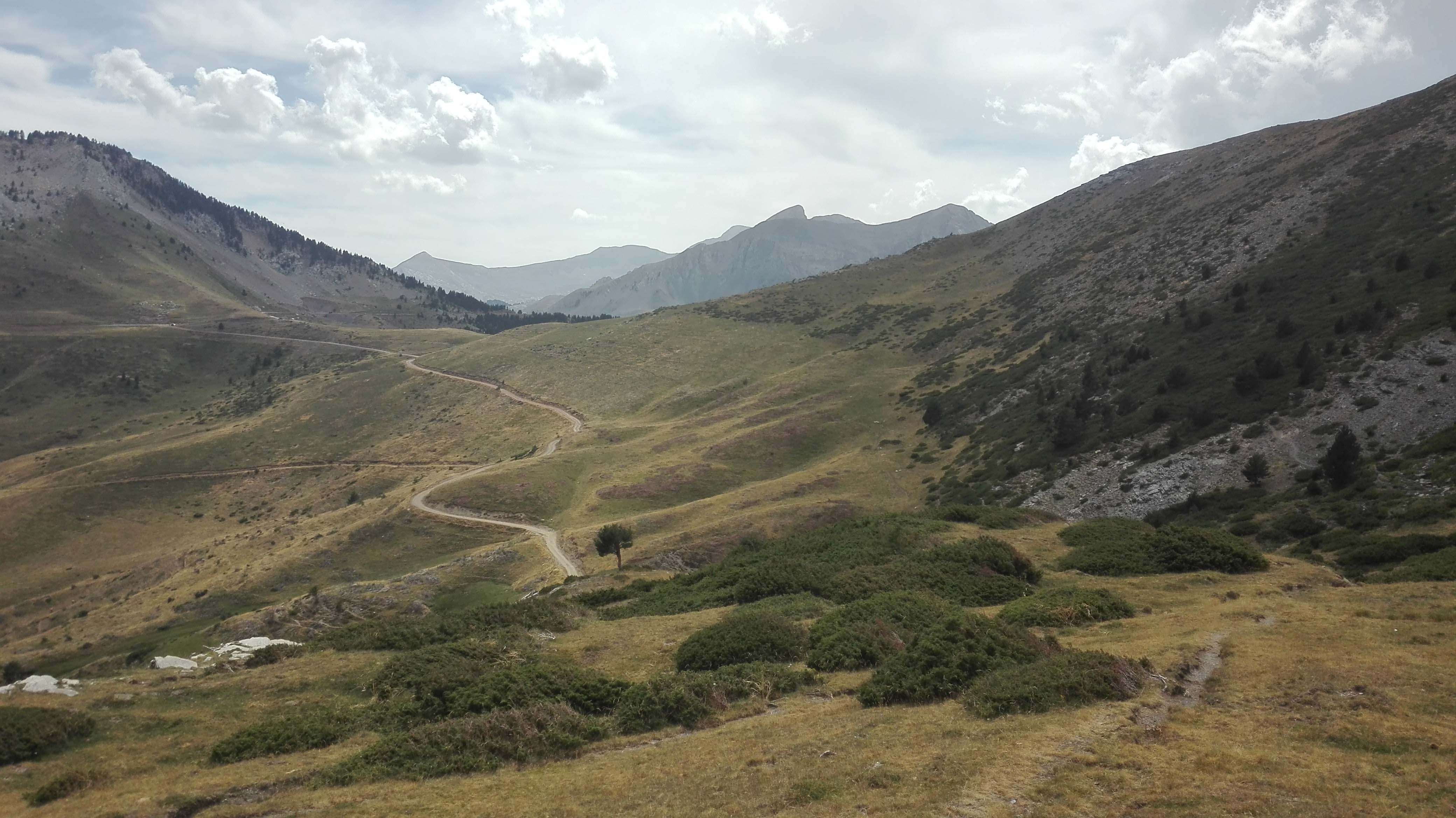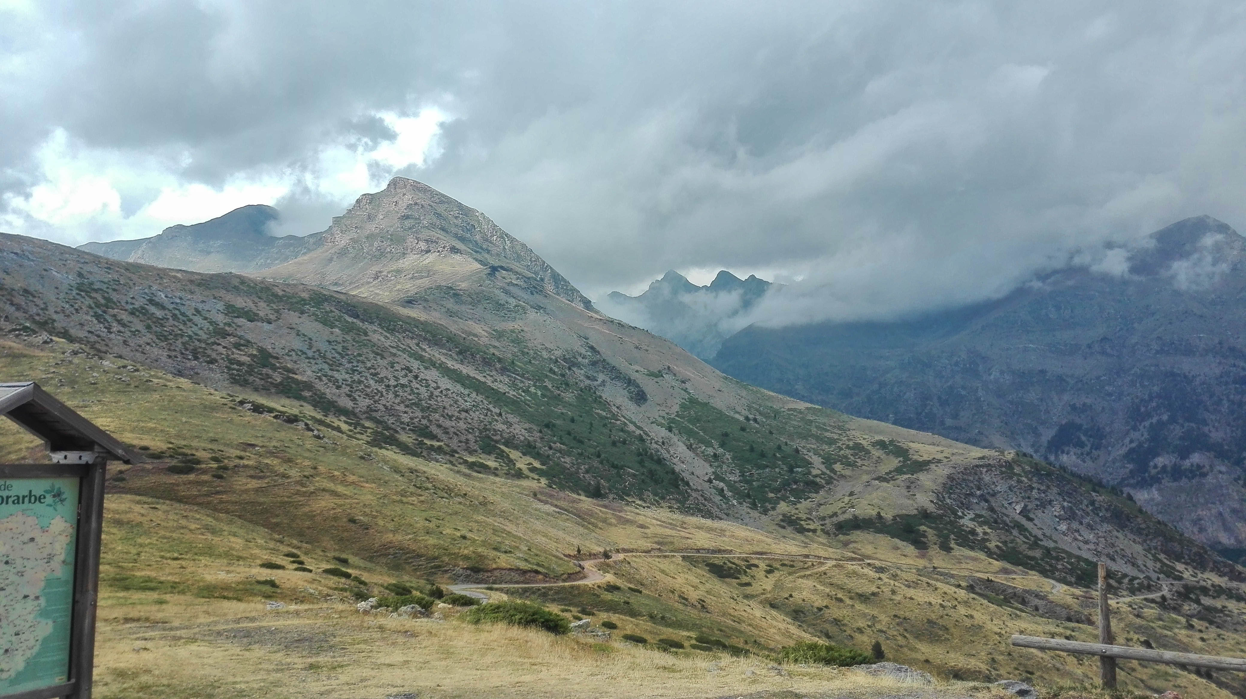 Al estar muy cansados ya y ser la meteorología bastante inestable, pues vemos nubarrones muy negros encima de Chía, preferimos seguir primero por sendero trillado y después por pista, a ir a media ladera por mal terreno. Yendo por el sendero, llegamos a la Cabana dels Prats, donde cogeremos la pista para dirigirnos al collado de Sahún.
