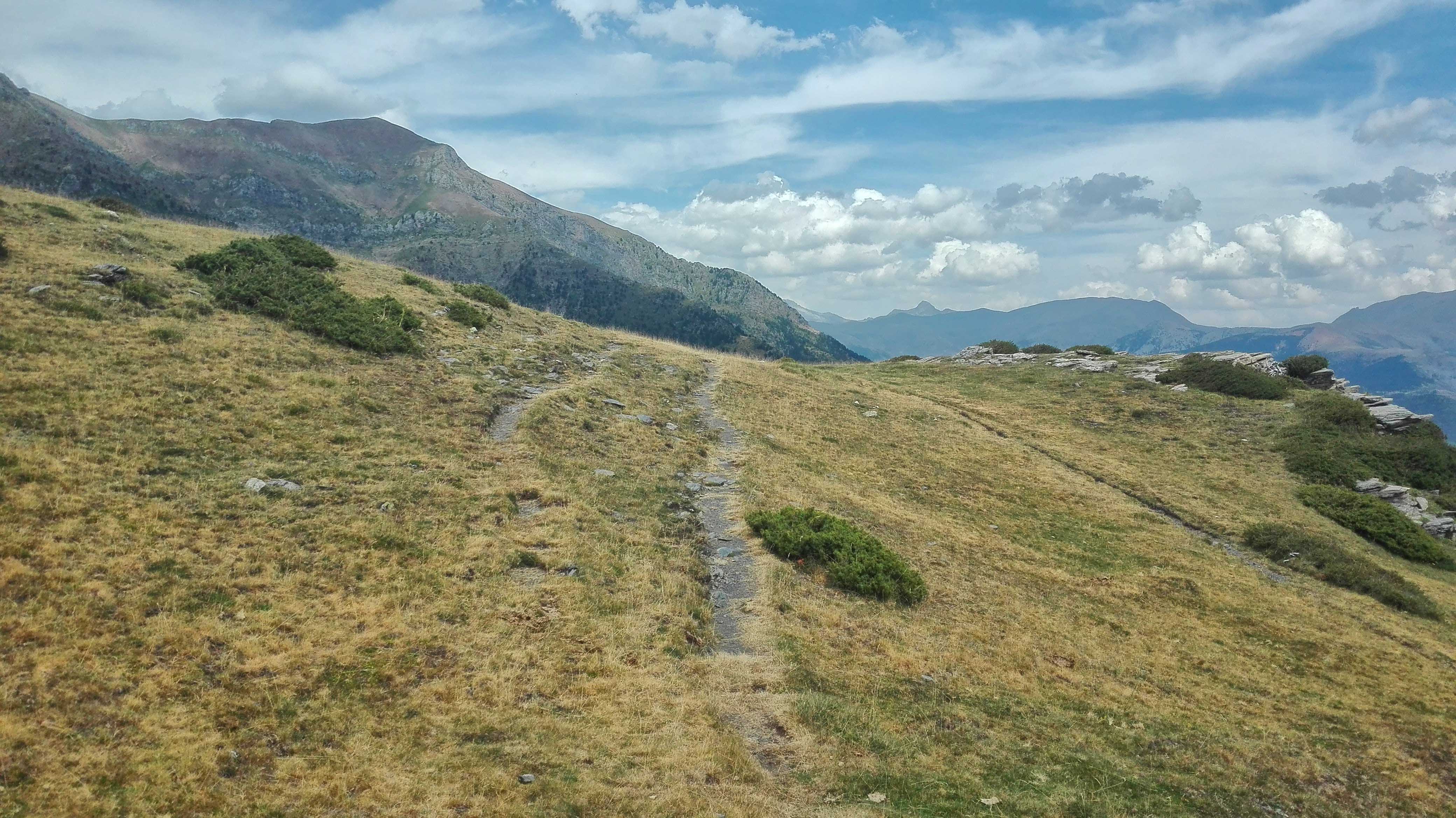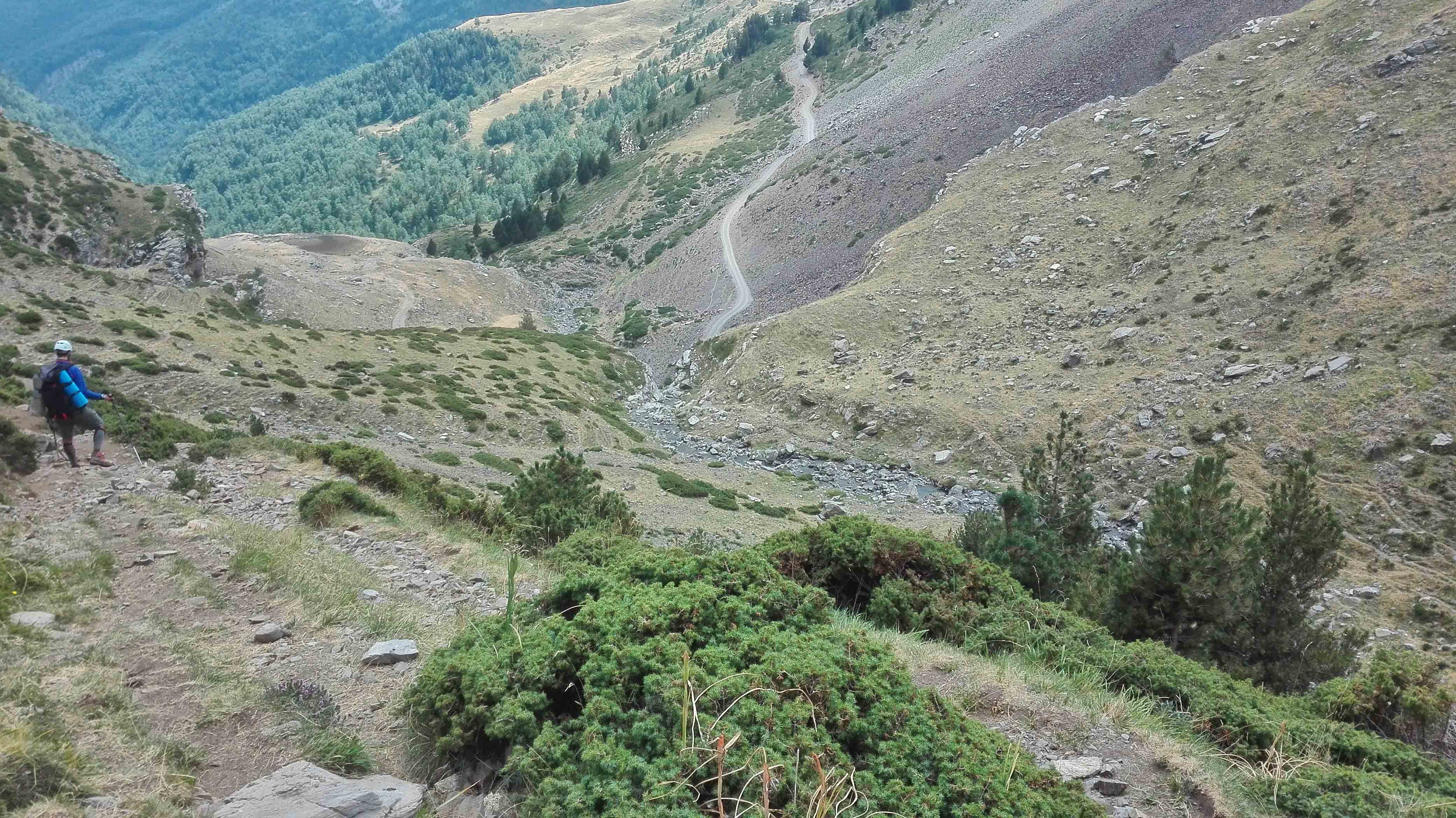 Tras subir una empinada pendiente, ganamos un sendero muy difuso que pasa por encima del cortado y que aparece y desaparece, aunque empiezan a aparecer hitos que nos hacen mantener el rumbo, mientras cruzamos canales y siempre por terreno desagradable. Tras pasar un gran hito, no tardamos en juntarnos con el buen camino que viene de la Cabaña dels Prats. En conclusión, diría que el camino que flanquea desde el puerto de Sahún es un camino un poco engorroso, más rápido que la alternativa por la pista pero bastante más incómodo, aparte de que las frecuentes subidas y bajadas aportan también cansancio en las piernas. Cuestión de gustos y de prioridades.