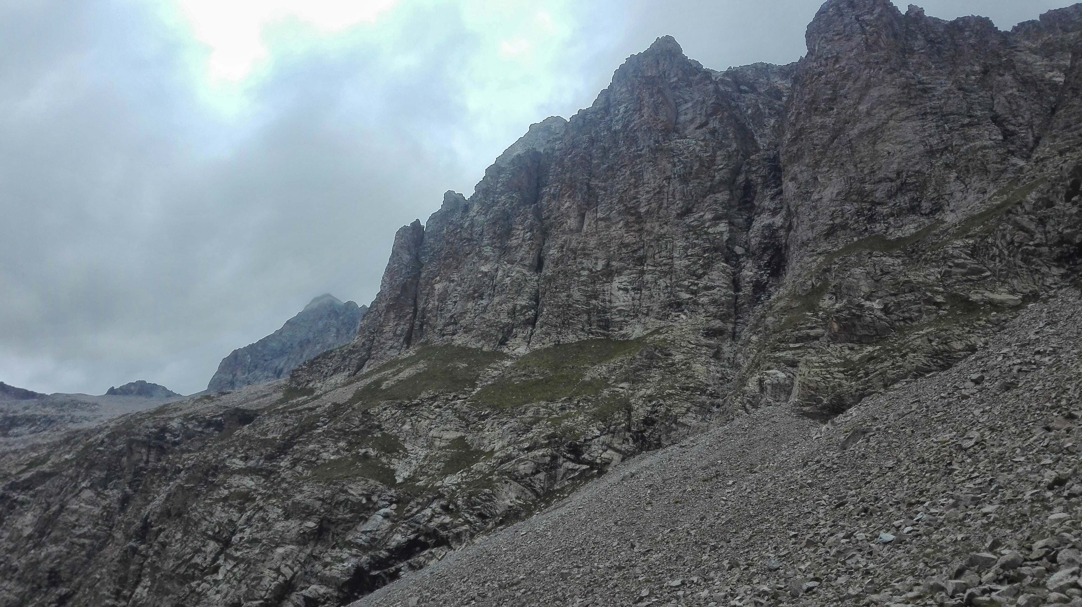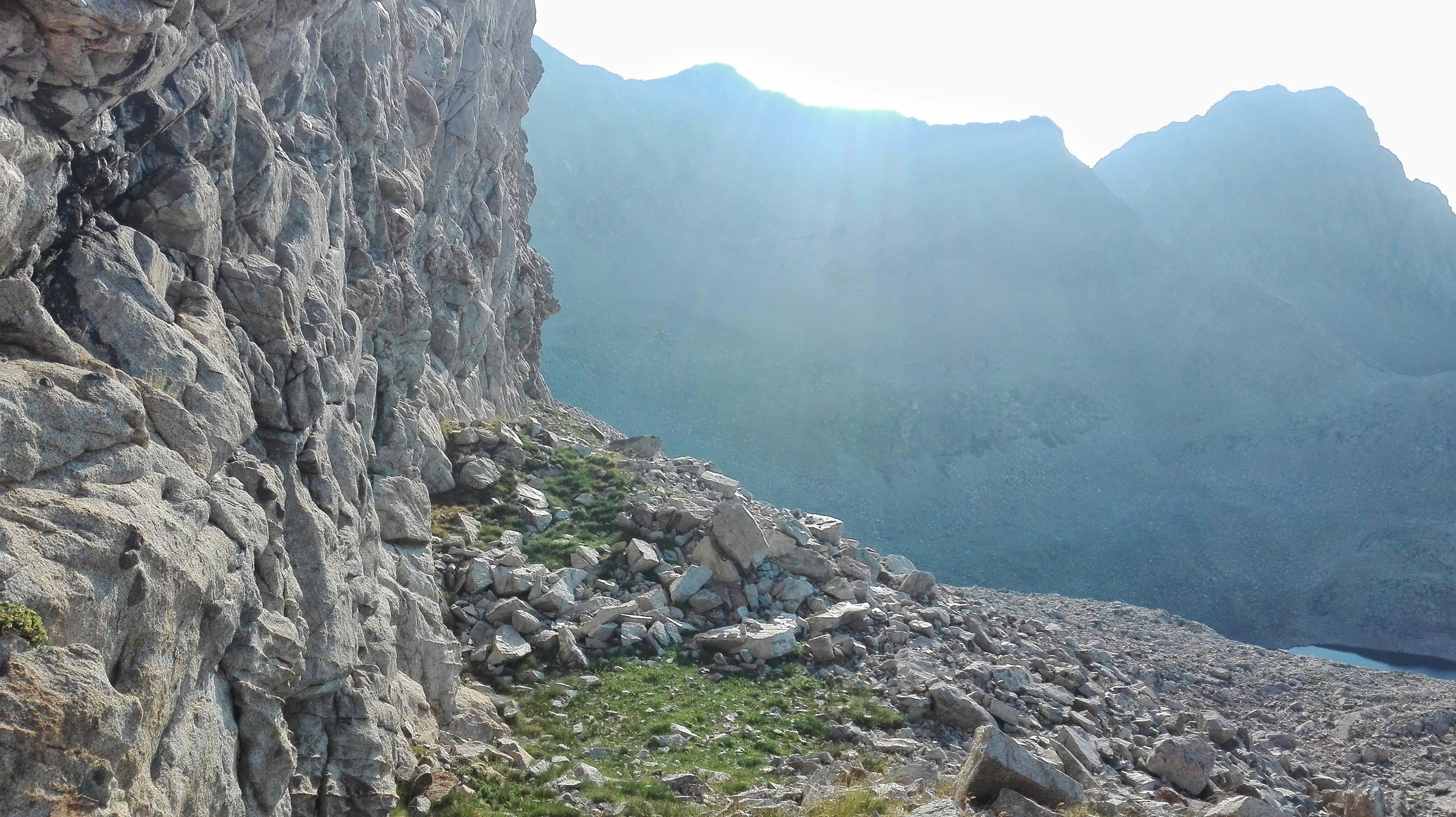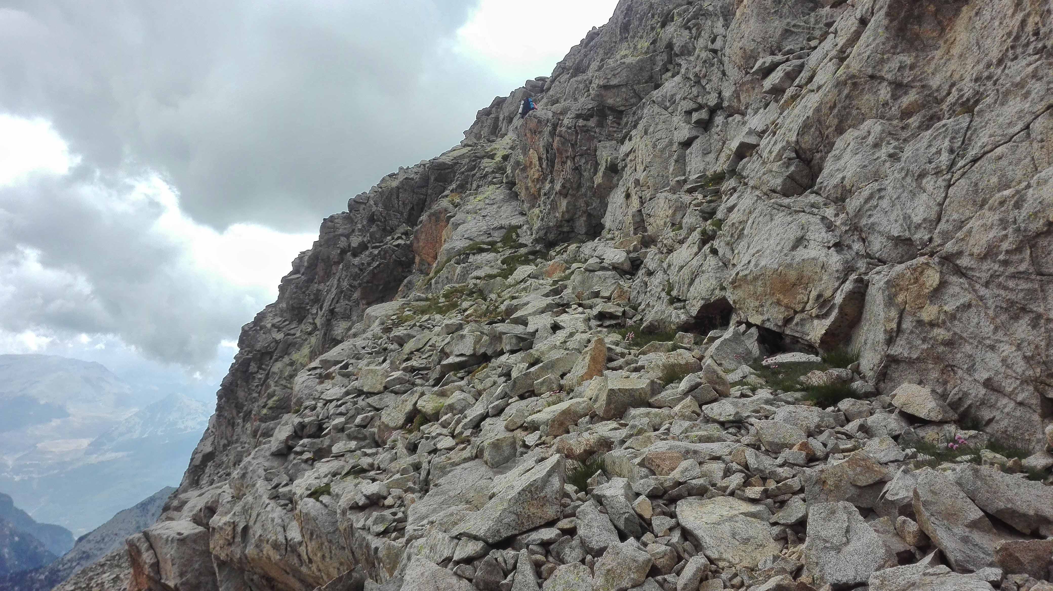 A medida que nos vamos acercando, la calidad del terreno es cada vez peor hasta que llega el punto de que cada paso que damos implica que las piedras de nuestros pies se vayan para abajo, convirtiendo el flanqueo en una travesía penosa. Afortunadamente, en la misma base del muro que queremos rodear, vemos una estrecha franja de hierba, por lo que nos dirigimos ahí.