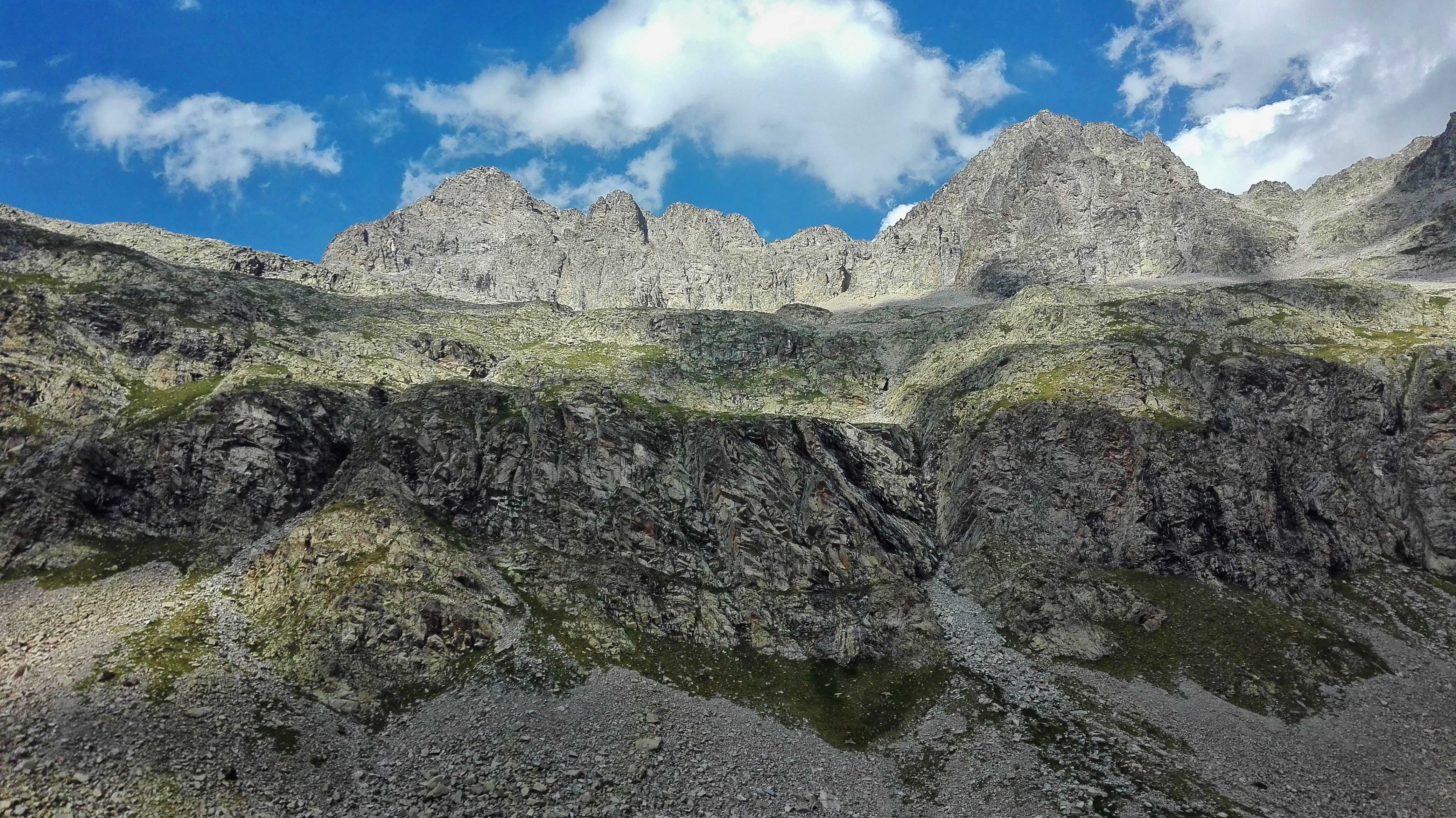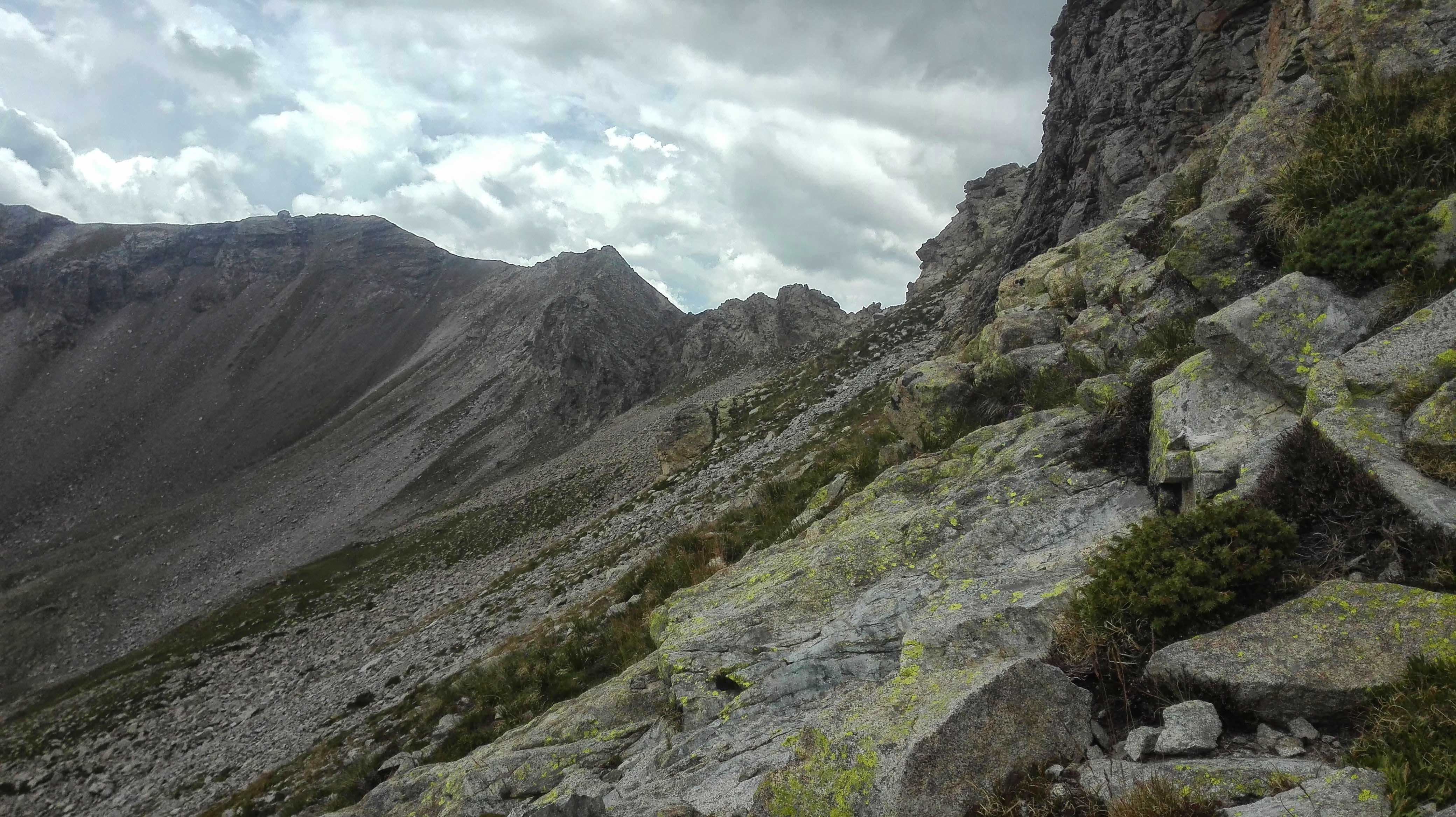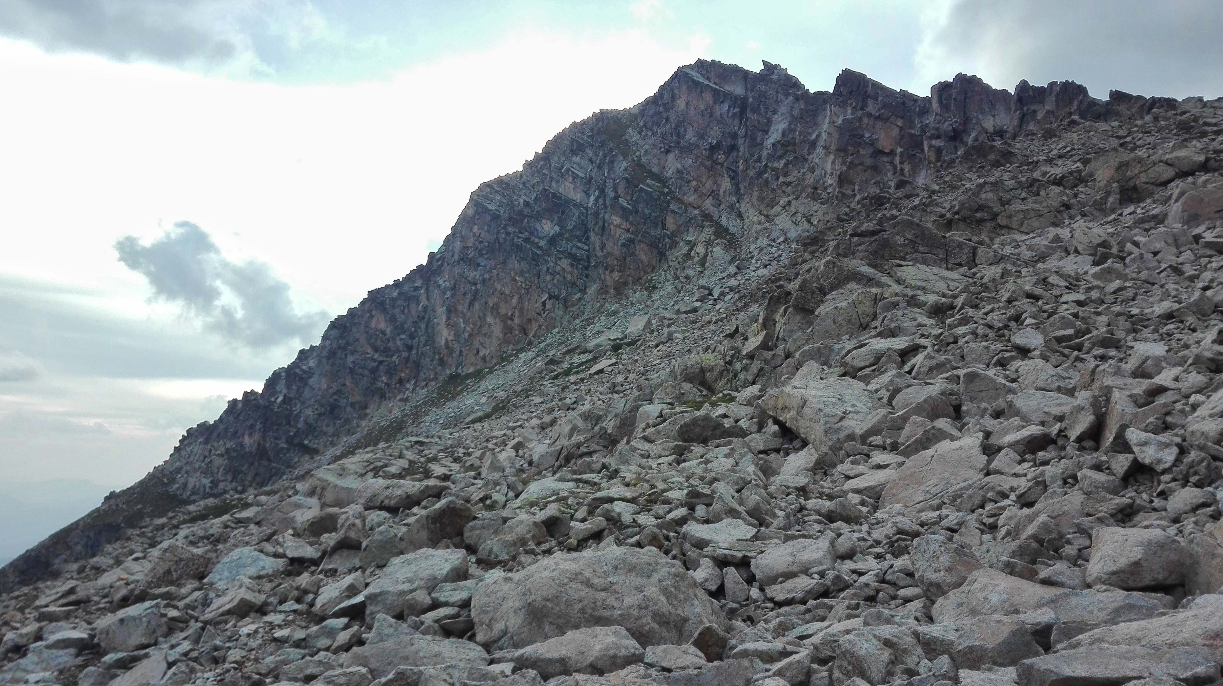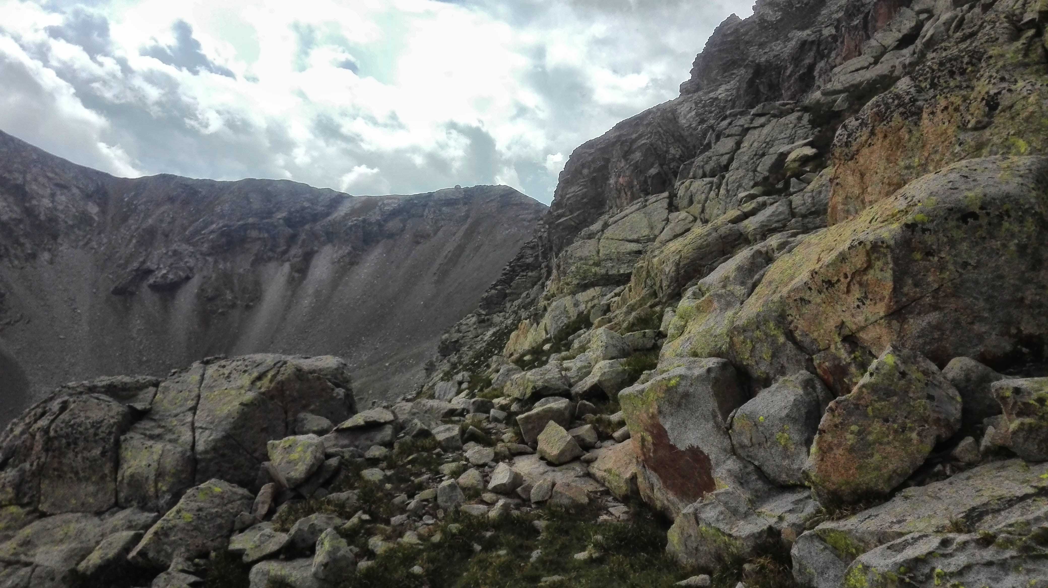 A medida que nos vamos acercando, la calidad del terreno es cada vez peor hasta que llega el punto de que cada paso que damos implica que las piedras de nuestros pies se vayan para abajo, convirtiendo el flanqueo en una travesía penosa. Afortunadamente, en la misma base del muro que queremos rodear, vemos una estrecha franja de hierba, por lo que nos dirigimos ahí.
