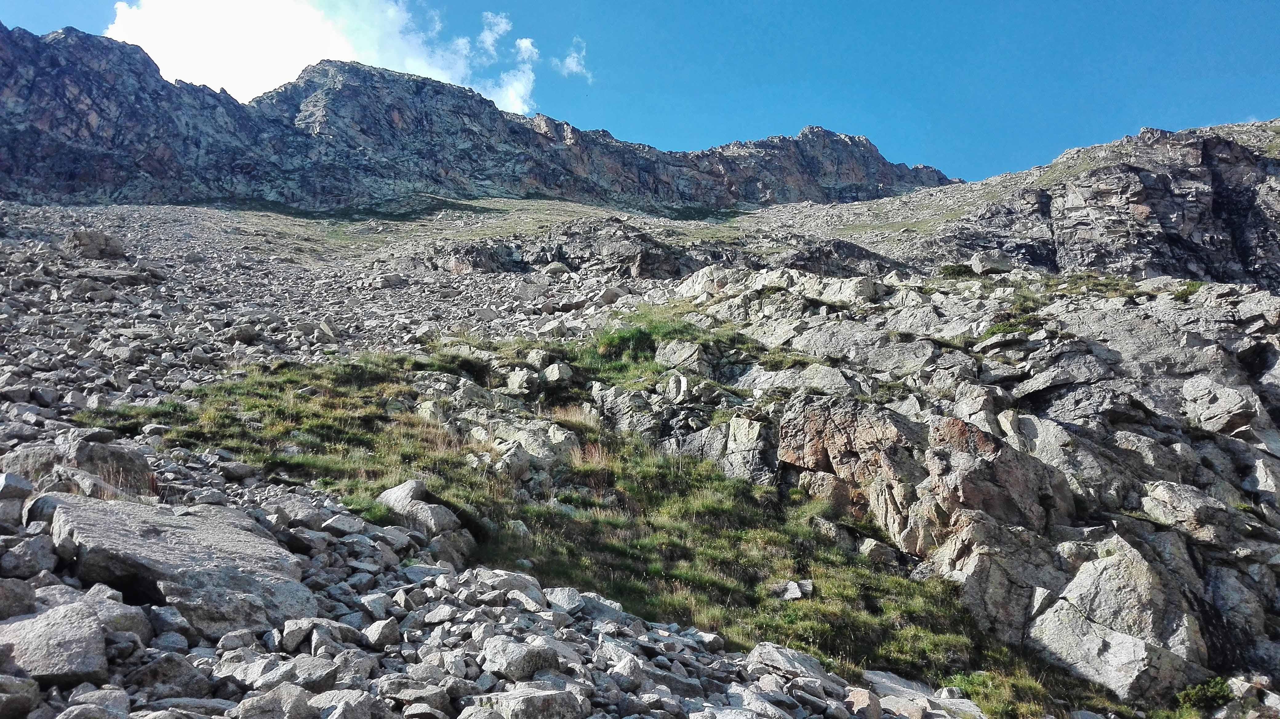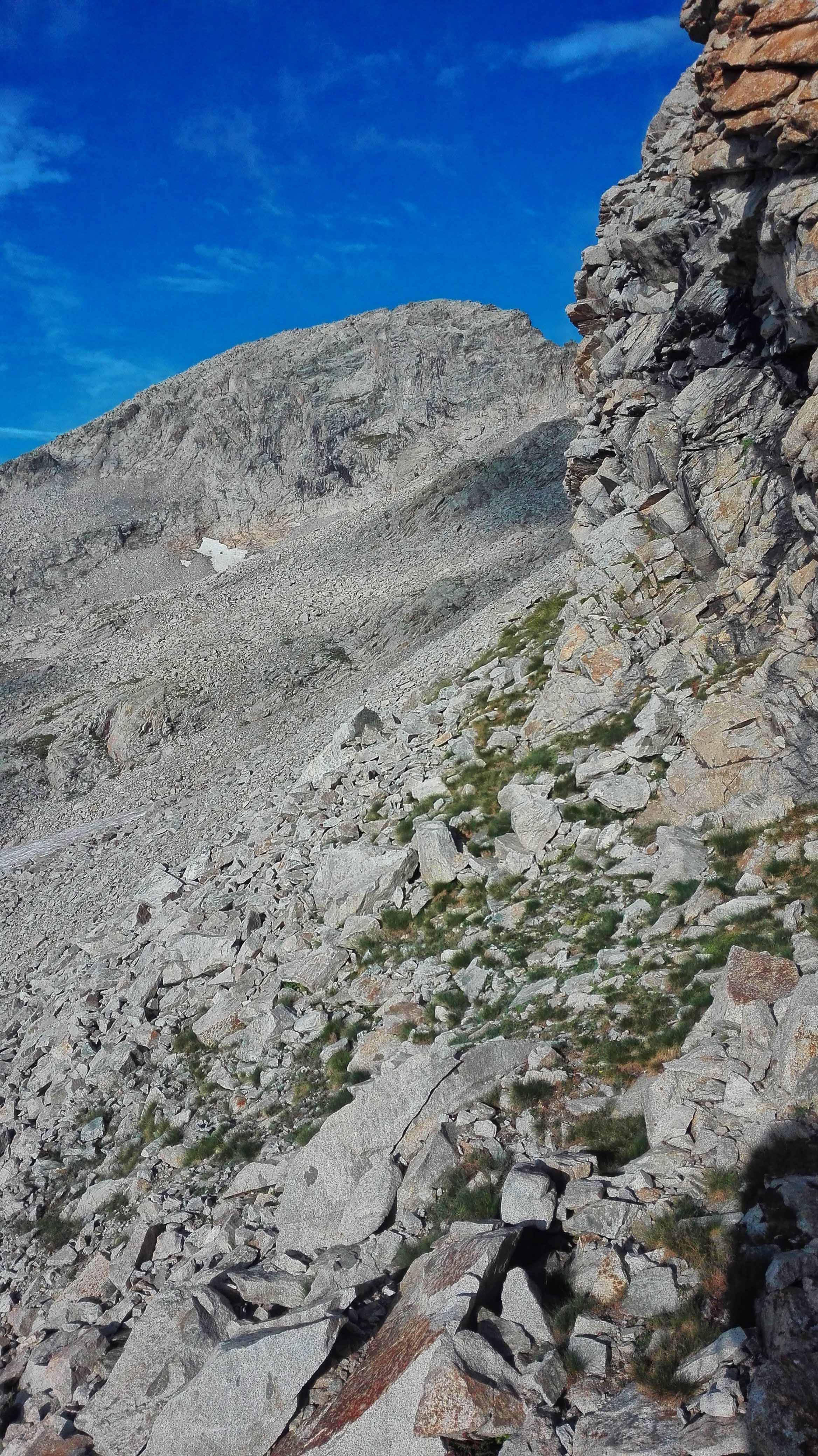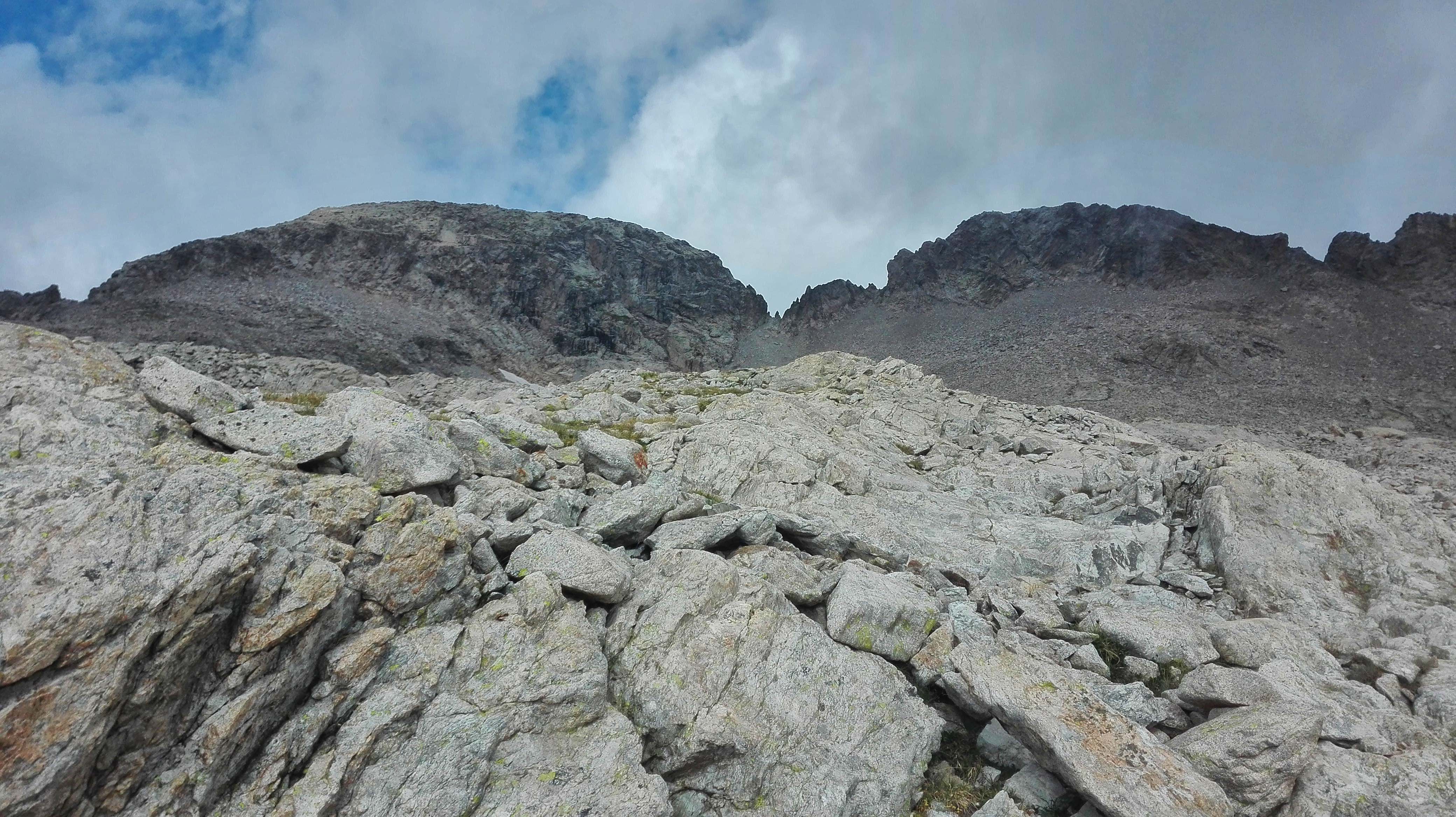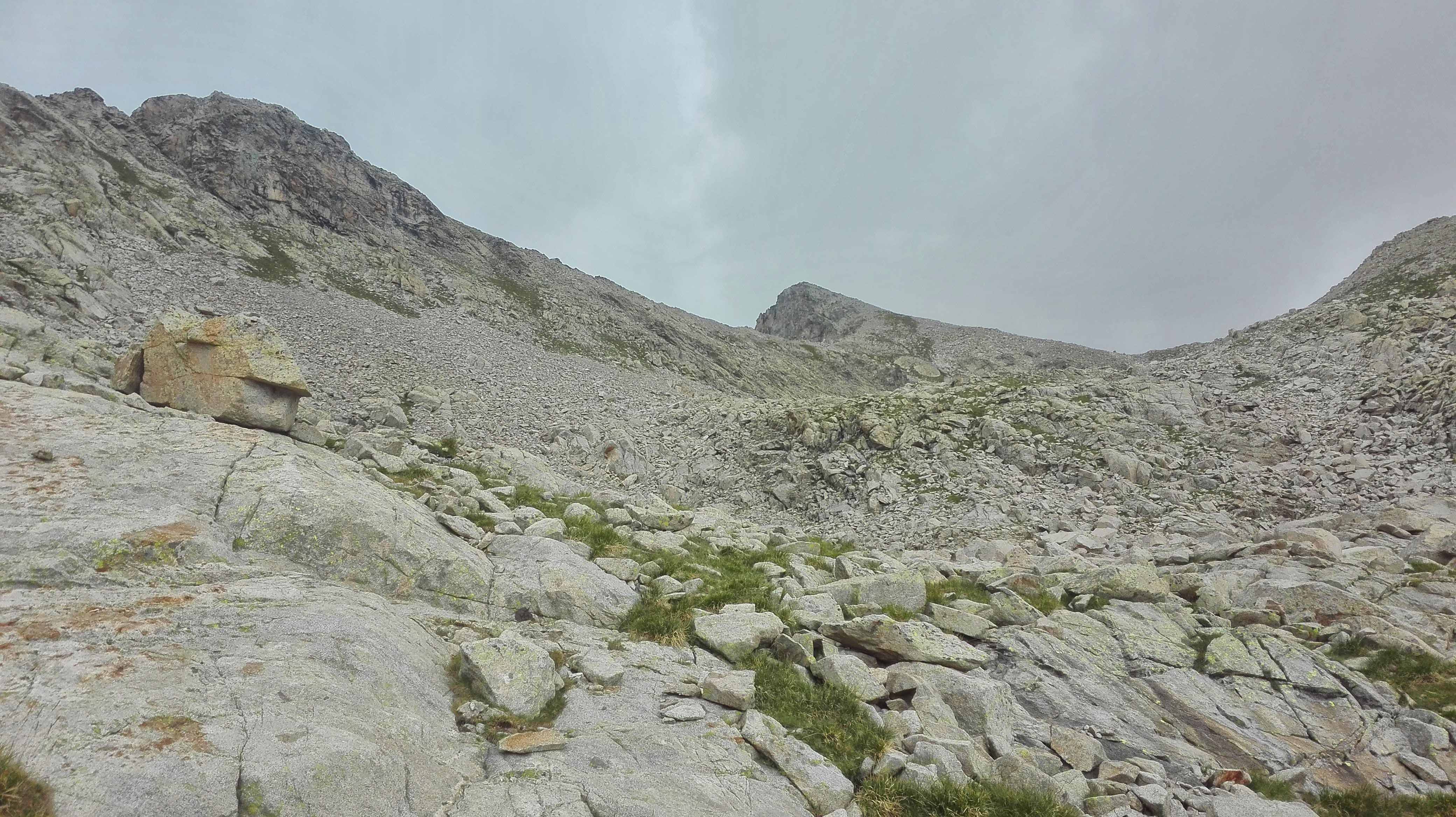 Empezamos a subir por la pedrera, formada por rocas de tamaño medio pero inmóviles en su mayor parte, lo que permite ascender con una relativa comodidad y guiándonos por hitos que aparecen muy esporádicamente. El islote rocoso que marca la mitad de la pedrera lo superamos por su izquierda, aprovechándonos de los tramos herbosos, para luego volver a la pedrera, que se va haciendo cada vez más incómoda.
