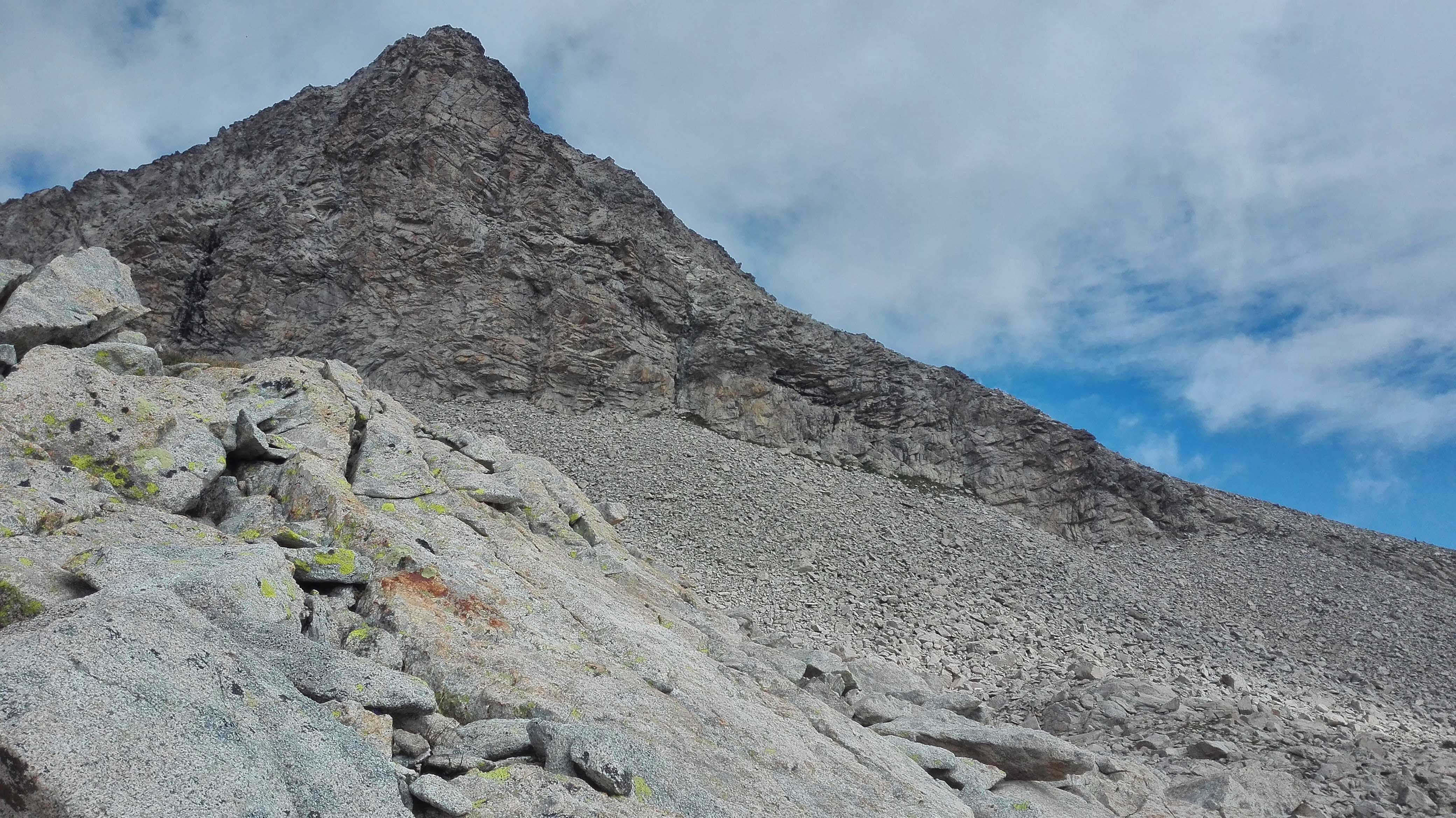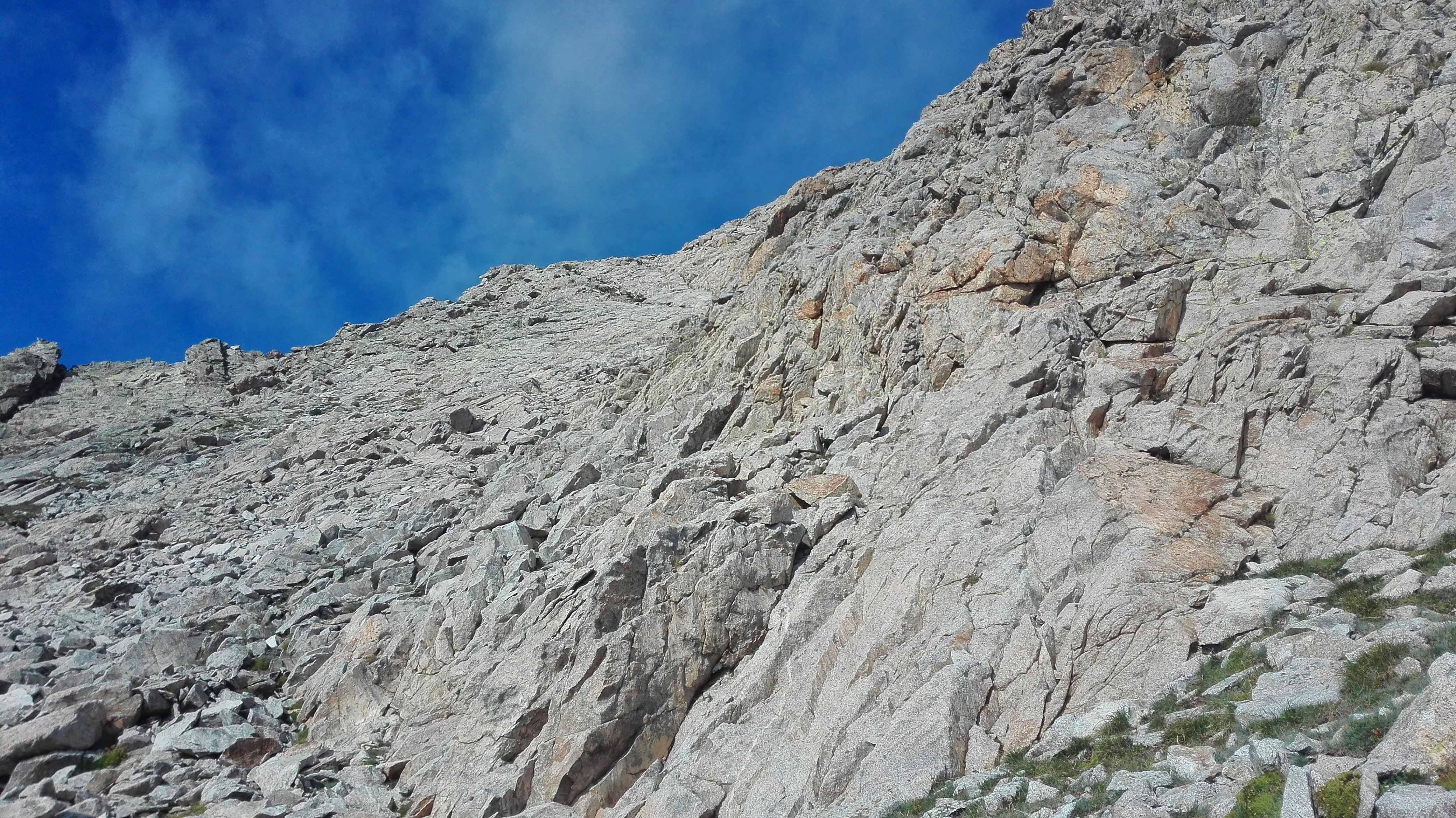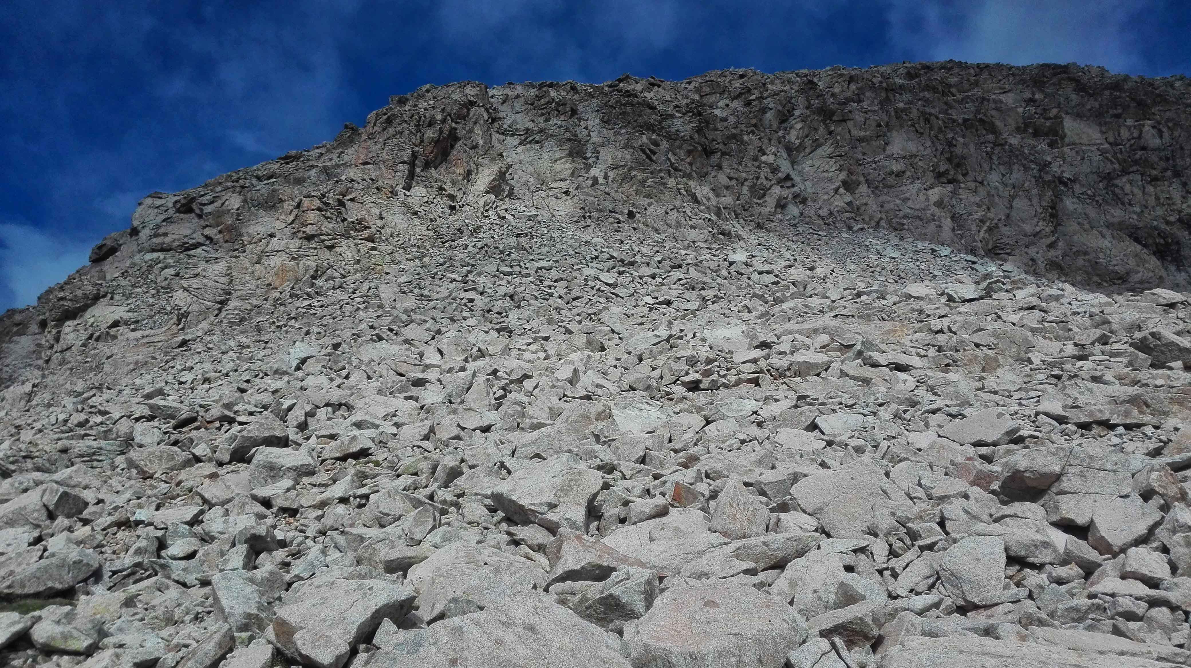 Empezamos a subir por la pedrera, formada por rocas de tamaño medio pero inmóviles en su mayor parte, lo que permite ascender con una relativa comodidad y guiándonos por hitos que aparecen muy esporádicamente. El islote rocoso que marca la mitad de la pedrera lo superamos por su izquierda, aprovechándonos de los tramos herbosos, para luego volver a la pedrera, que se va haciendo cada vez más incómoda.