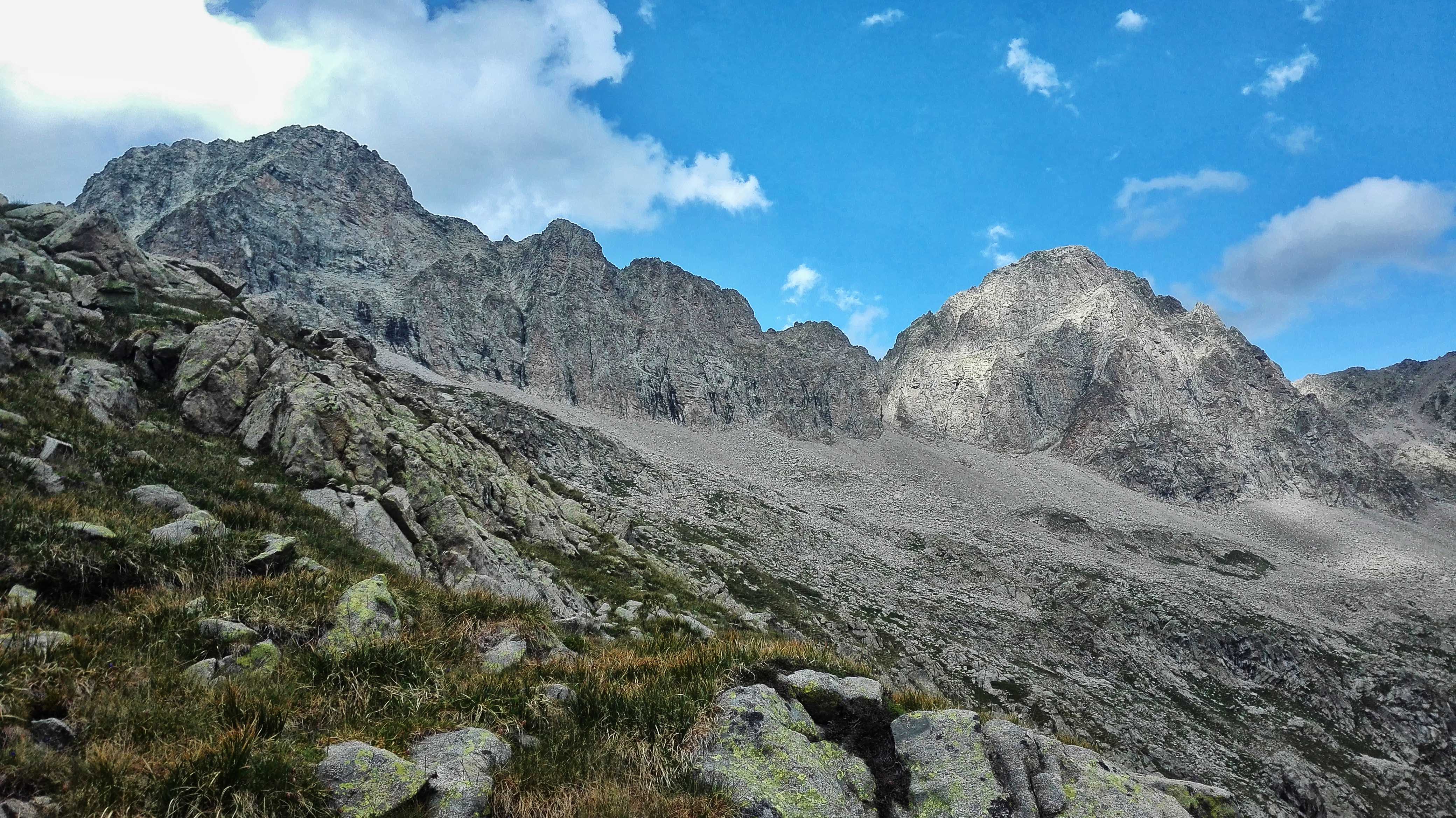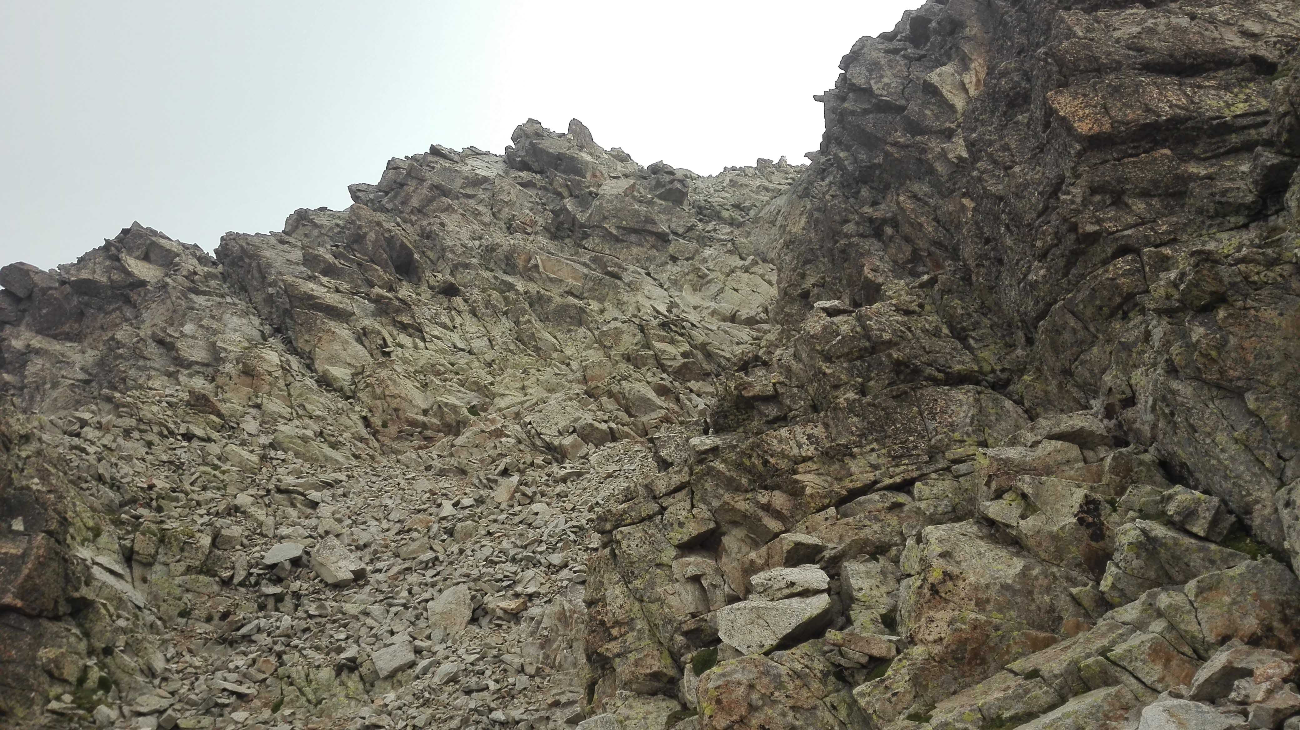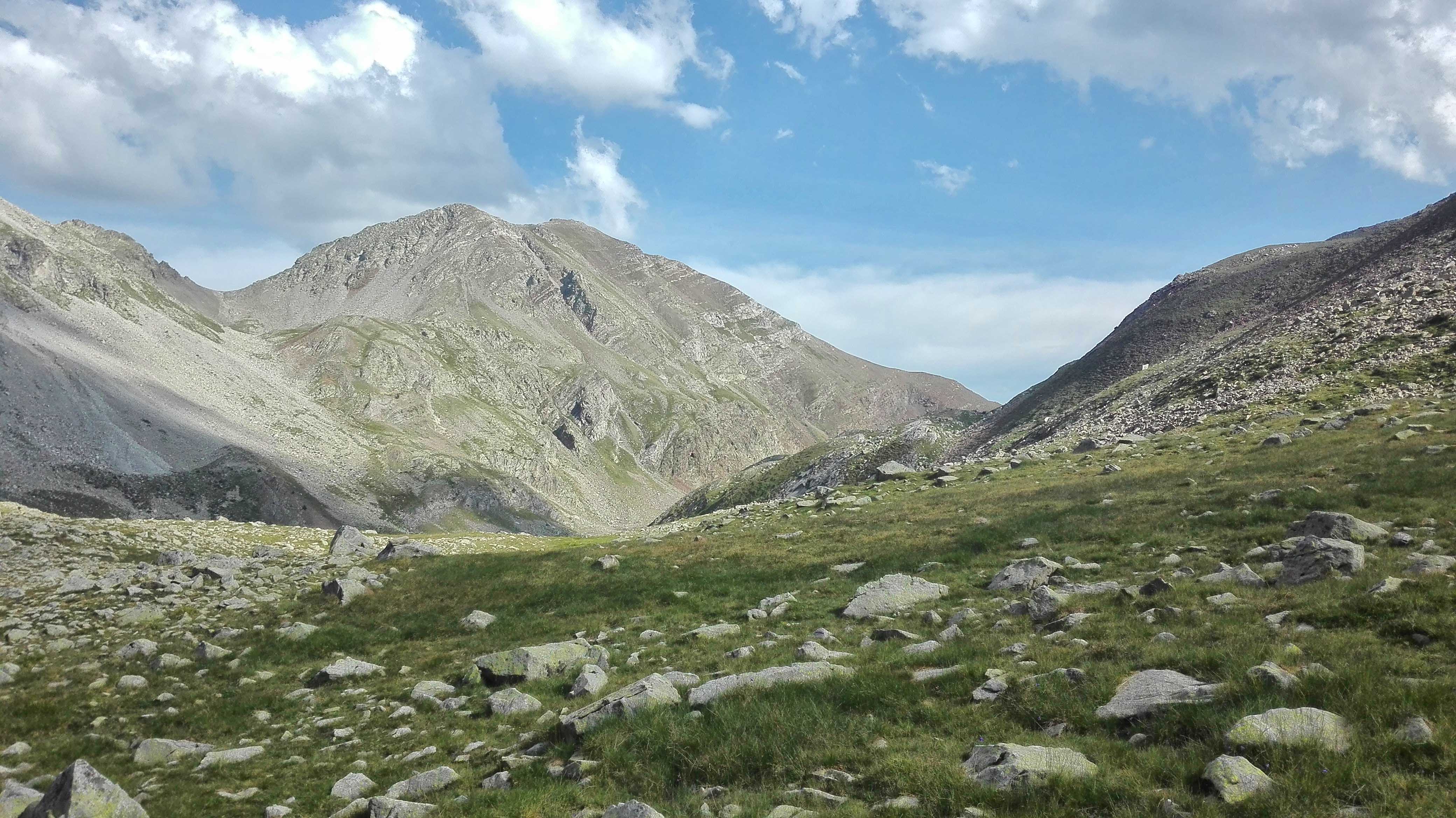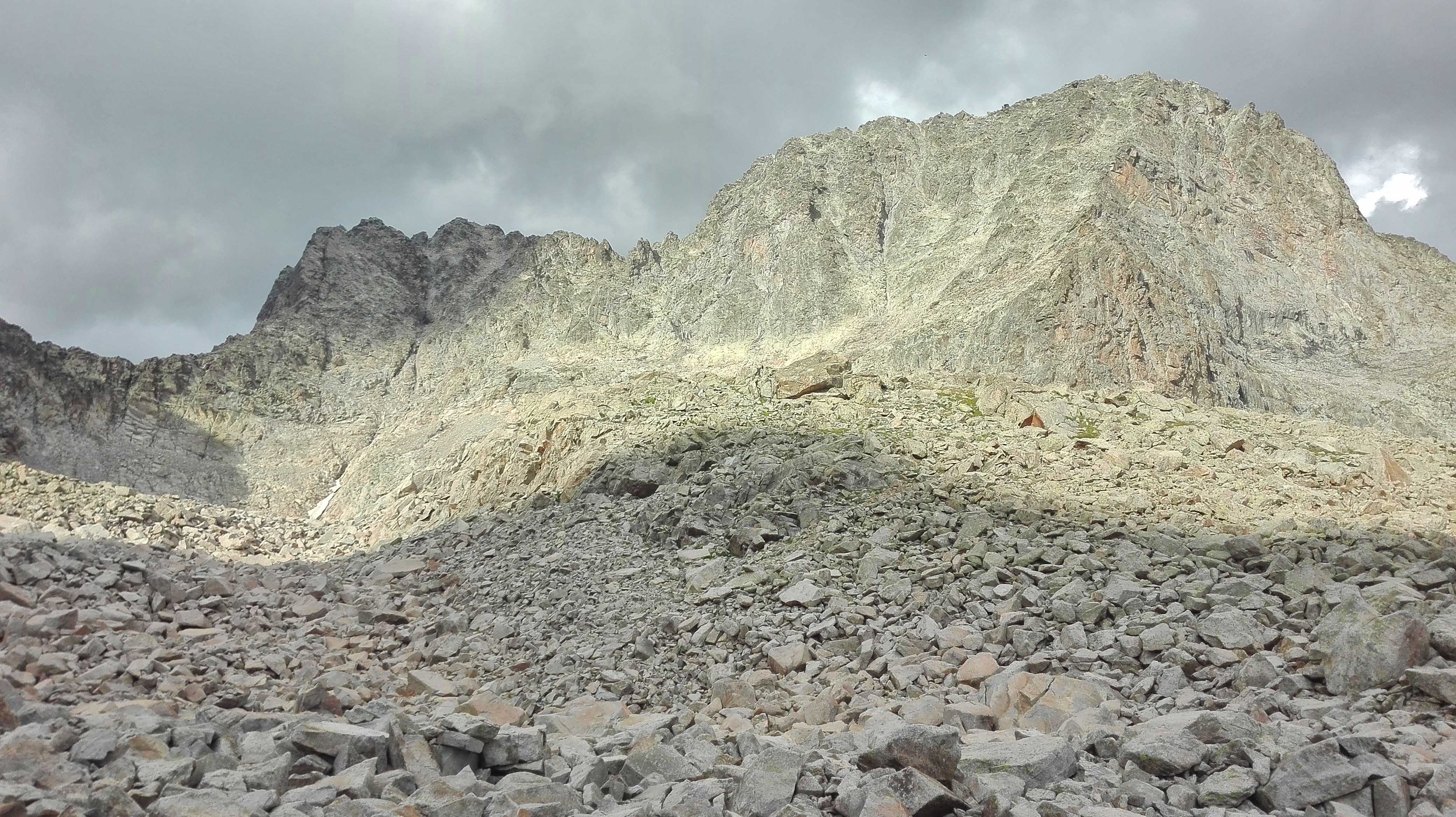Empezamos a subir por la pedrera, formada por rocas de tamaño medio pero inmóviles en su mayor parte, lo que permite ascender con una relativa comodidad y guiándonos por hitos que aparecen muy esporádicamente. El islote rocoso que marca la mitad de la pedrera lo superamos por su izquierda, aprovechándonos de los tramos herbosos, para luego volver a la pedrera, que se va haciendo cada vez más incómoda.
