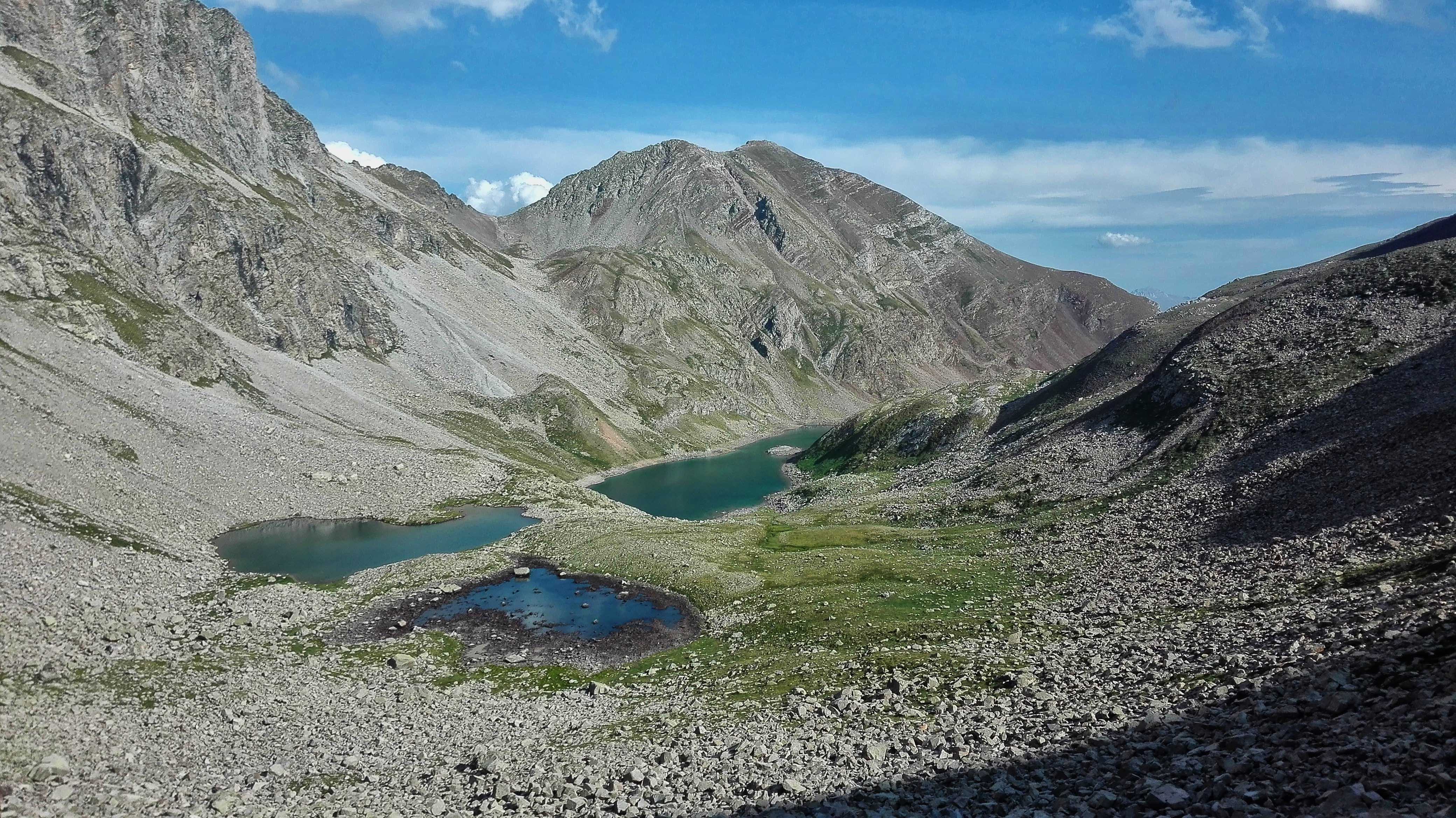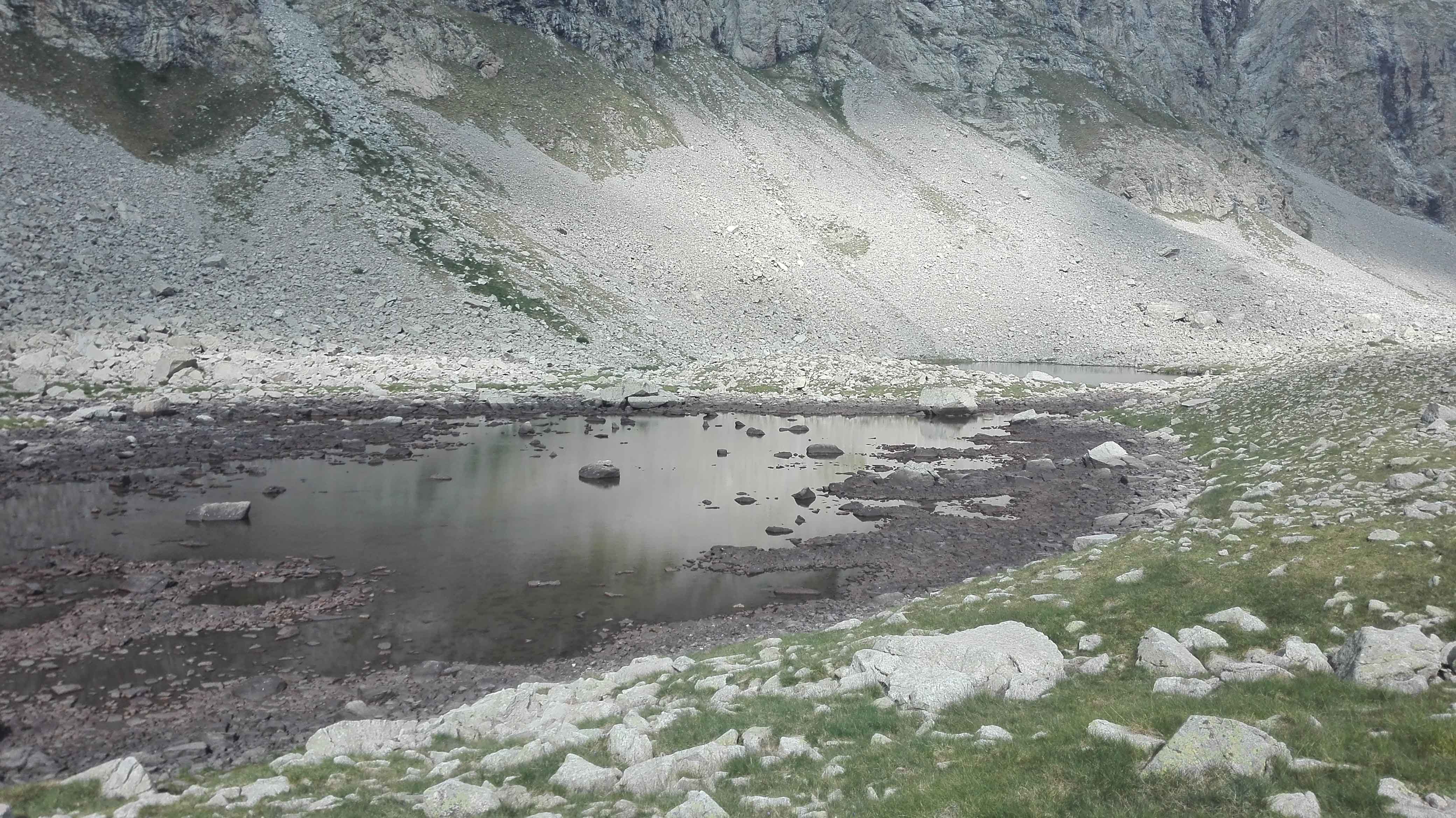 Siguiéndolo, vamos acercándonos al muro que marca el final del Valle de Barbarisa, que debemos superar y que queda justo encima de los Ibonets de Barbarisa, donde debemos llegar en primer lugar. El camino finaliza justo al llegar a ellos, desde donde vemos el Ibón de Barbarisa detrás de nosotros, de mucho mayor tamaño y de forma alargada. En la foto, los ibones superiores de Barbarisa, casi secos.