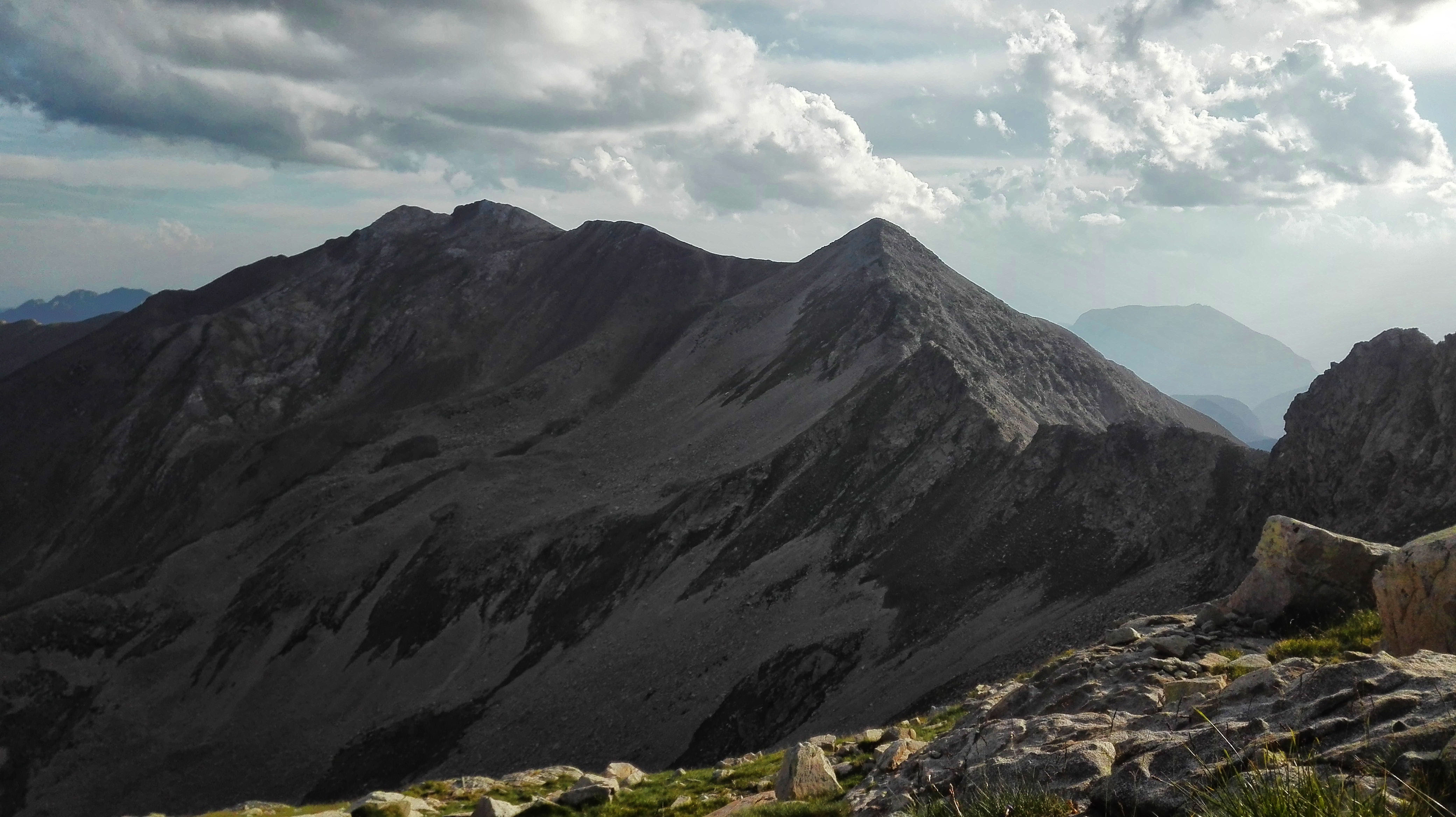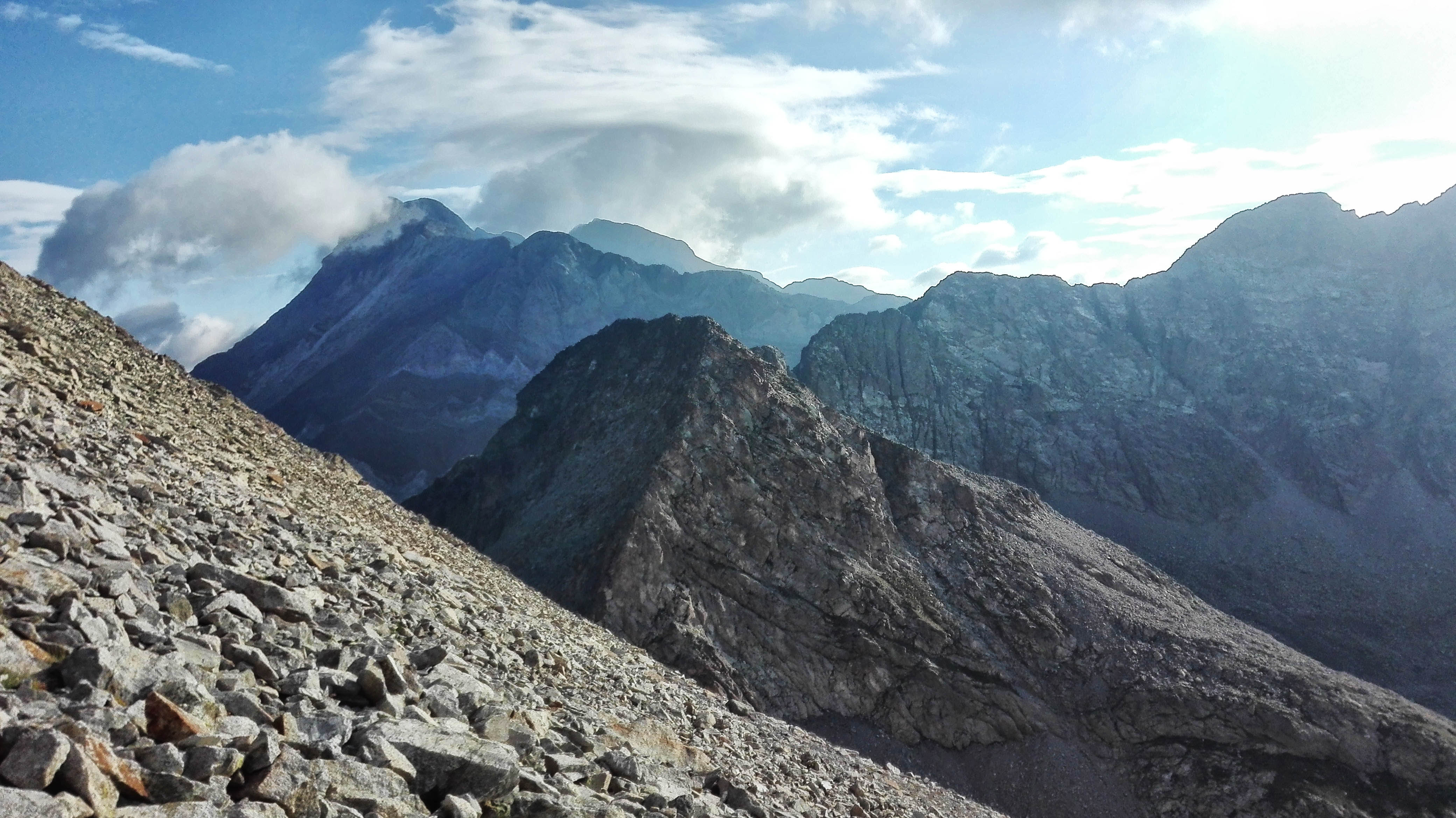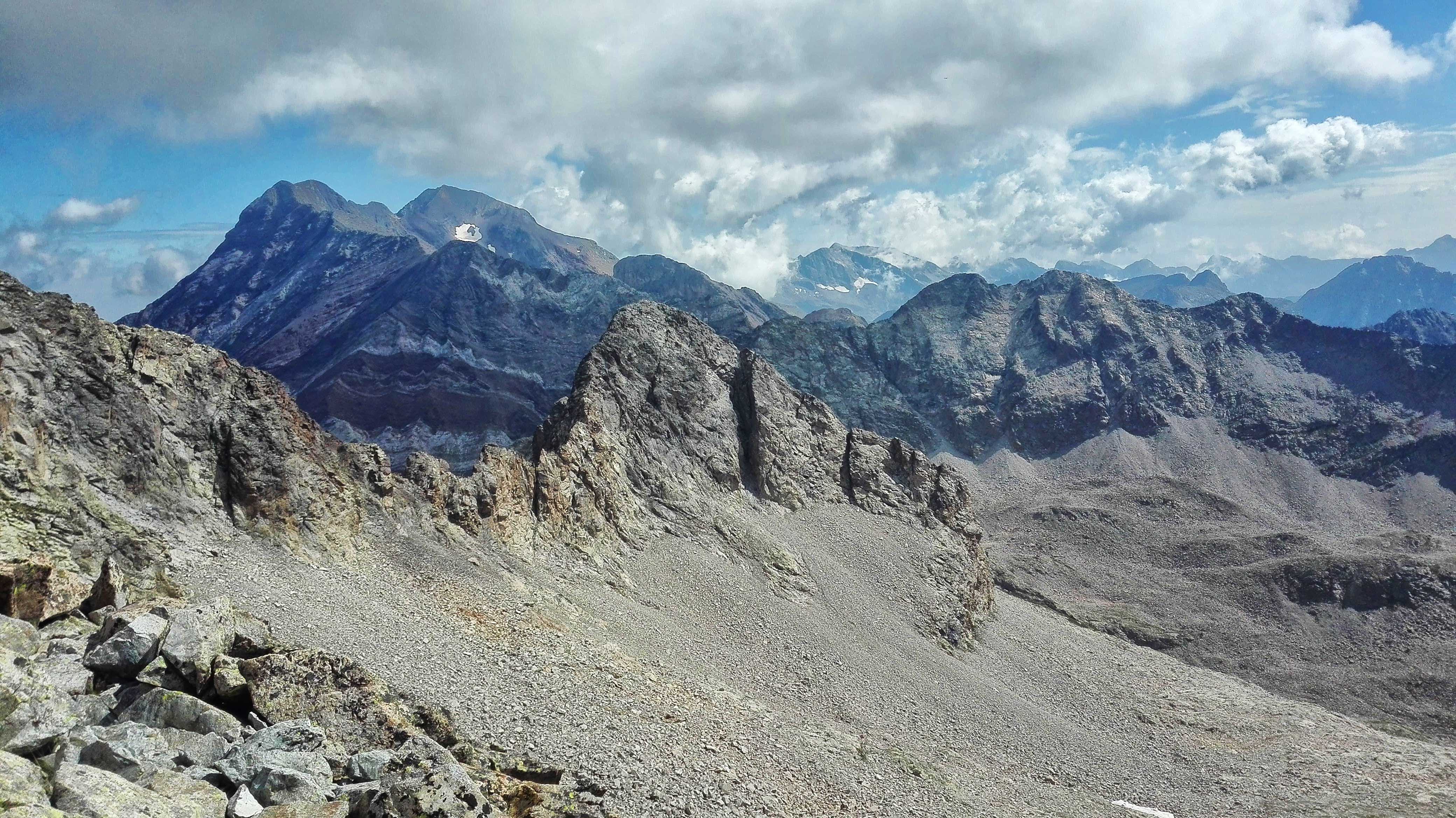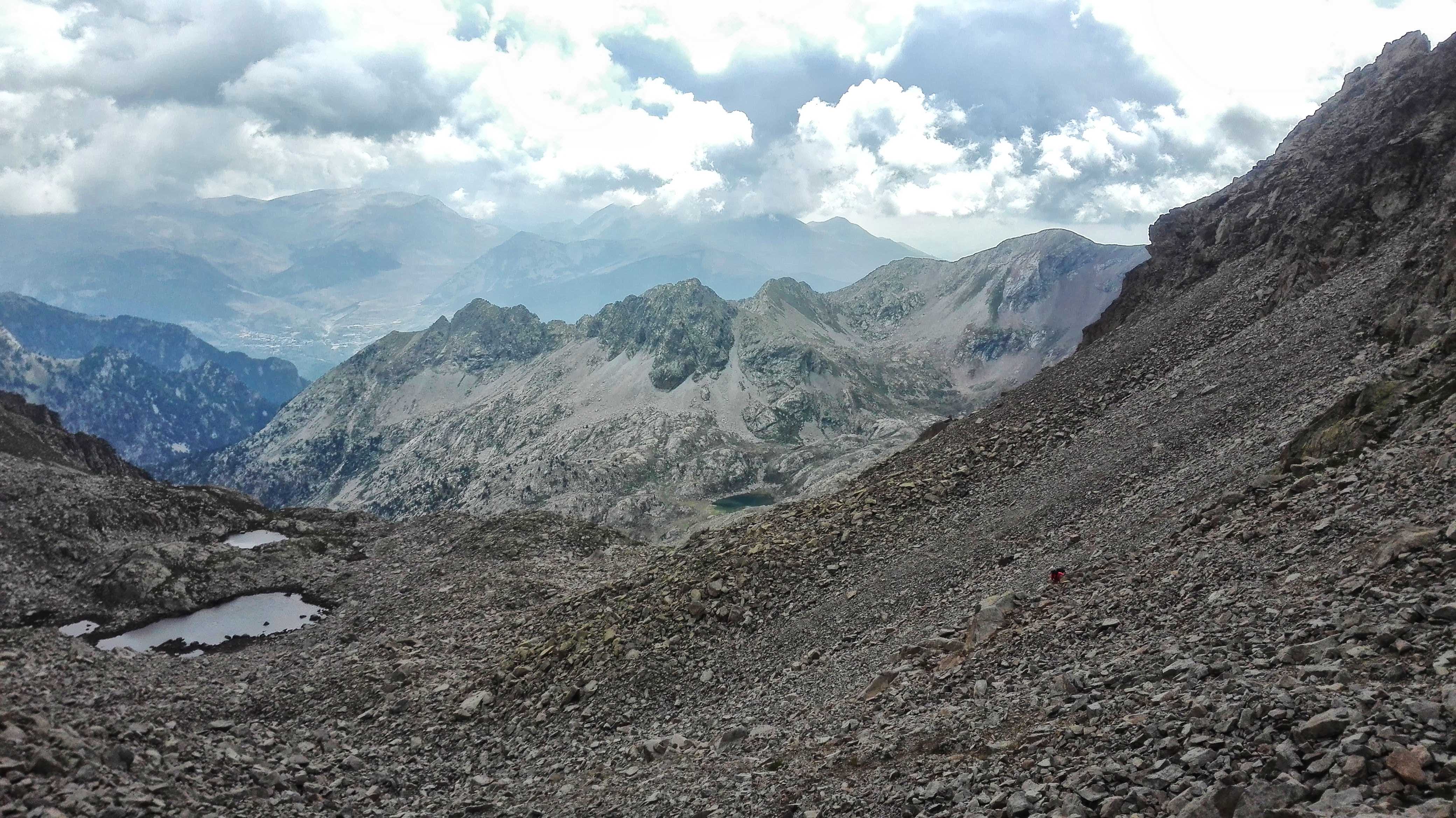 Desde allí, podemos unirnos a la vía normal que viene del collado de Millares, que va por la arista NE y que según parece es bastante sencilla. Pero para llegar ahí tenemos que cruzar la abominable pedrera que tenemos frente a nosotros por lo que preferimos buscar una alternativa. Las vistas sobre el dúo Espadas-Posets ya son formidables desde aquí.