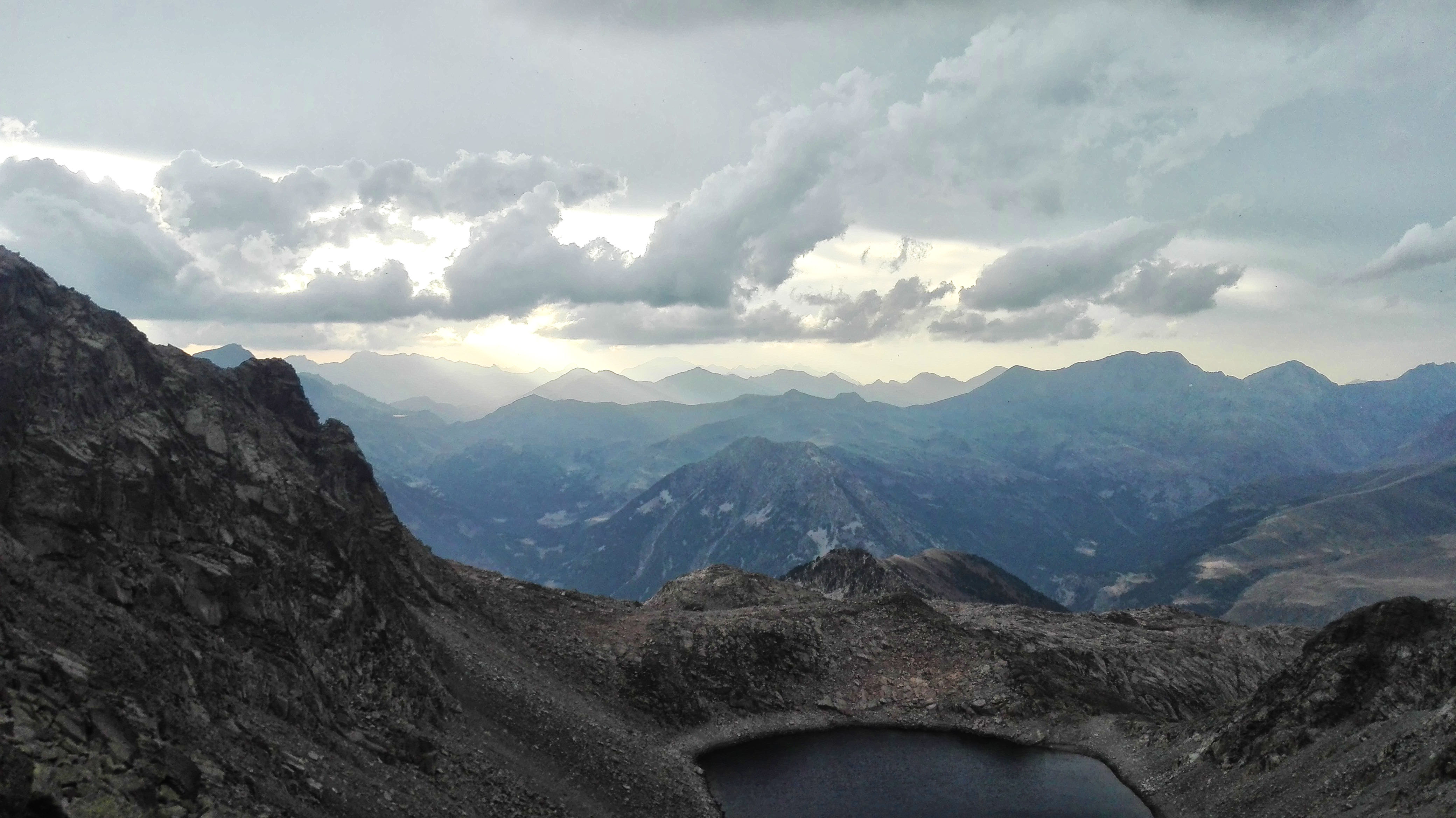 Una vez encontrado un lugar más o menos llano y con hierba (debe ser el único) para dormir, vamos a la Porteta de l’Infierno para ver la puesta de sol, que se va escondiendo entre las nubes que adornan el día y que no nos dan mucha visibilidad pero que añaden belleza al panorama. Al otro lado de la Porteta, el otro Ibón Chelau, con el Bachimala, los Culfreda y la Munia en el horizonte.