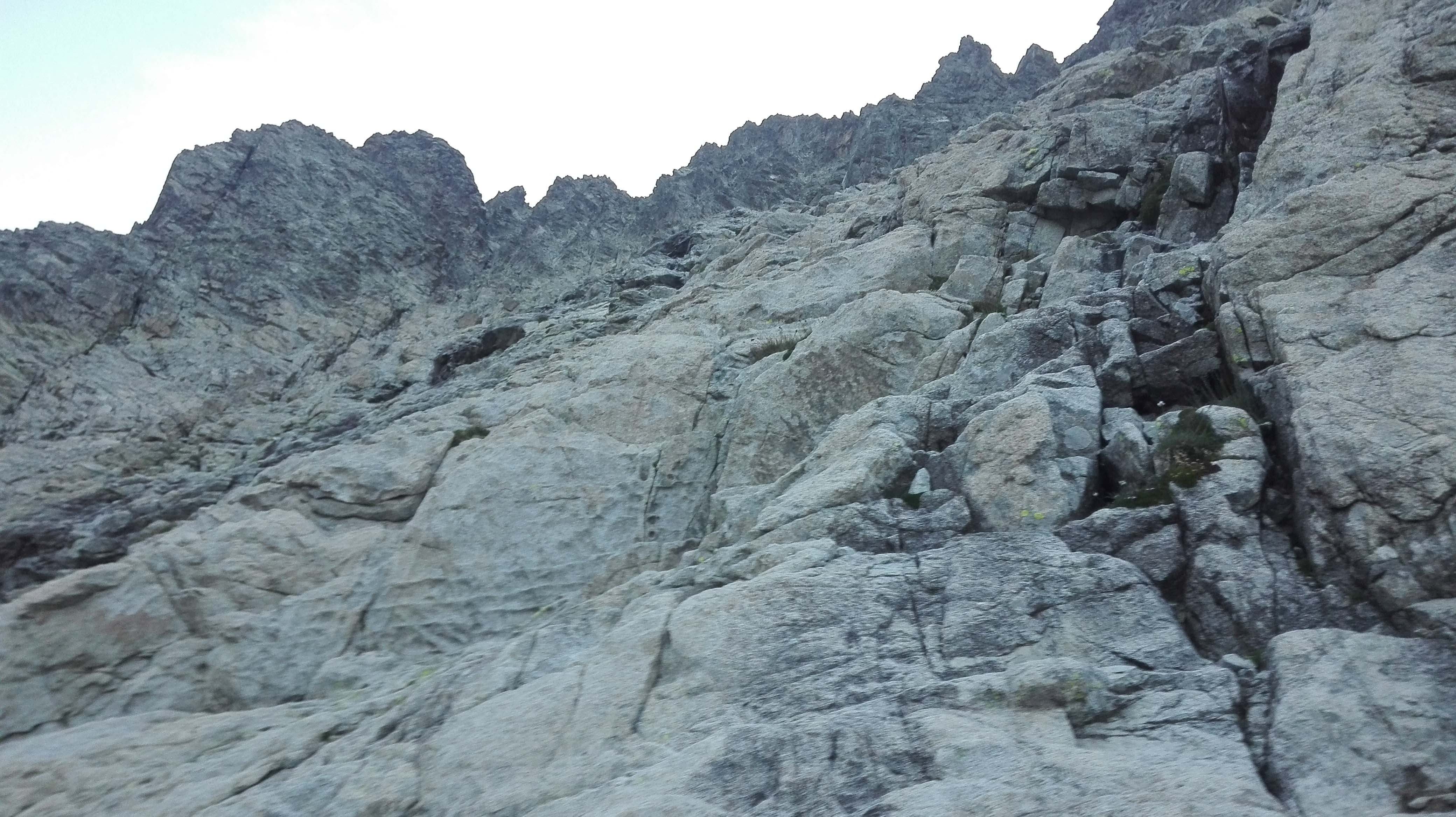 A partir de allí, y con terreno de igual comodidad, ascendemos hasta la base de la pared del Eriste Sur. A pesar de que sabemos que hay que ascender por una de las canales de la izquierda y que la ascensión es fácil, no sabemos ver ninguna canal sencilla para ascender. Un servidor sube por una canal que tiene un paso al principio muy vertical y expuesto pero con buenos agarres.