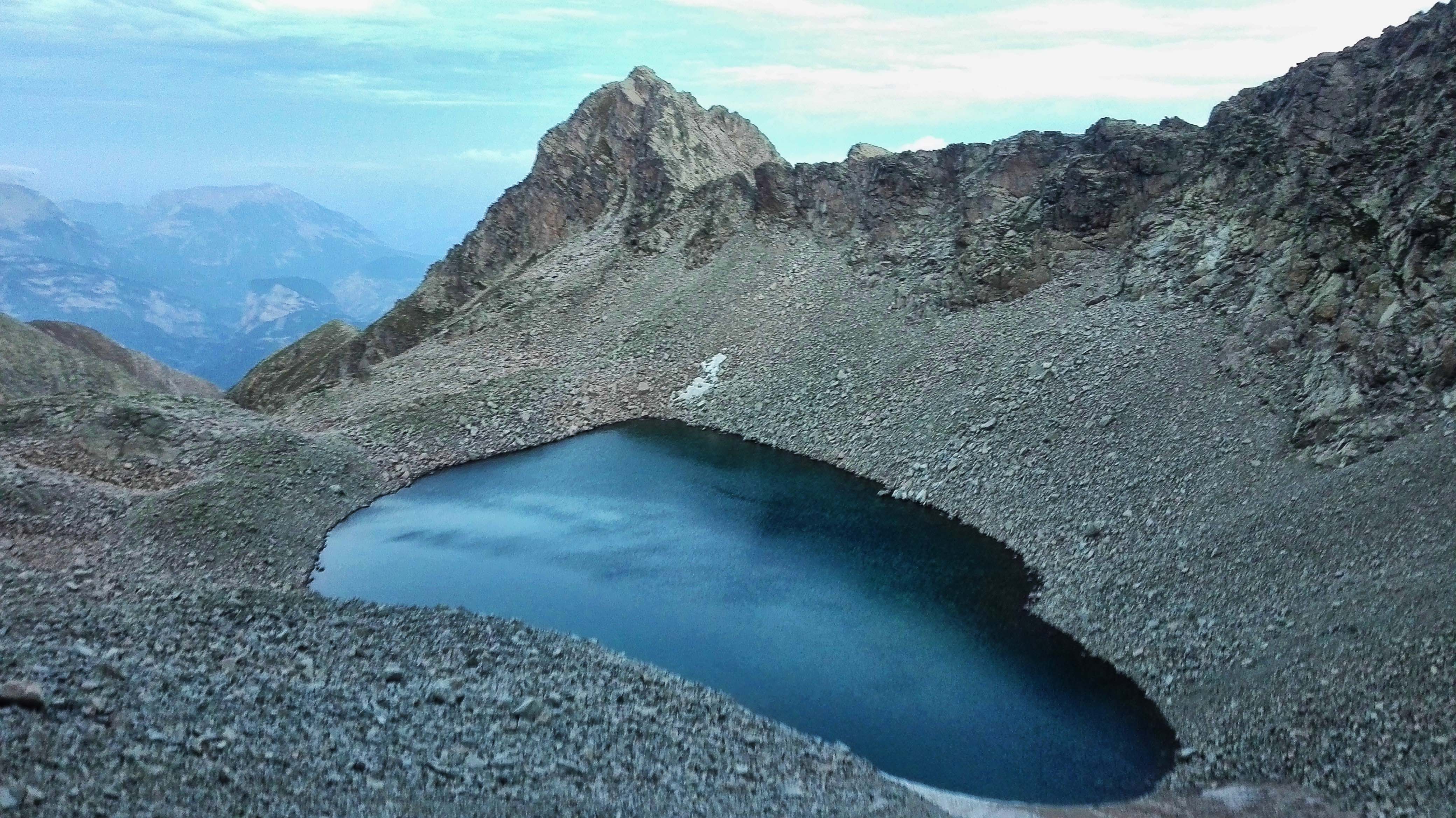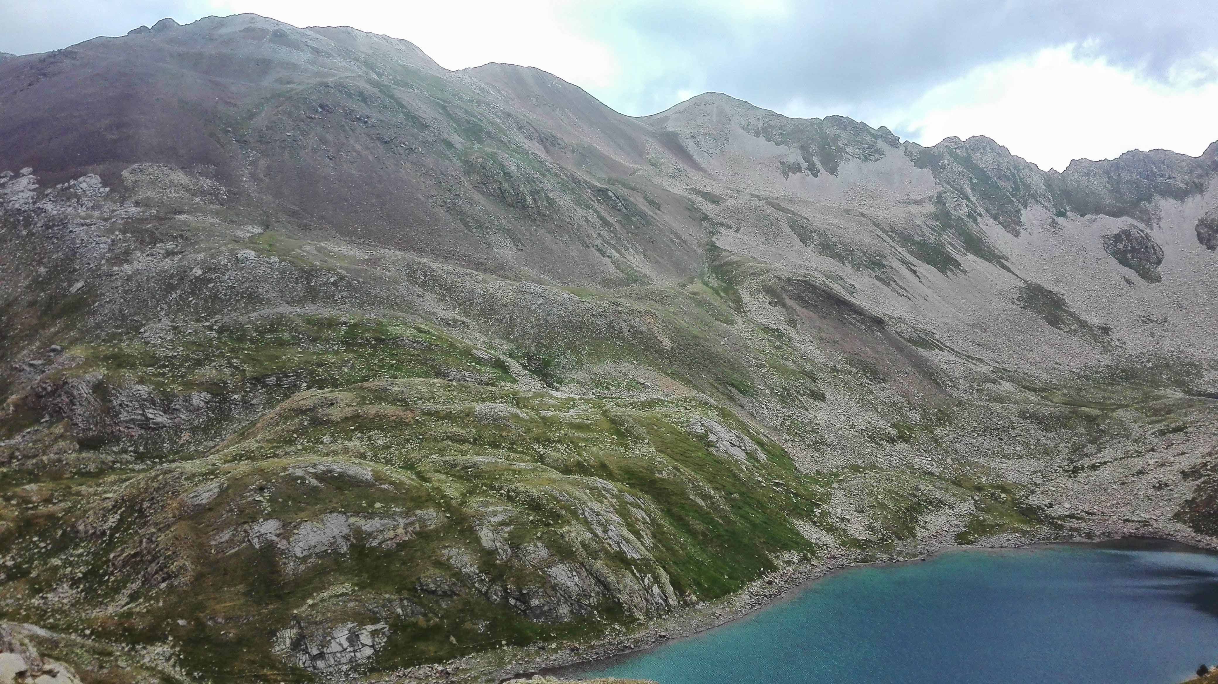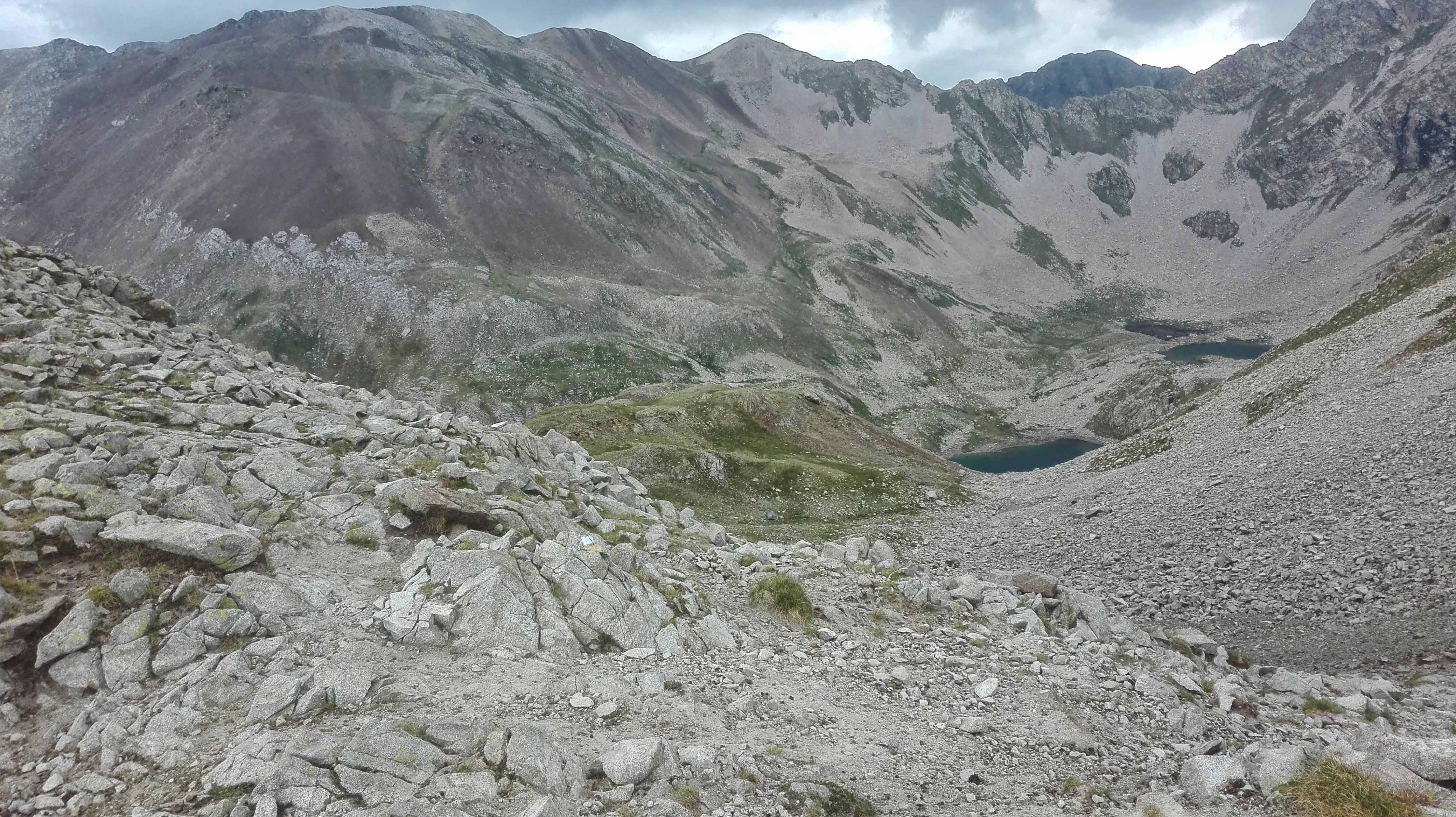 Llegamos a un pequeño ibón que dejamos a nuestra izquierda y seguimos descendiendo por la pedrera.
