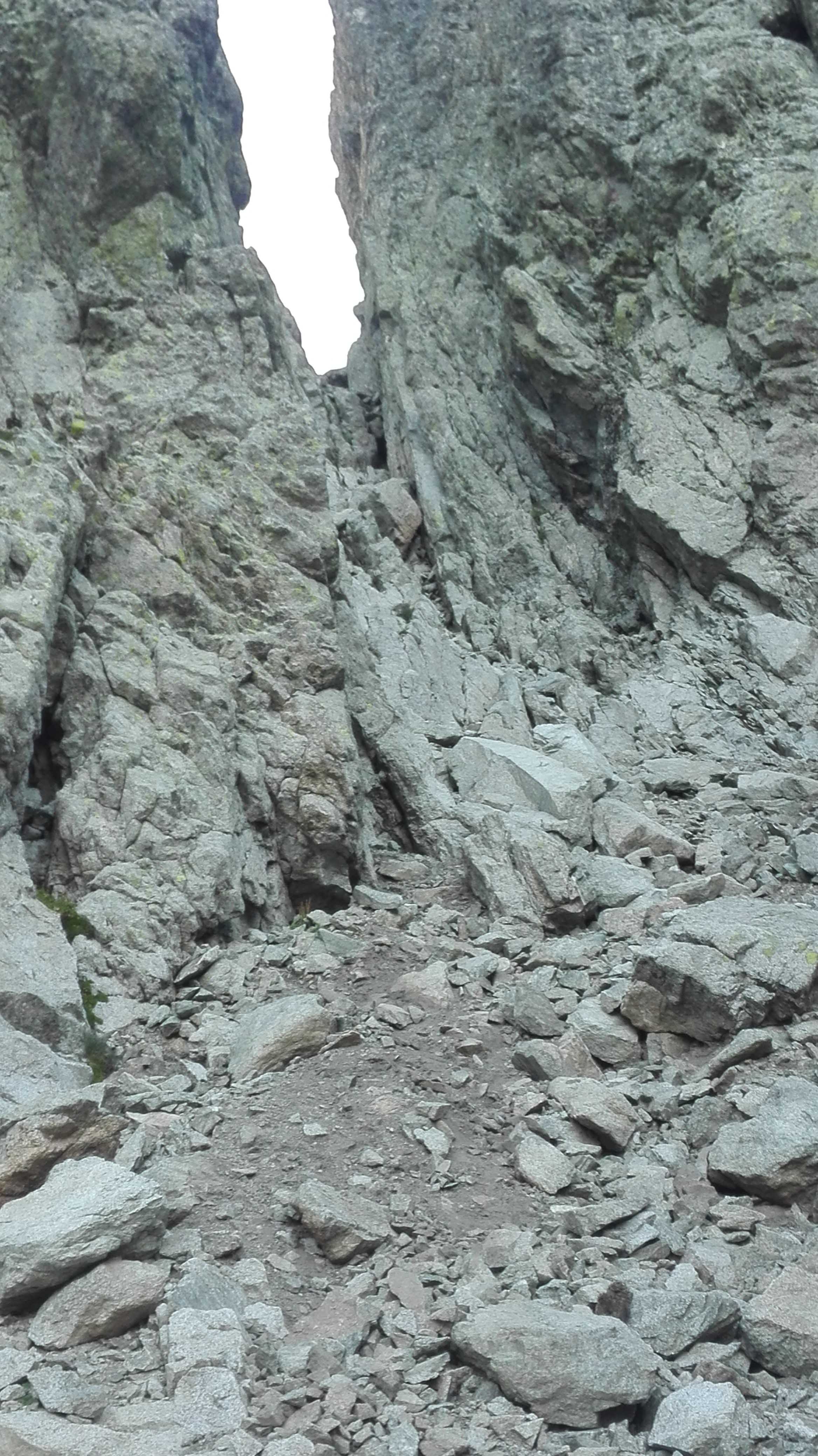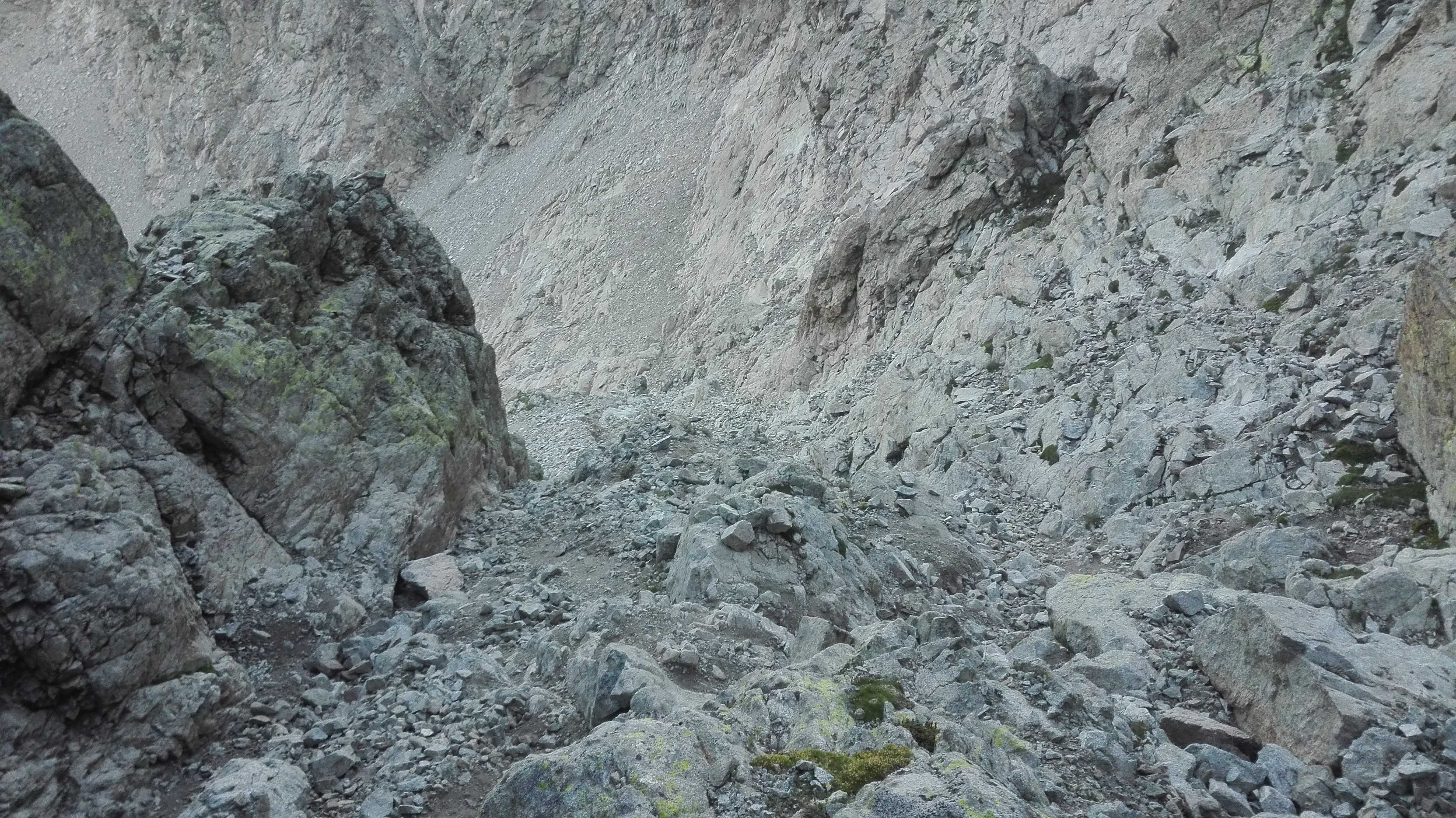 Para ascender al Eriste Central o Gran Pico de Eriste, el más alto de los tres, bajamos unos metros hasta que podemos desviarnos a la izquierda para luego volver a subir a una brecha muy cercana y de altura superior. Canaleta de acceso a la brecha superior.