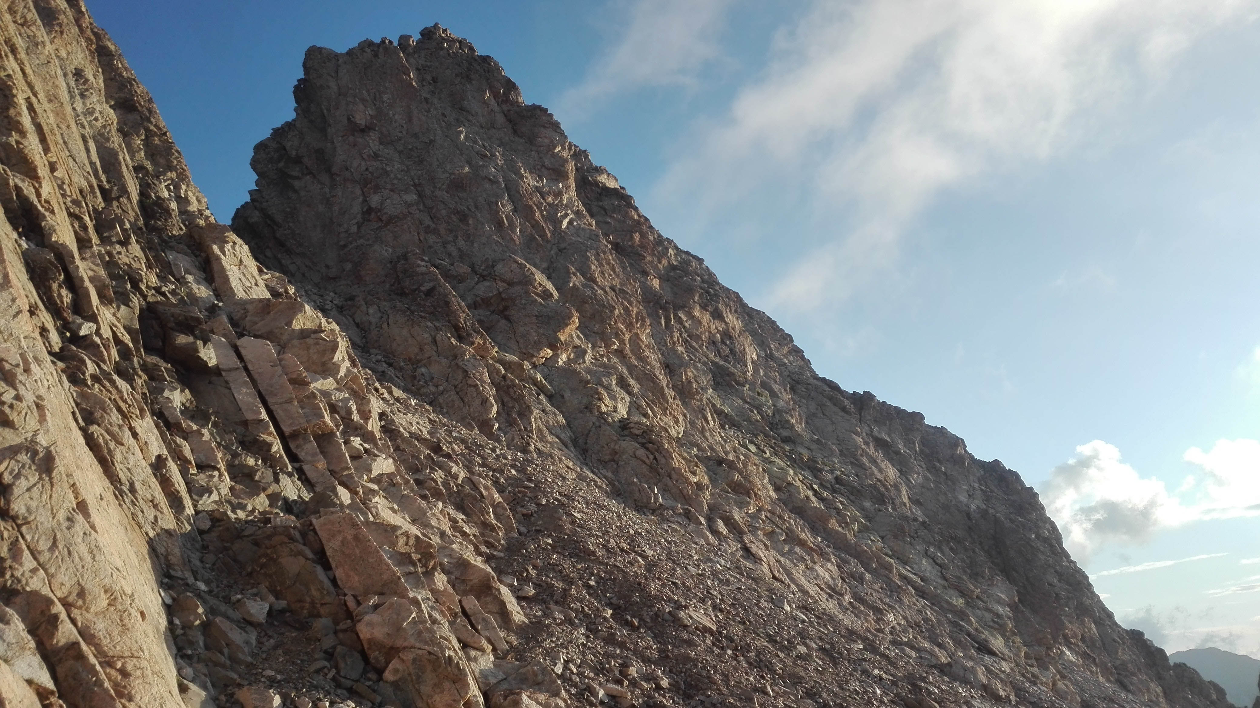 Por la mencionada pedrera, preferimos ir directamente hacia el pico, acercándonos a su arista SE, que vista desde aquí no parece tampoco muy complicada pero que implicará trepar bastante más.