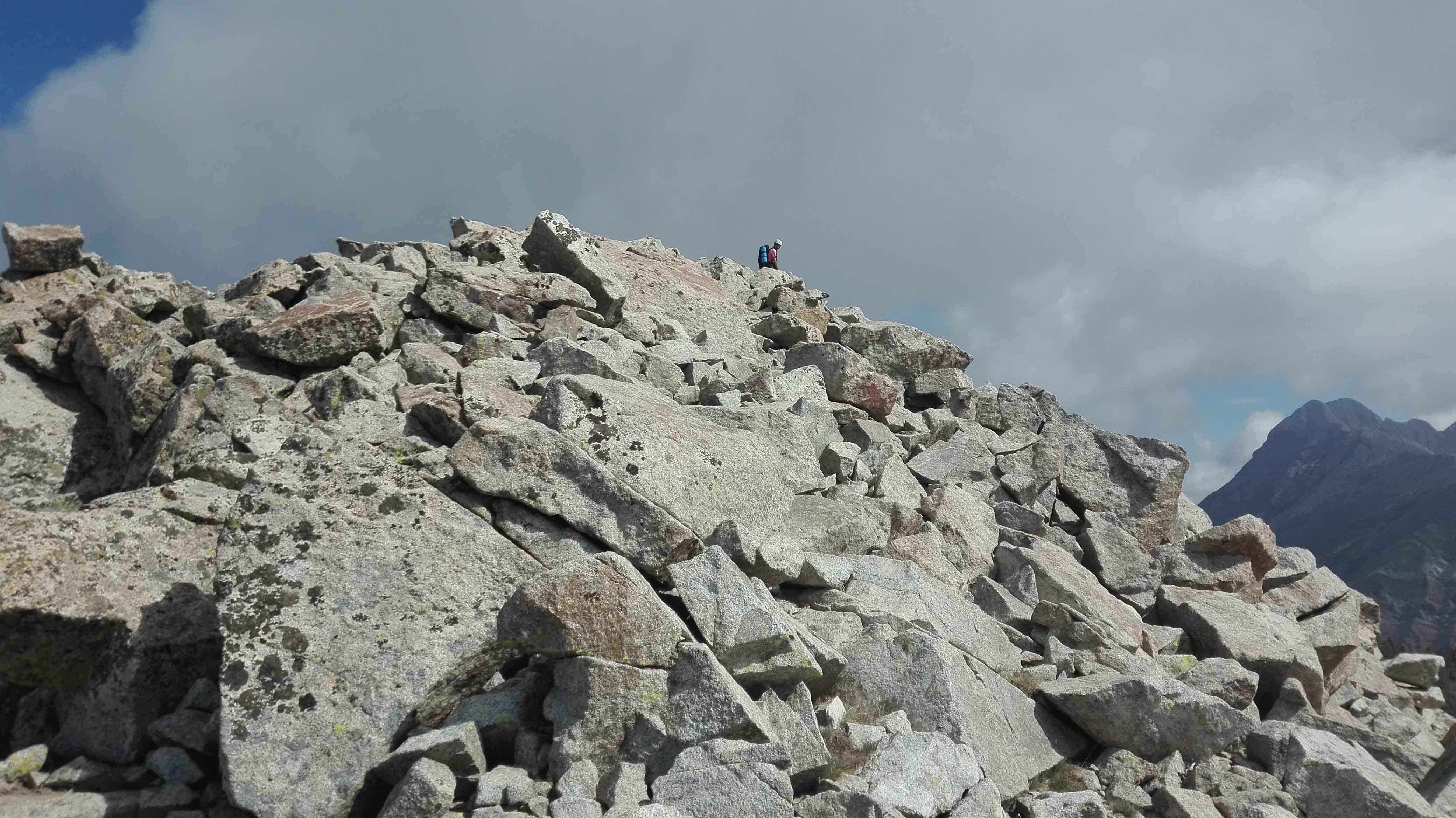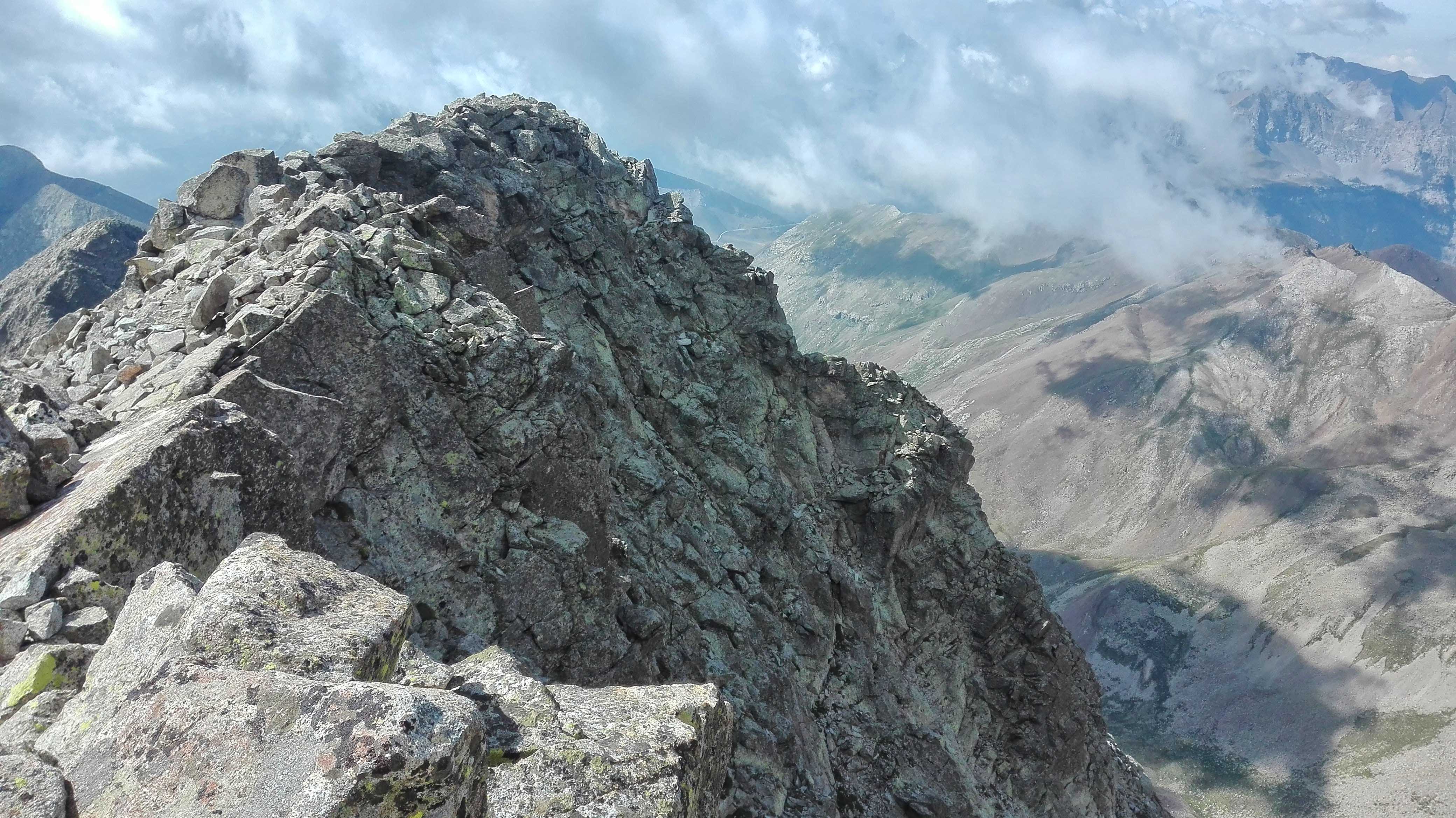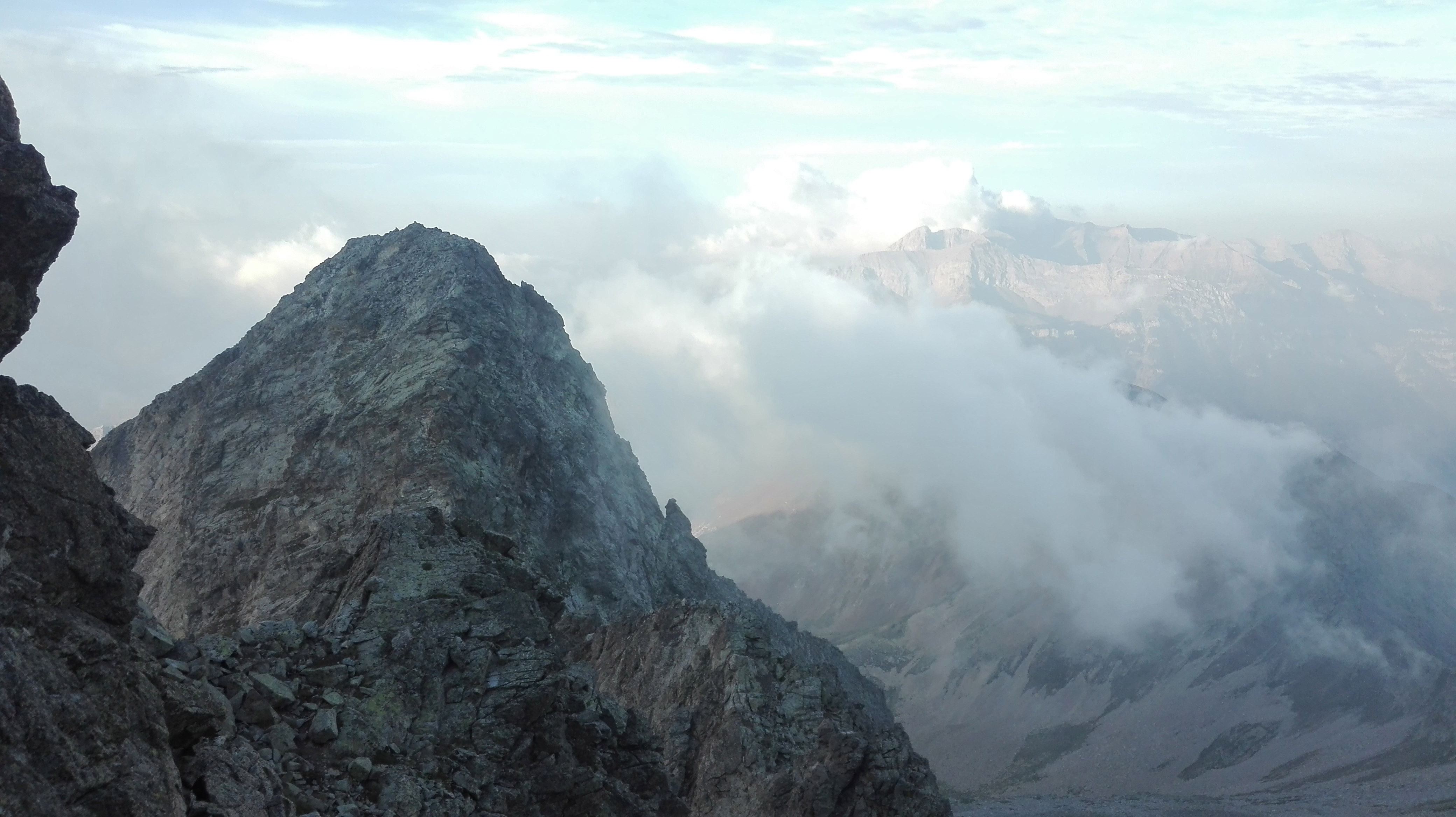 Pero justo cuando llegamos a la cumbre del Gran Pico de Eriste, las nubes entran y reducen nuestro campo de visión a apenas pocos metros. Por la mala visibilidad y el frío, apenas estamos unos minutos arriba y nos volvemos para abajo, una lástima.