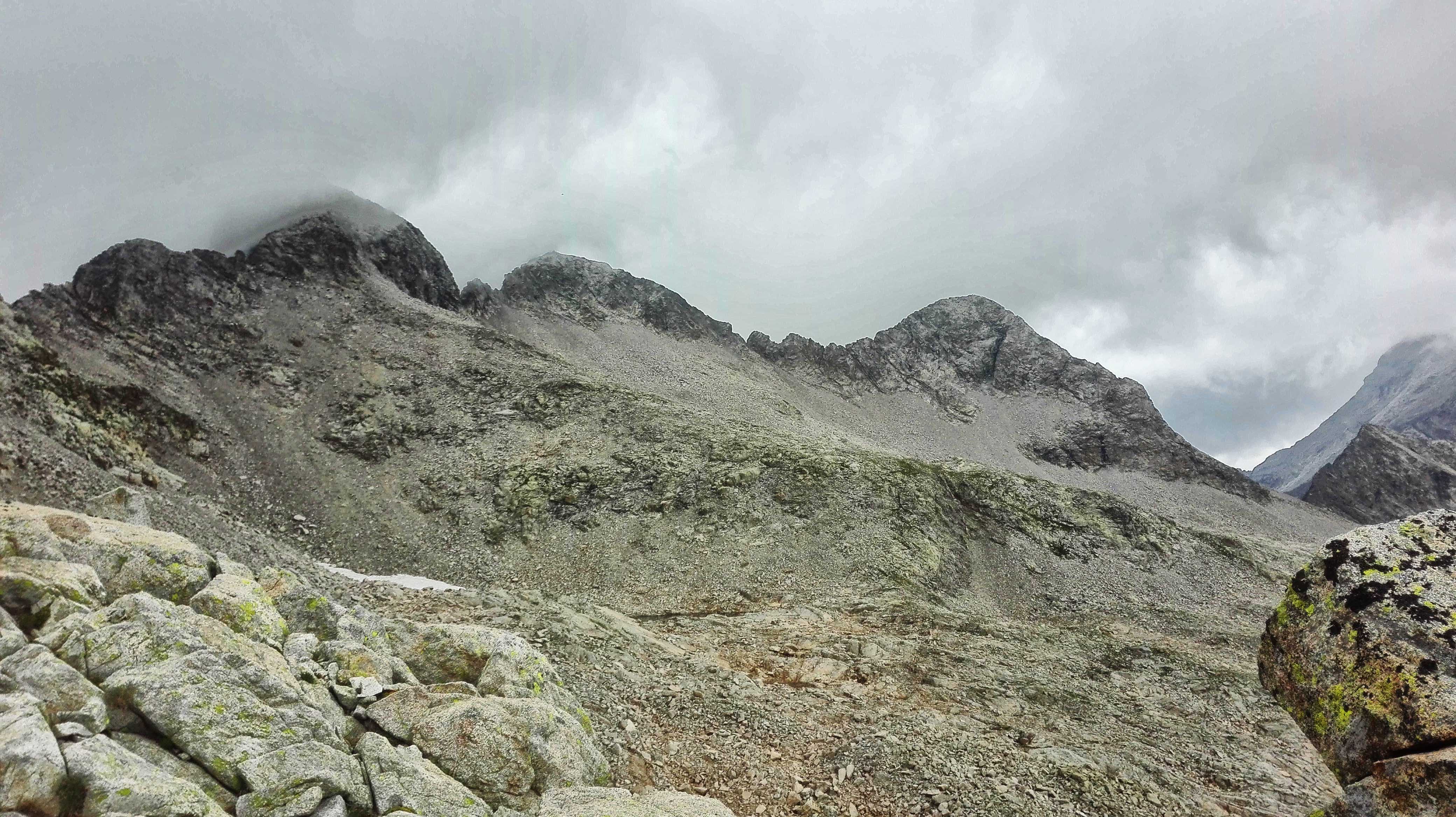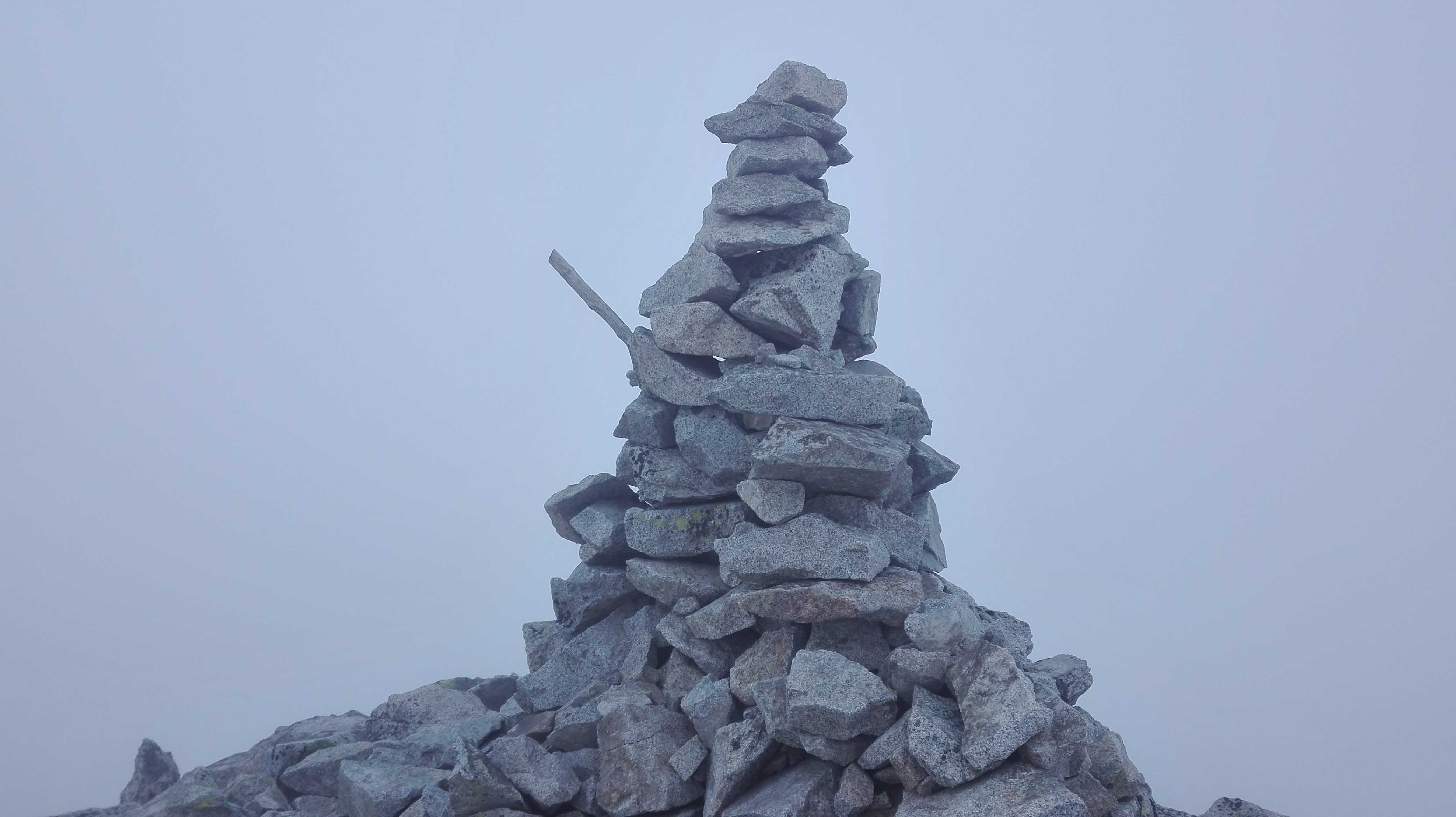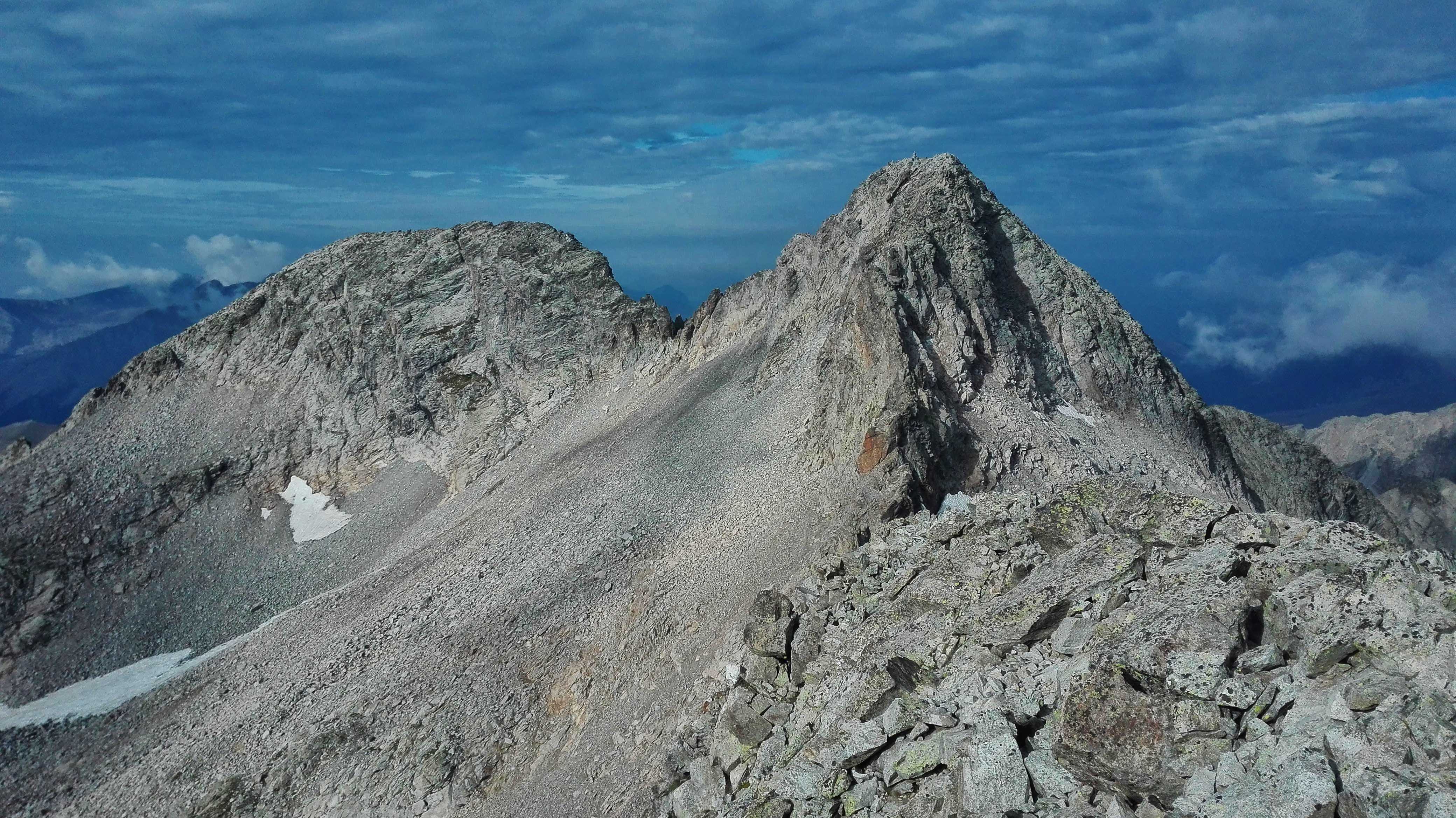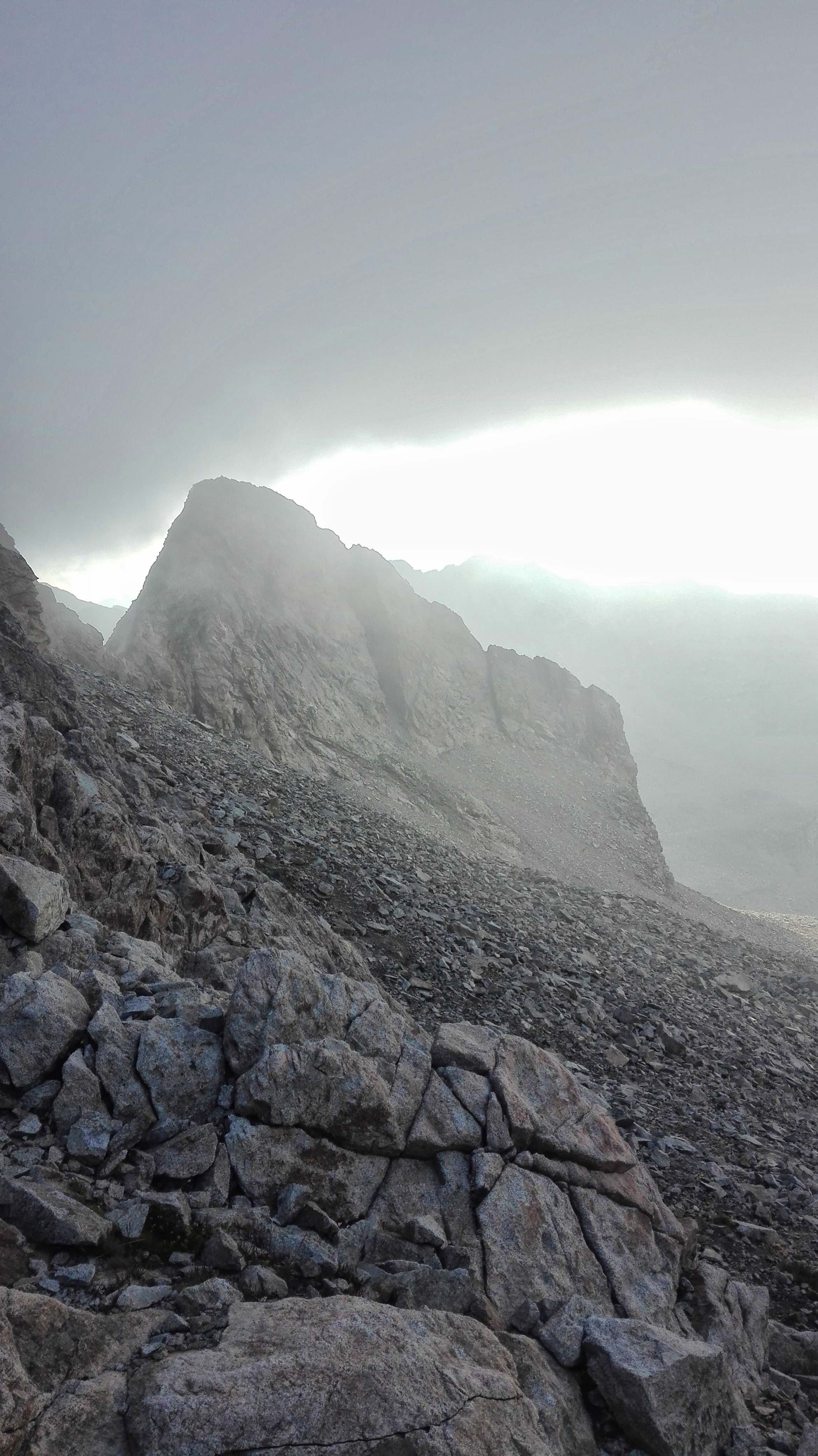 Pero justo cuando llegamos a la cumbre del Gran Pico de Eriste, las nubes entran y reducen nuestro campo de visión a apenas pocos metros. Por la mala visibilidad y el frío, apenas estamos unos minutos arriba y nos volvemos para abajo, una lástima.