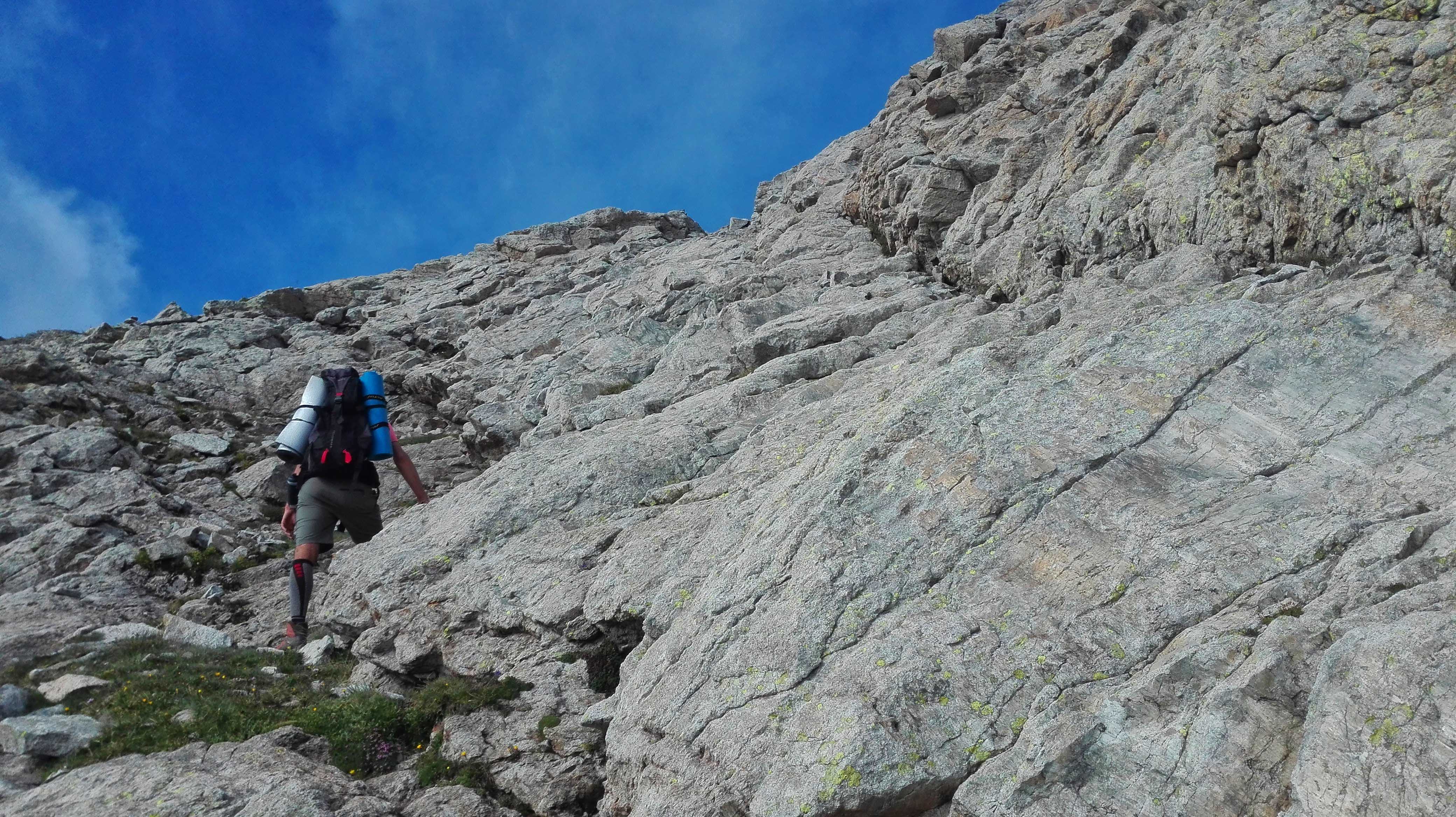 Empezamos a subir, primero por la pedrera pero rápidamente entrando en roca firme y terrenos de trepada. La roca es muy buena y a pesar de que hay algún paso bastante vertical y aéreo, se sube con cierta facilidad. Hay pasos de segundo grado de manera continuada pero no pasan de ahí. Alternamos tramos de andar con trepadas.