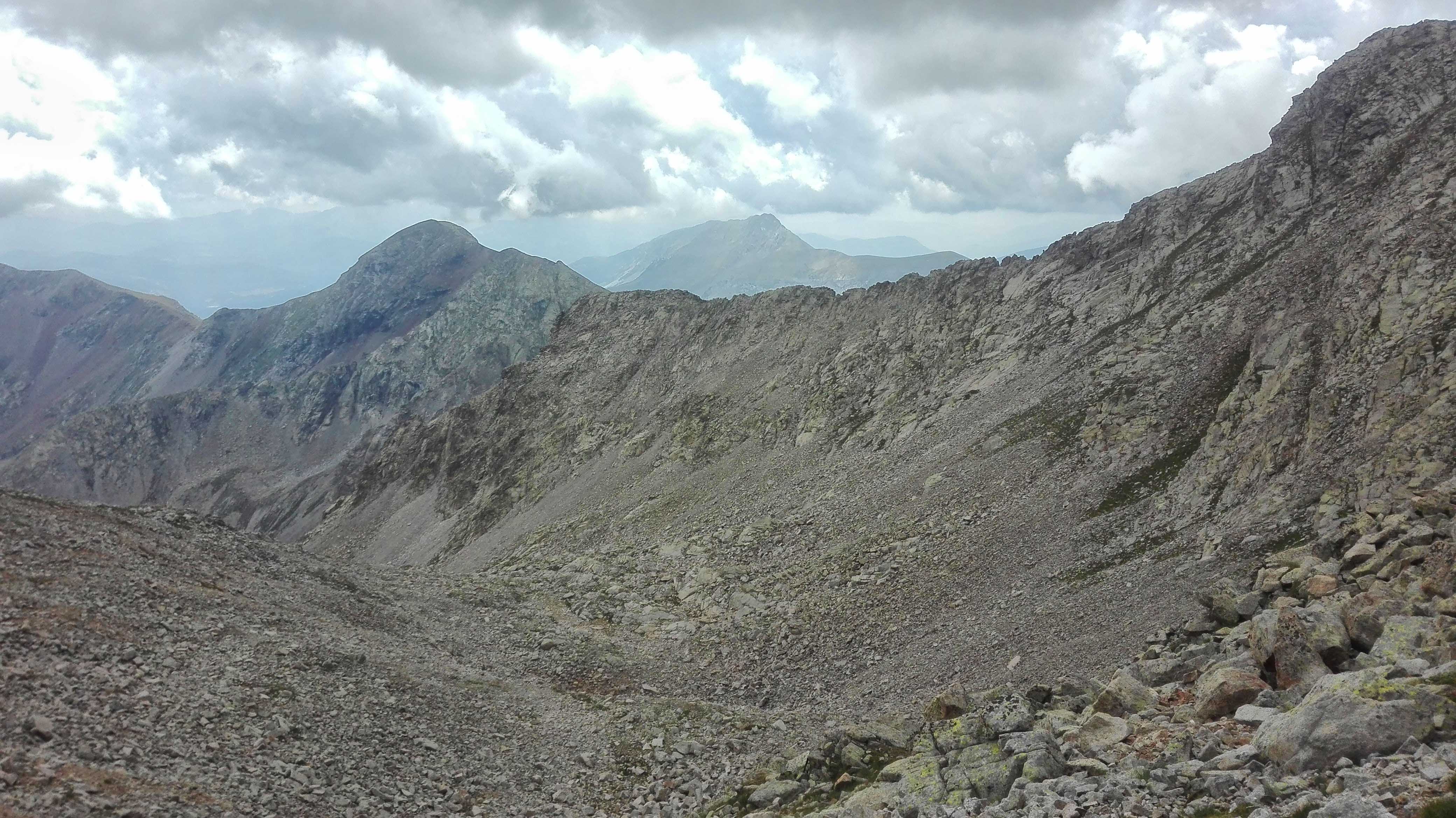 En el Paso de la Gralla, nos recibe el sol de mañana y vemos la desoladora planicie pedregosa de Bagüeña al otro lado. Vista desde el paso al diente del Gran Pico de Eriste.