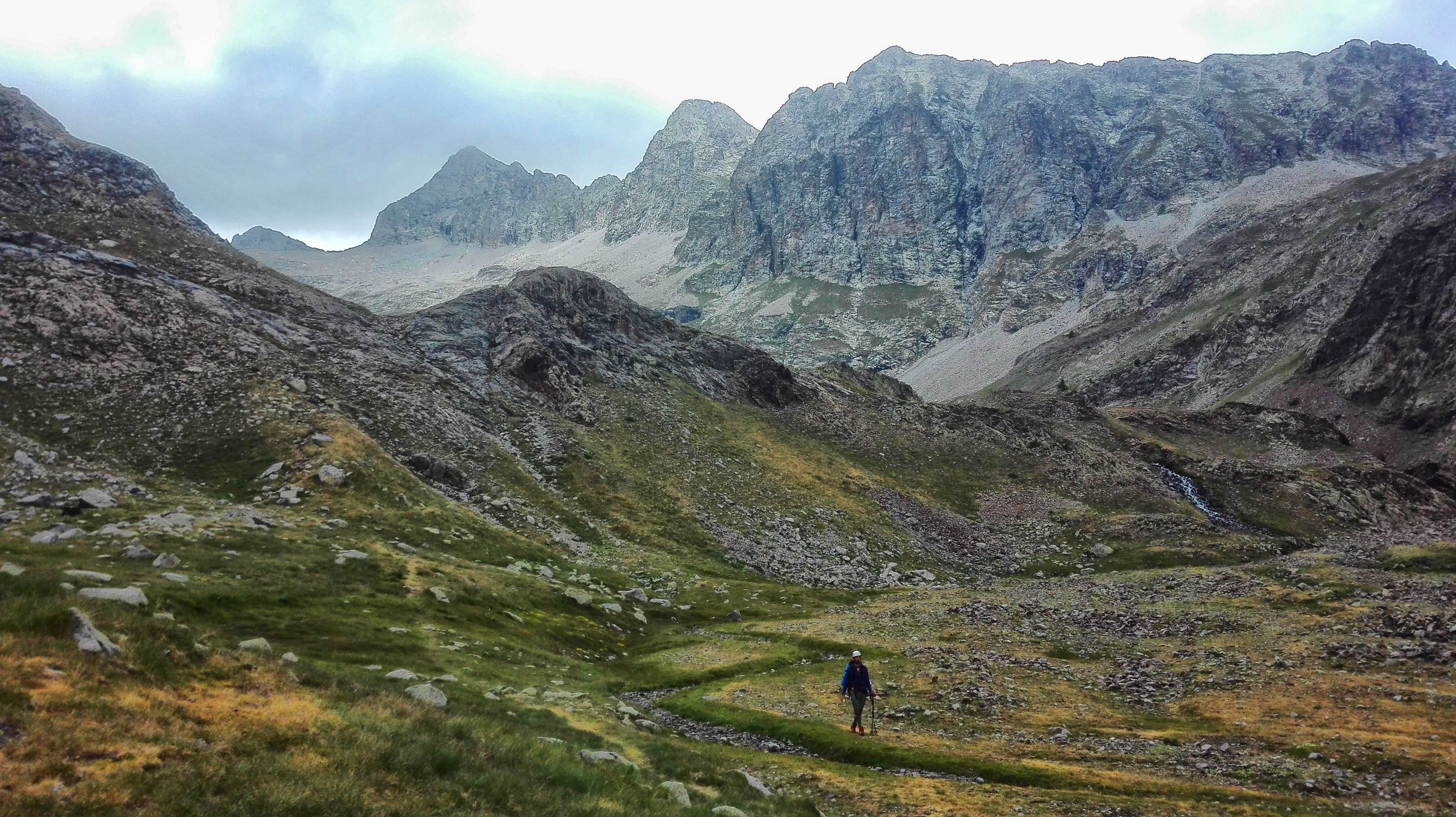 A partir de aquí, la bajada ya transcurre por terreno mucho más sencillo. Debemos descender por un valle colgado, quedando a nuestra derecha el Bagüeña Baixo, por donde avanzamos rápidamente entre roquedos con bastante hierba