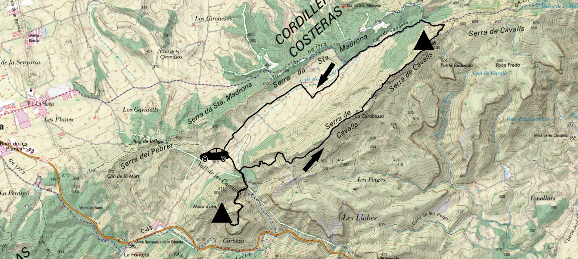 La Serra de Cavalls es un cordal situado entre la Ribera d’Ebre y la Terra Alta, cerca del río Ebro, que en este punto ya se acerca a su final. Se trata de una sierra que consta de una única arista, bastante estrecha en ciertos puntos y con un buen número de riscos aflorando en sus laderas, siendo el punto más alto de la arista la llamada Punta Redona. La característica más notable de la Serra de Cavalls es la abundancia de muelas en su entorno, apareciendo estas fortalezas calizas principalmente en su parte meridional y occidental. Entre todas ellas destaca la Mola d’Irto, situada en el extremo oeste, muy próxima a la siguiente sierra de la Prelitoral, la destacada Serra de Pàndols. Los desfiladeros de la Mola d’Irto dominan el estrecho del Barranc de Gandesa y la convierten sin duda alguna en una de las montañas más bonitas de la región. Pero la Serra de Cavalls no solo ofrece intereses paisajísticos y dilatadas panorámicas sobre el valle del Ebro, sino también un atractivo histórico, pues en sus alturas se luchó ferozmente durante la Batalla del Ebro y aún hoy es posible recorrer trincheras y encontrar huellas de aquel tristemente célebre episodio de la Guerra Civil. En esta reseña se propone recorrer la arista integral de la Serra de Cavalls hasta alcanzar la Punta Redona, visitando previamente la Mola d’Irto, completando así esta excursión que aúna paisaje, historia y naturaleza en las tierras del Ebro.