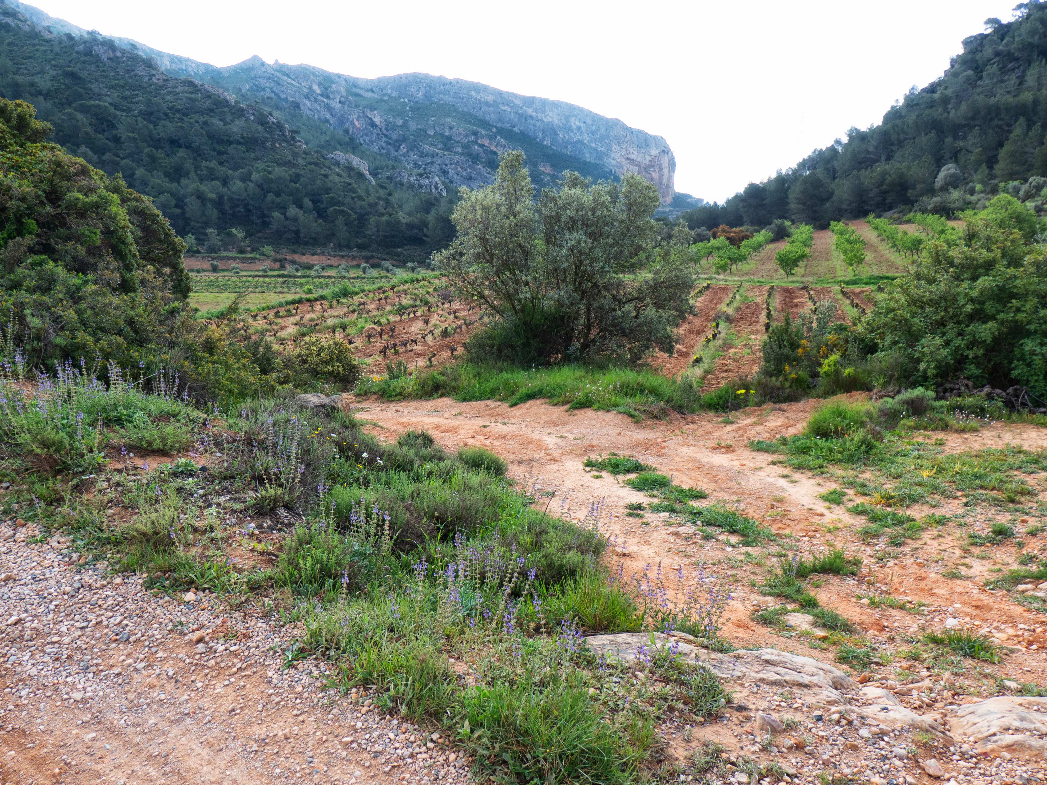 Tomamos una pista en mal estado que desciende hasta las viñas de la Vall de les Carroves y...