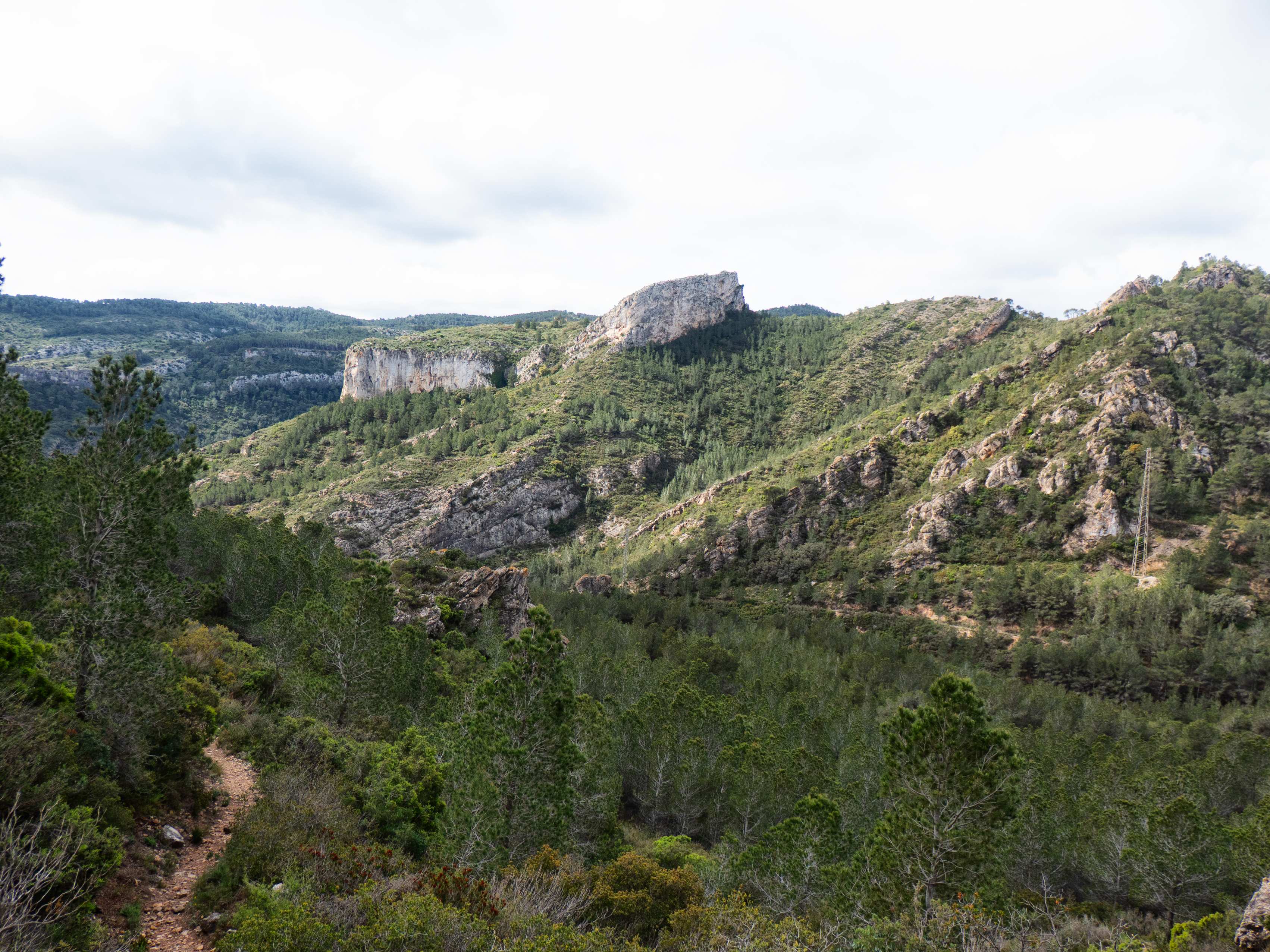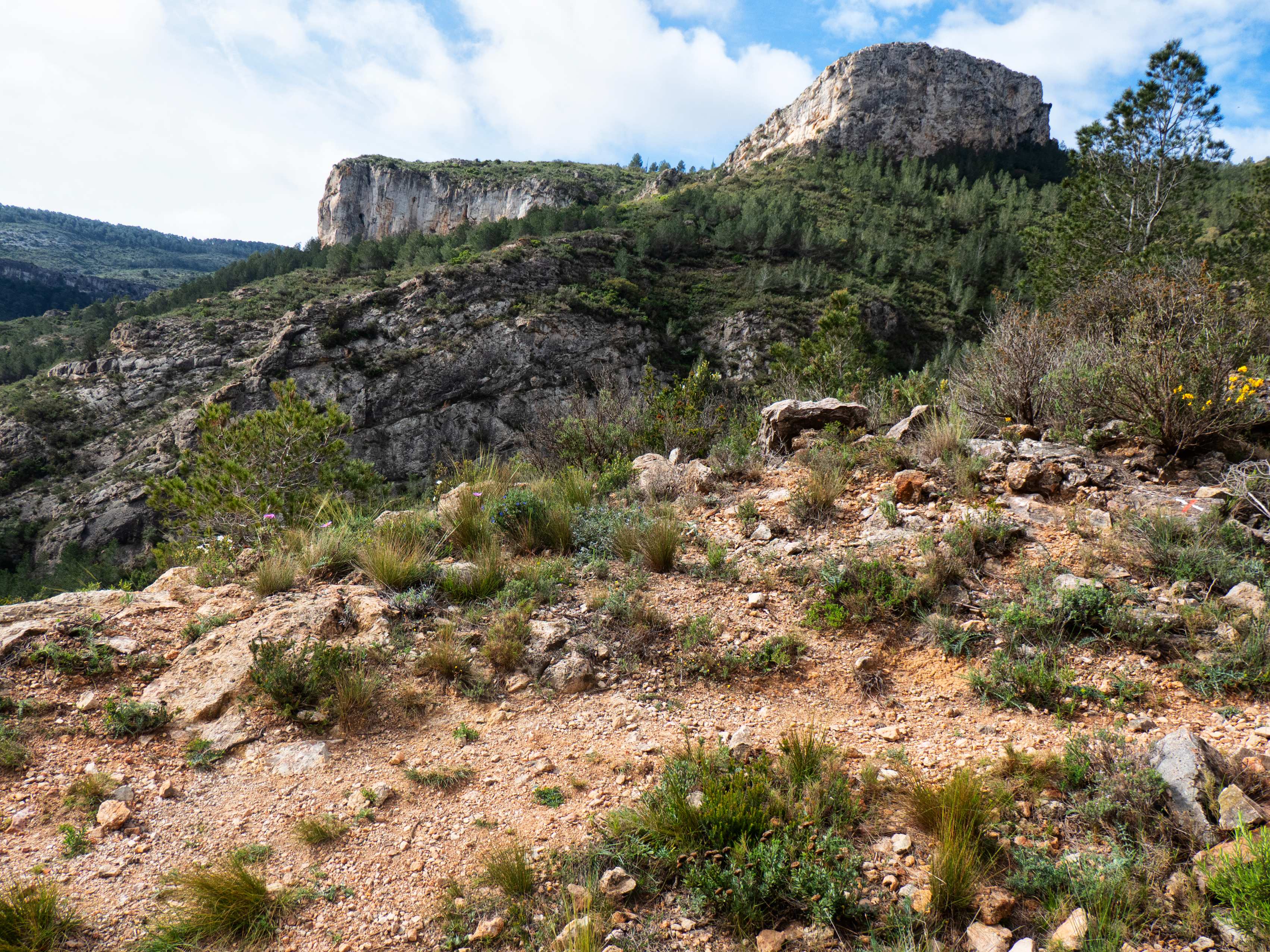 Ahí aparece por primera vez la formidable Mola d'Irto, pudiéndose apreciar perfectamente el único paso que permite acceder a su interior. En este punto dejamos el GR, que sigue valle abajo, y empezamos a andar por un sendero que se dirige a nuestra montaña.