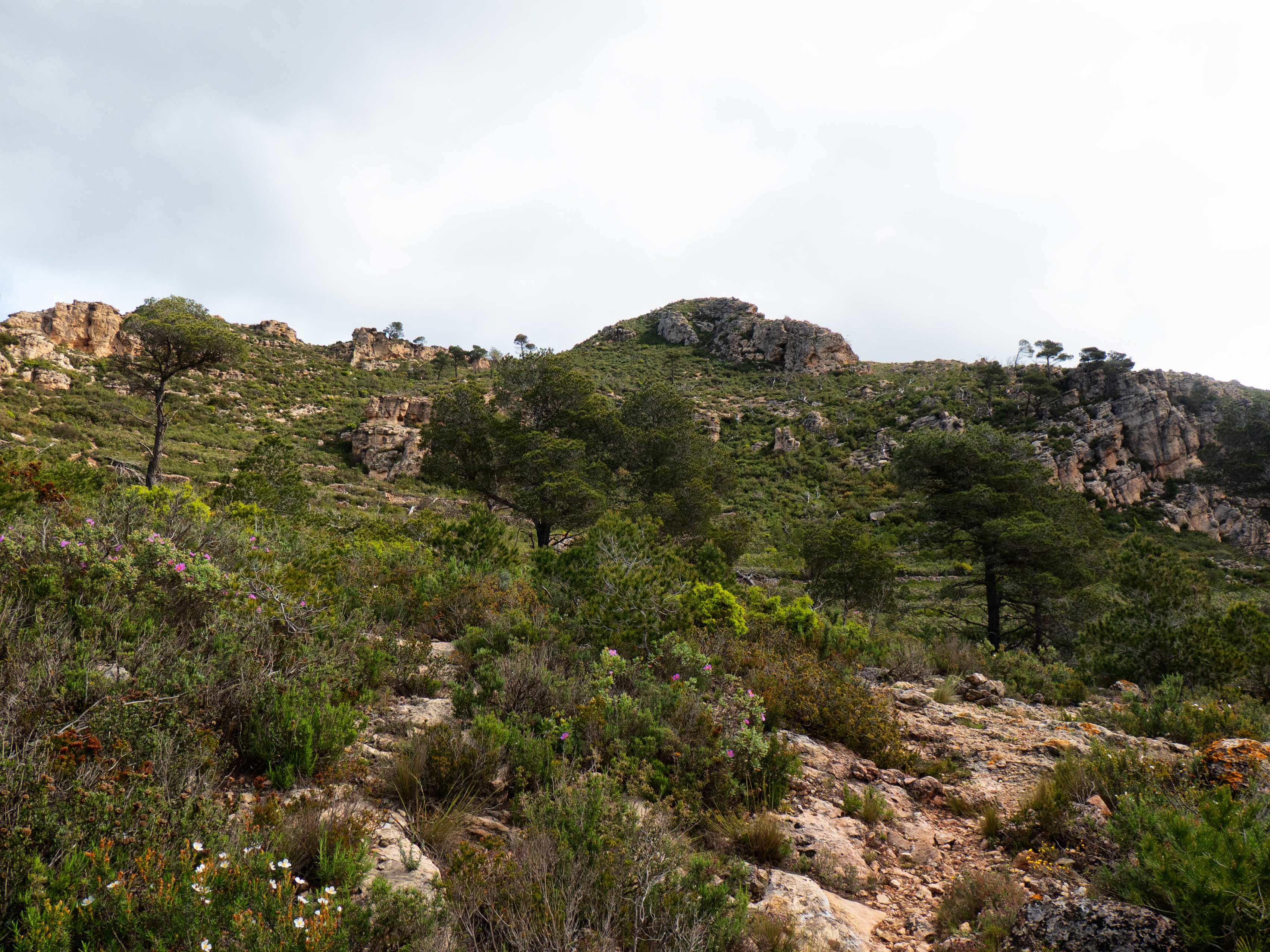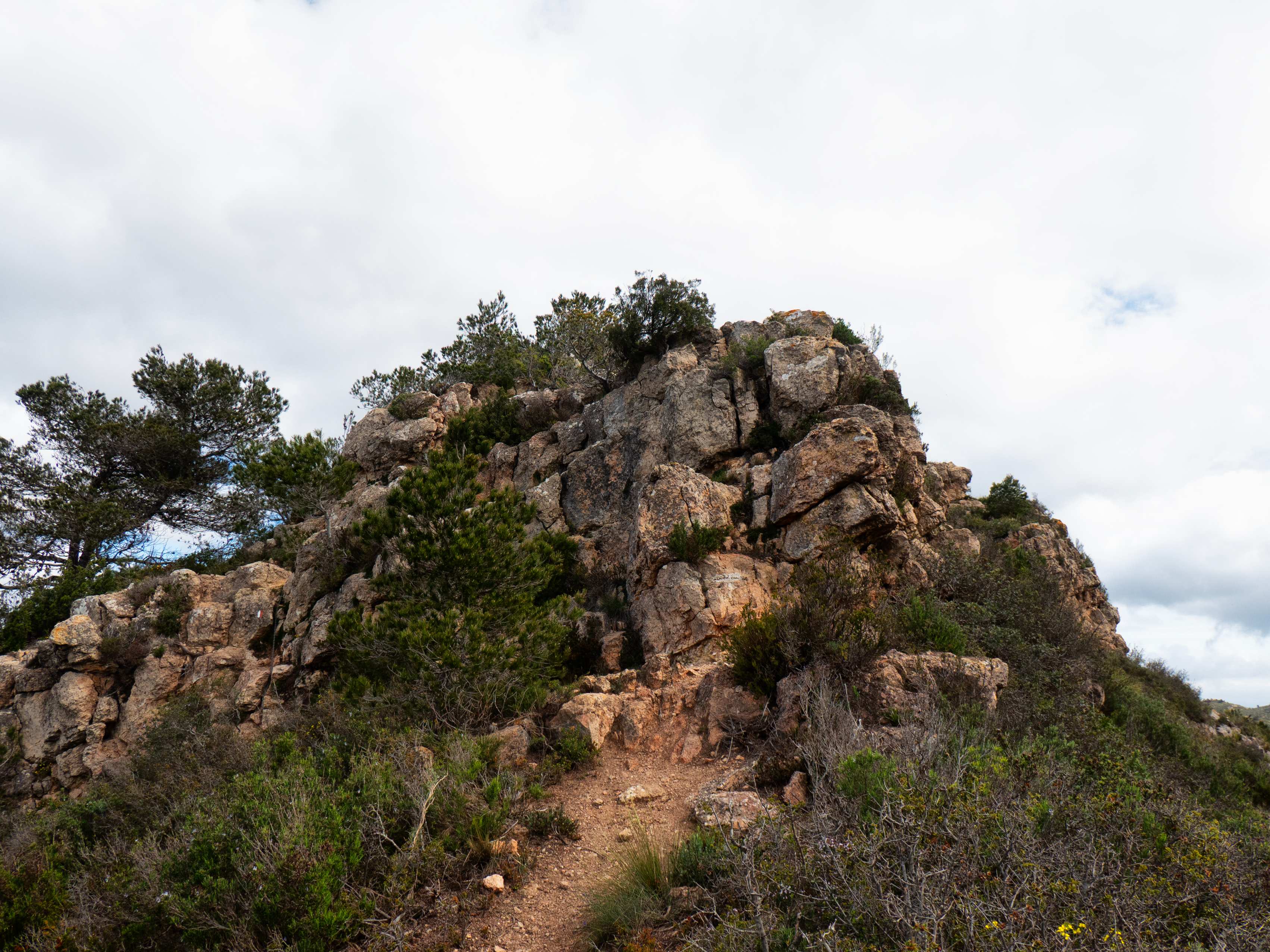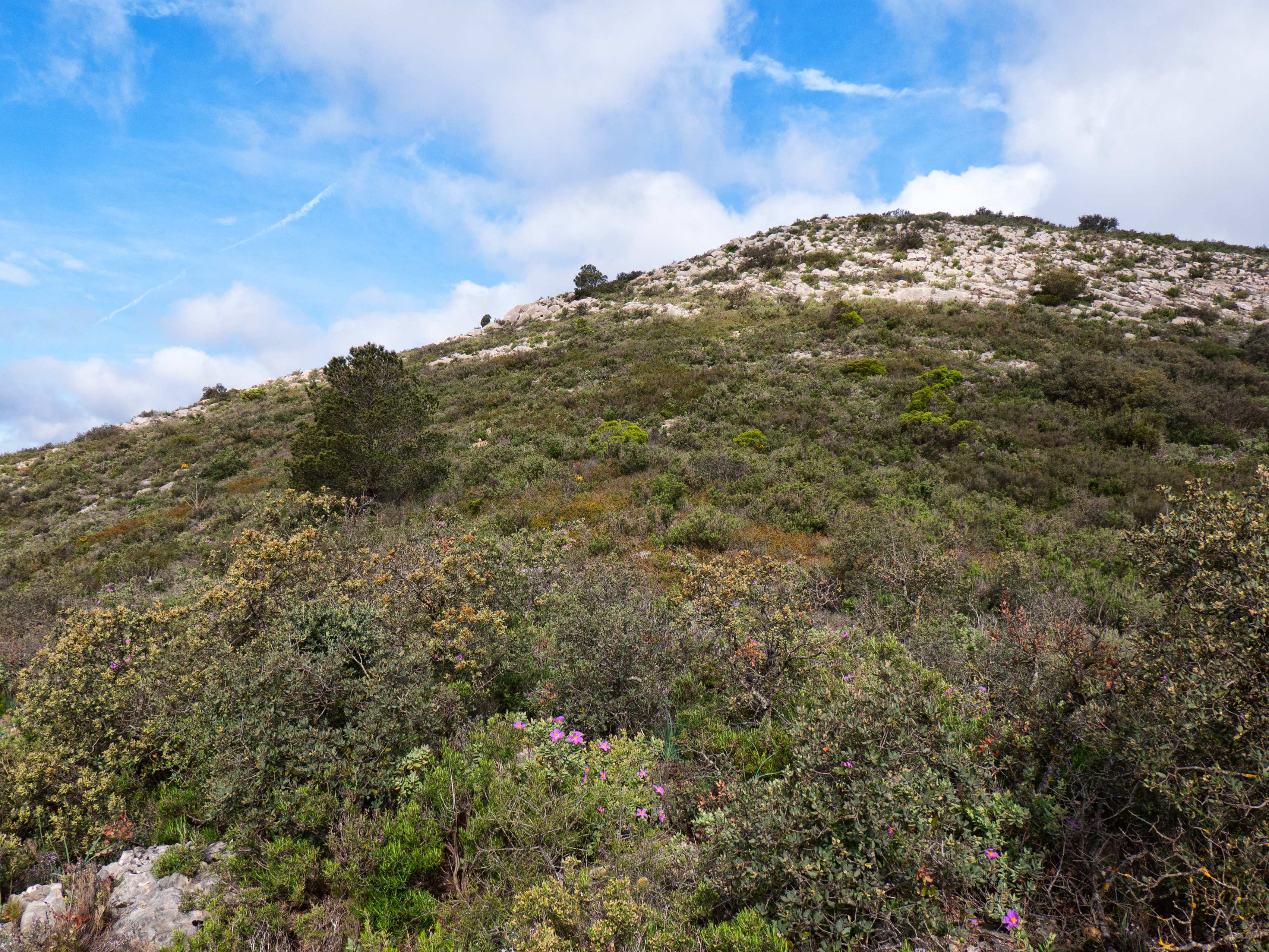 La cumbre de la Mola está situada a mano derecha, a unos 40 metros de donde estamos. Un estrecho sendero, que apenas consigue abrirse paso entre la vegetación espinosa, conduce hasta el crestón calizo donde se encuentra la cima.