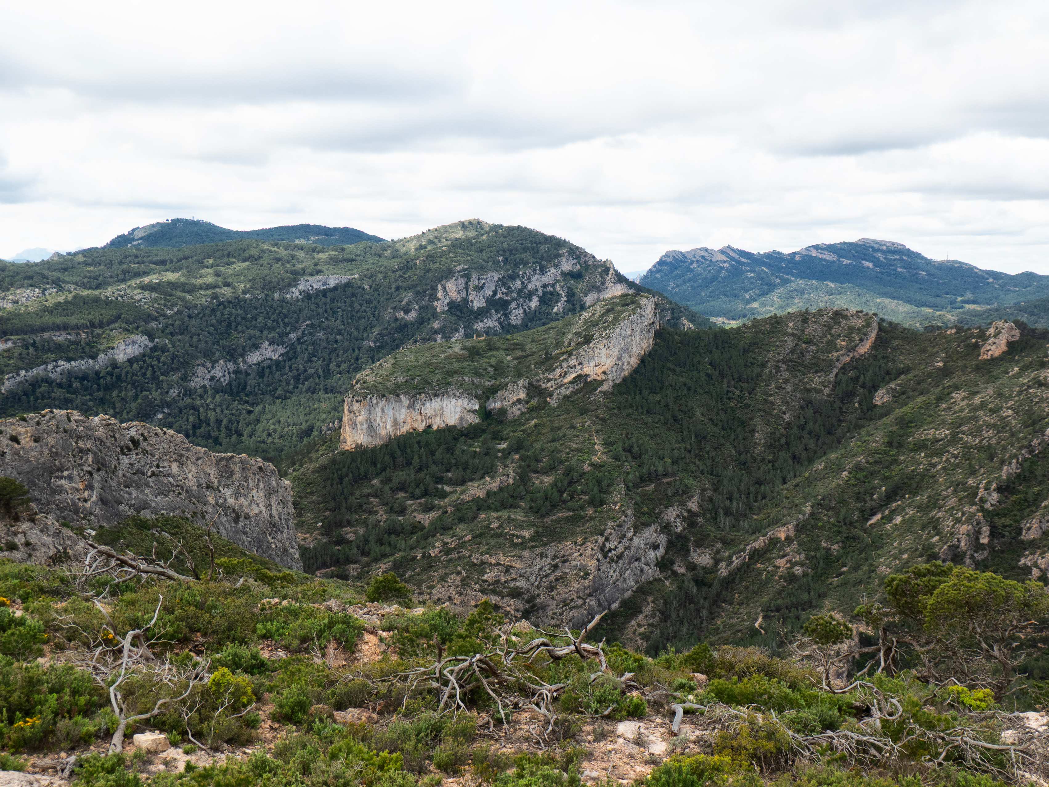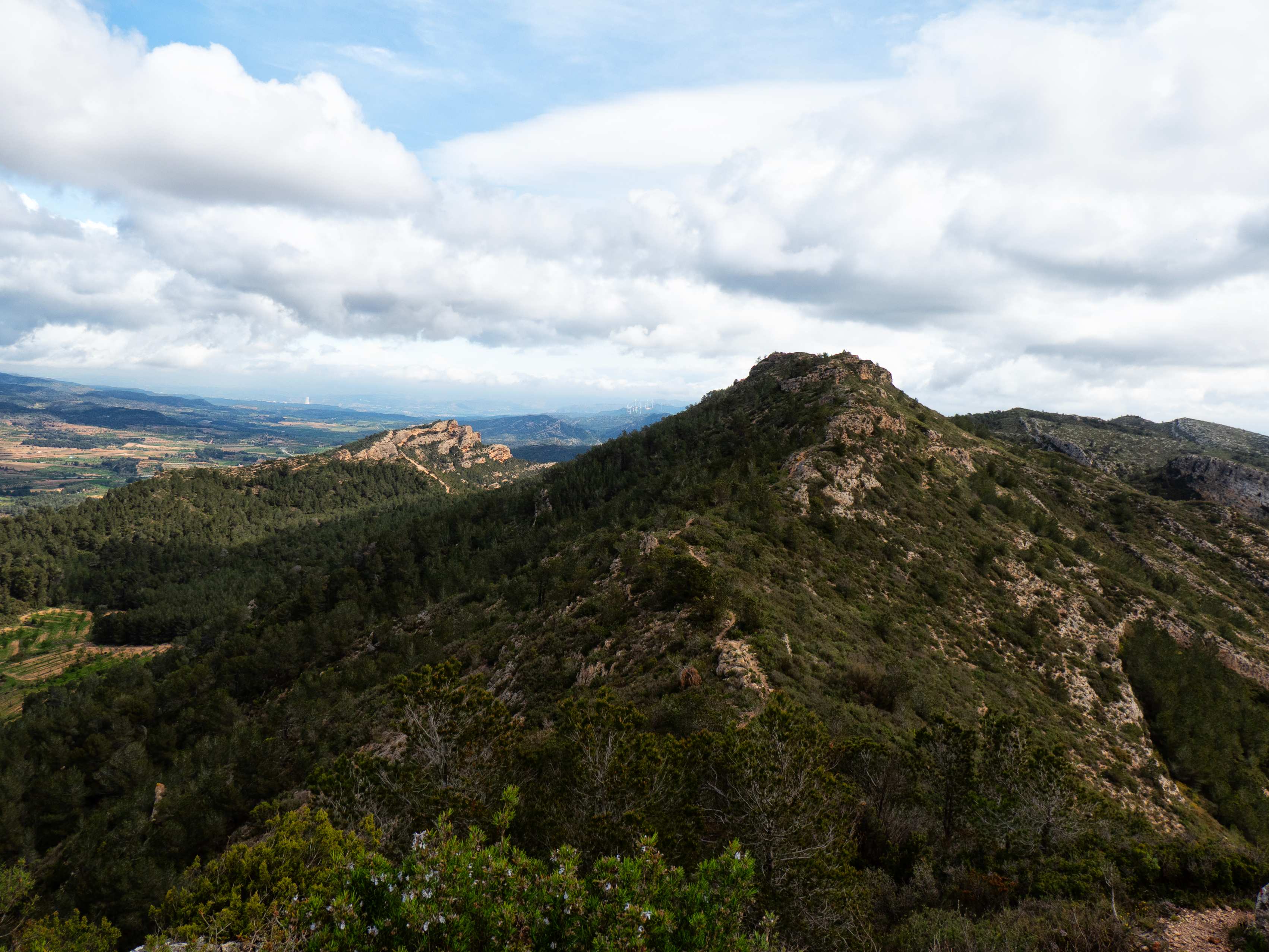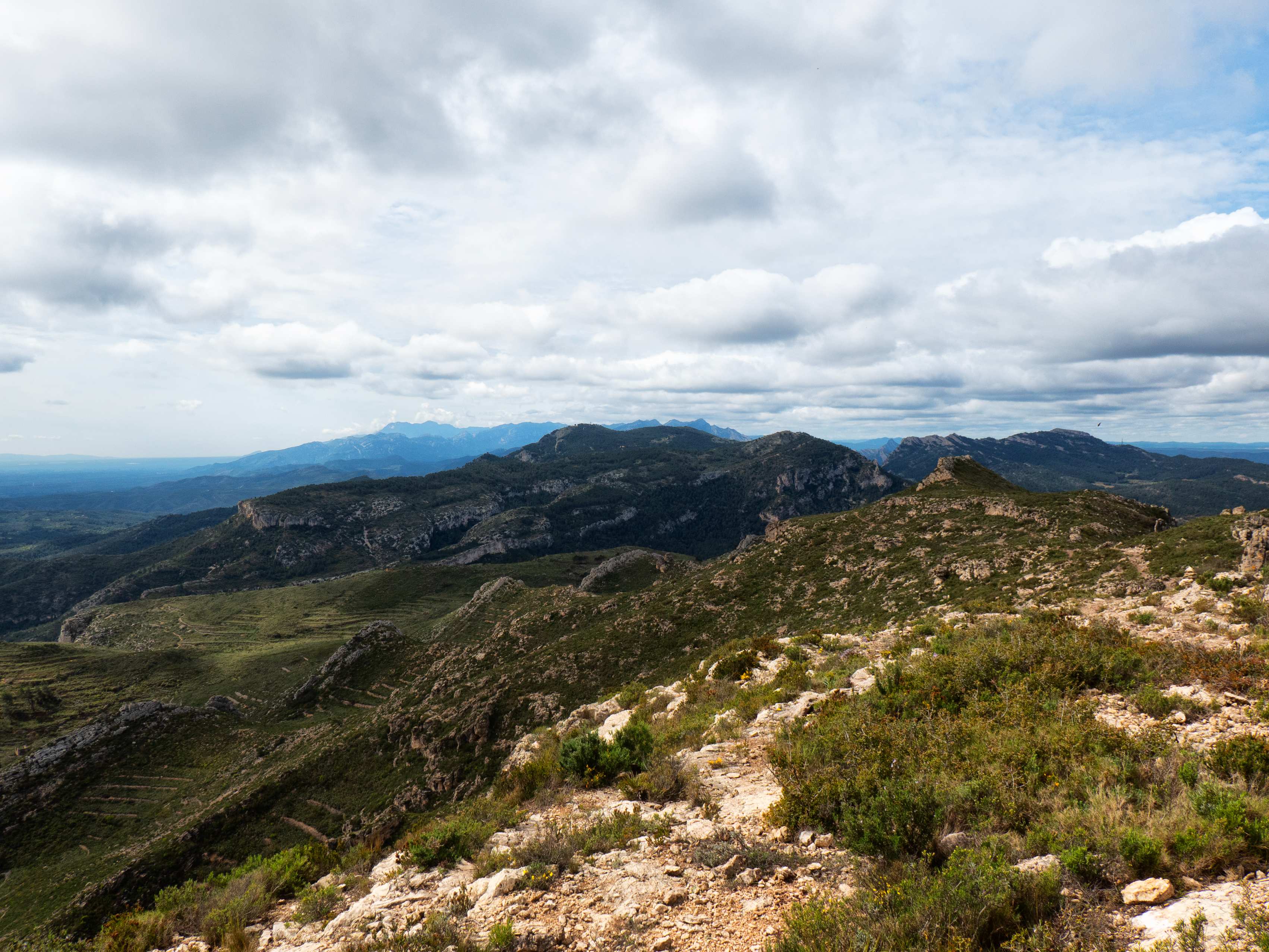 Como ahora pasaremos a recorrer la sierra, perderemos de vista las profundidades del Barranc de Gandesa y su cumbre principal, la Mola d'Irto. A cambio, ganamos perspectiva de las dos cumbres mayores de la Serra de Pàndols, con la boscosa Punta Alta a la izquierda y el rocoso Puig Cavaller a la derecha, separadas por el Coll del Torner, a través de cuyo boquete podemos divisar...