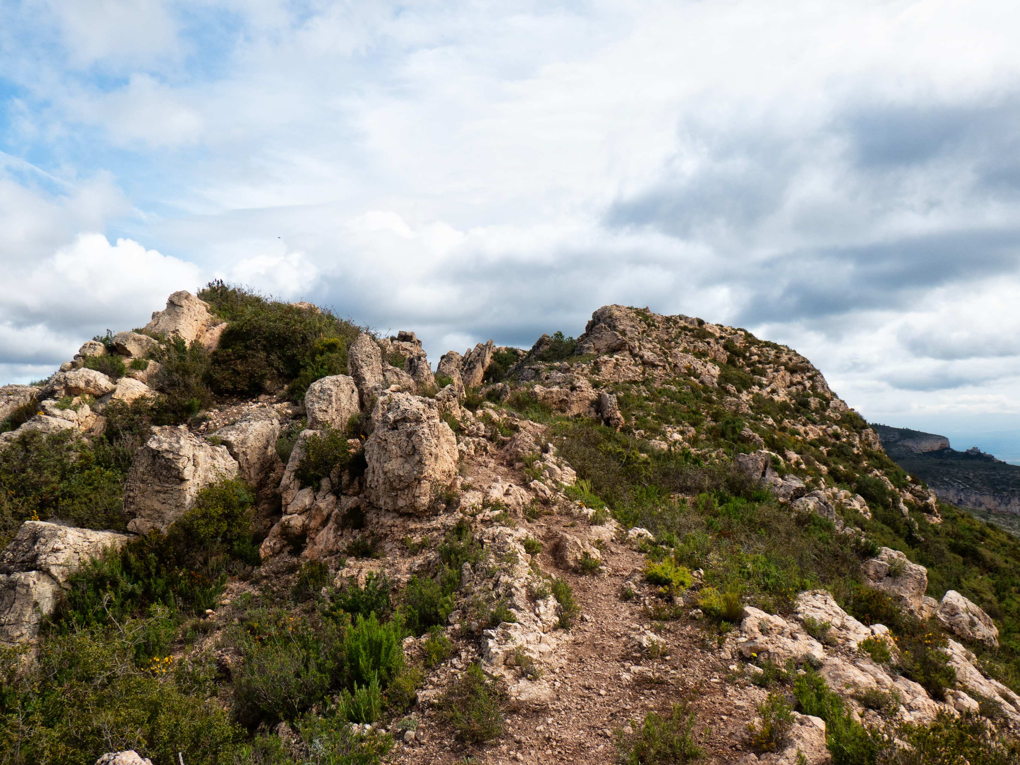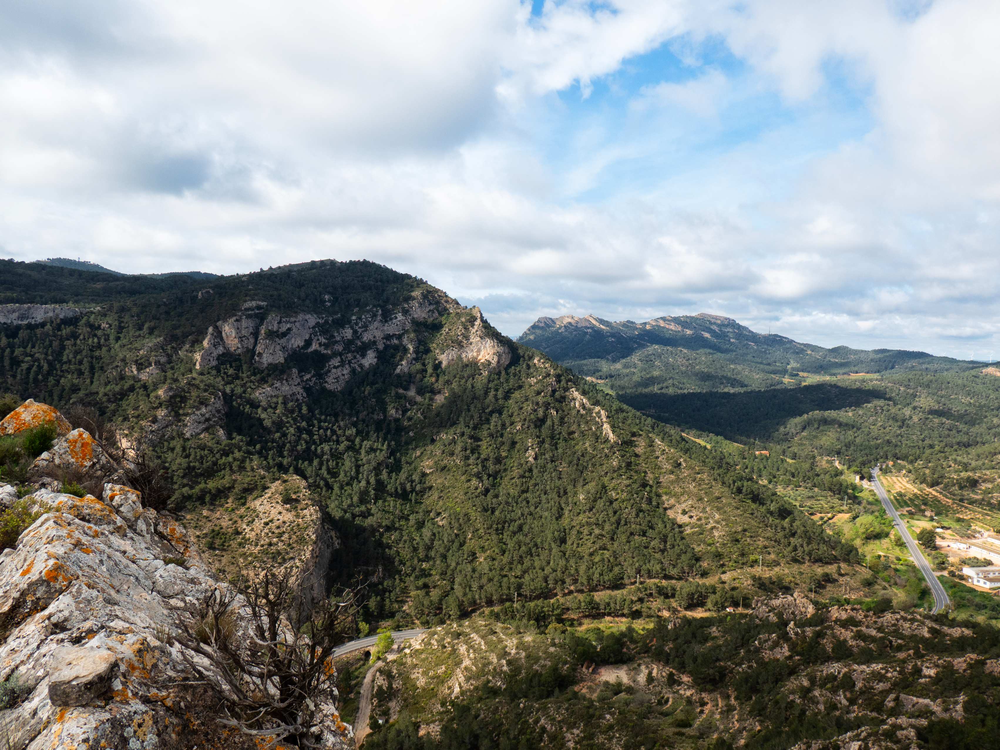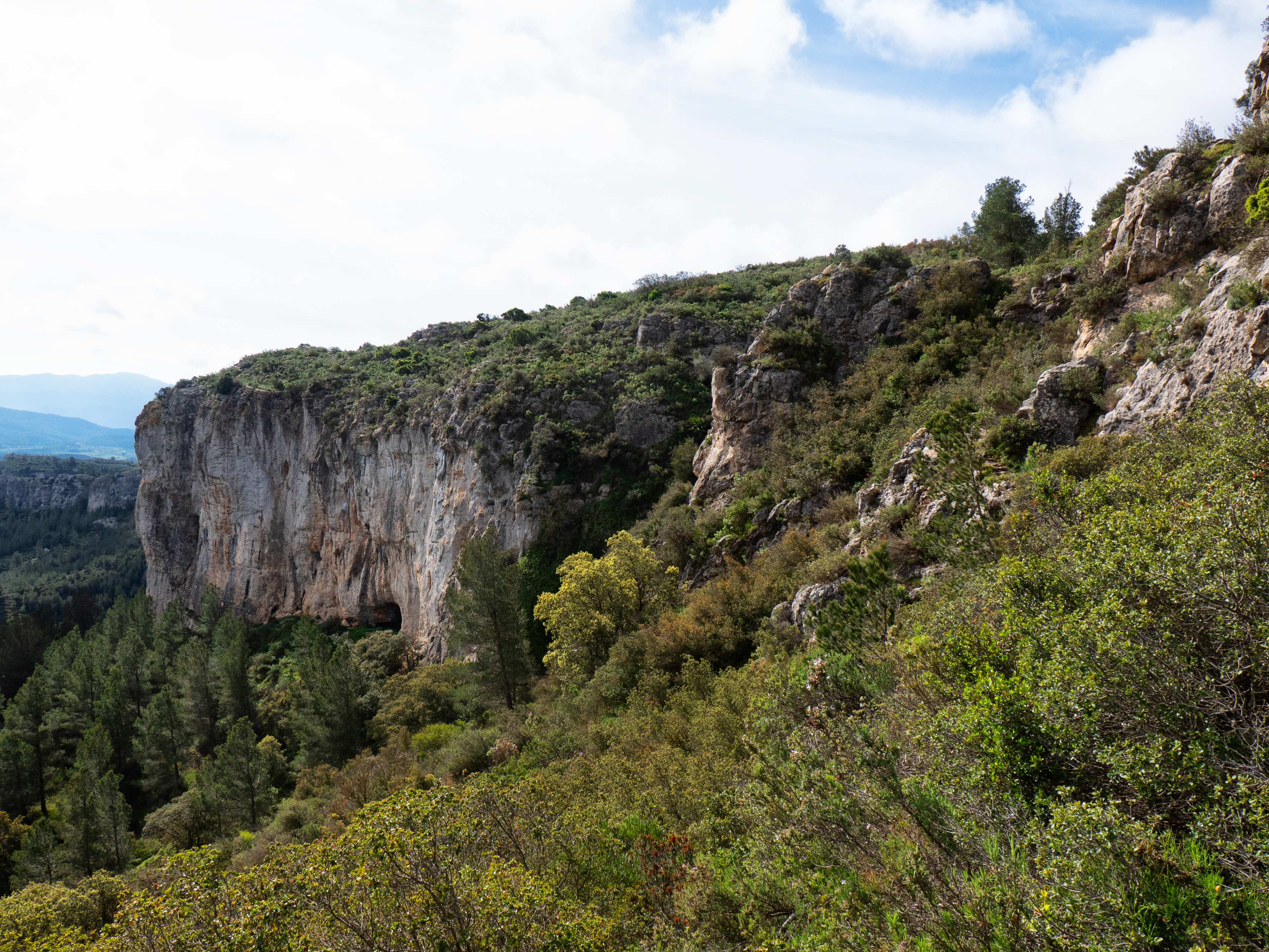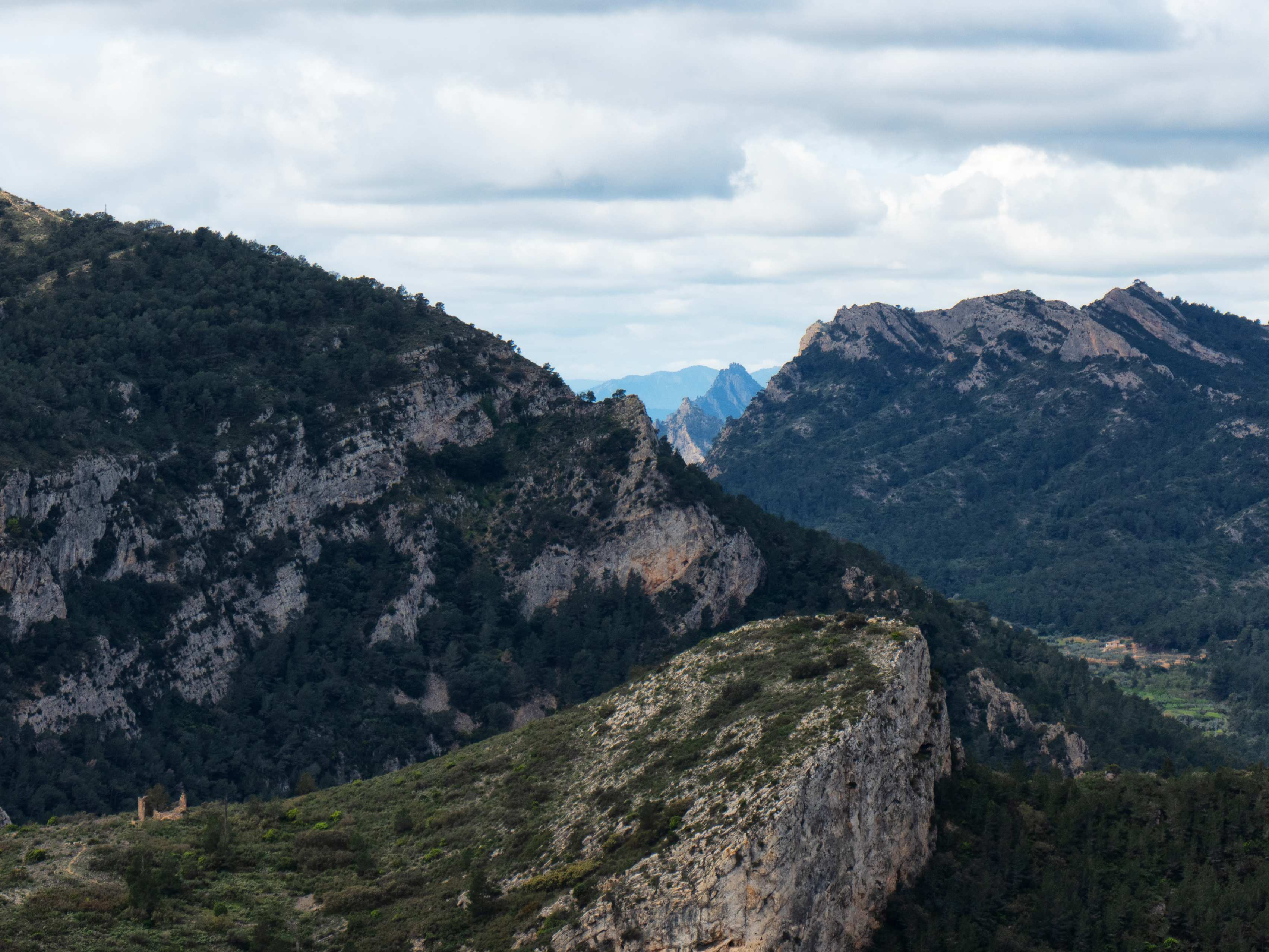 Como ahora pasaremos a recorrer la sierra, perderemos de vista las profundidades del Barranc de Gandesa y su cumbre principal, la Mola d'Irto. A cambio, ganamos perspectiva de las dos cumbres mayores de la Serra de Pàndols, con la boscosa Punta Alta a la izquierda y el rocoso Puig Cavaller a la derecha, separadas por el Coll del Torner, a través de cuyo boquete podemos divisar...
