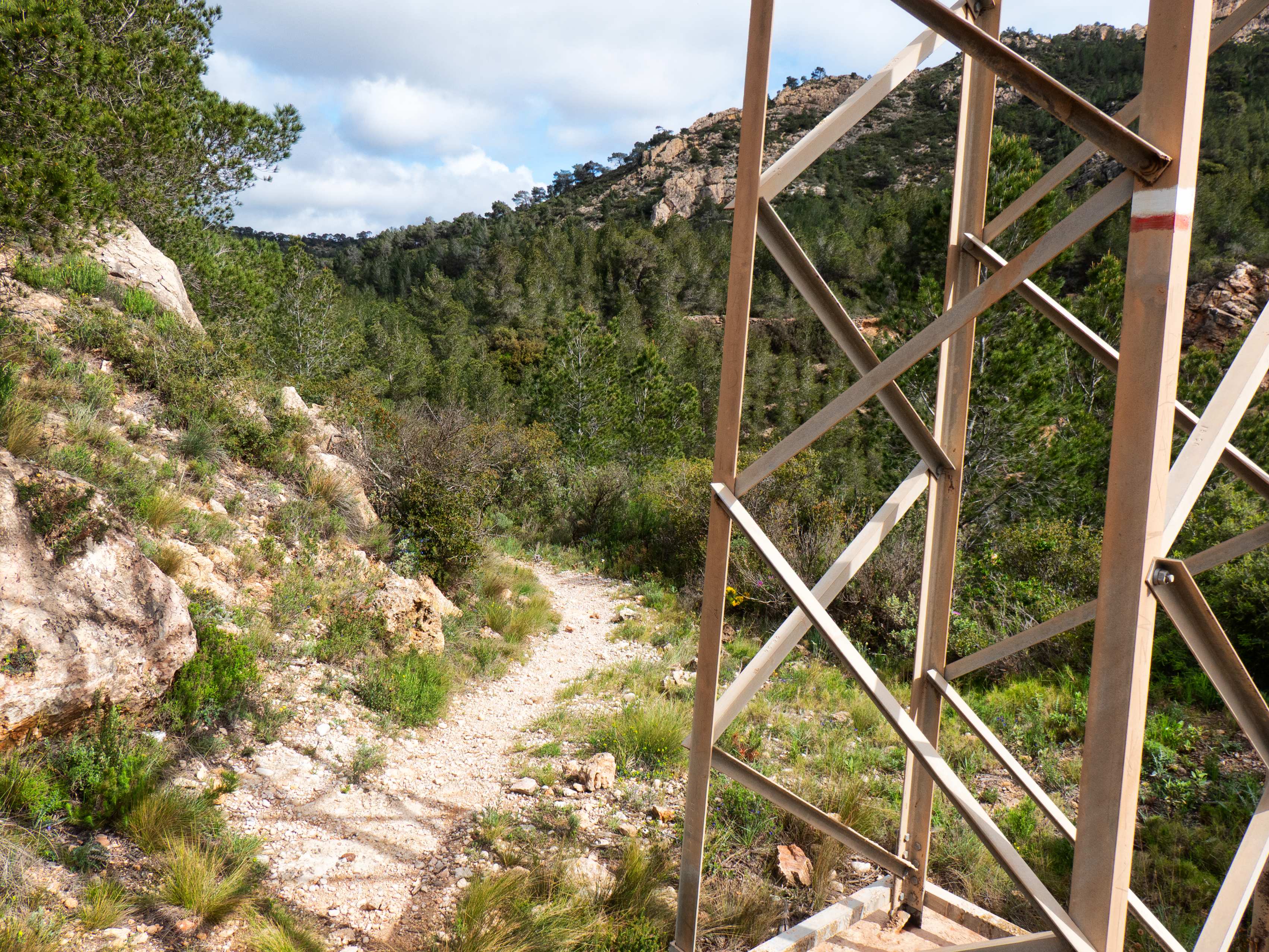 El camino nos conduce a una brecha situada junto a una aguja caliza y bajo una torre eléctrica.