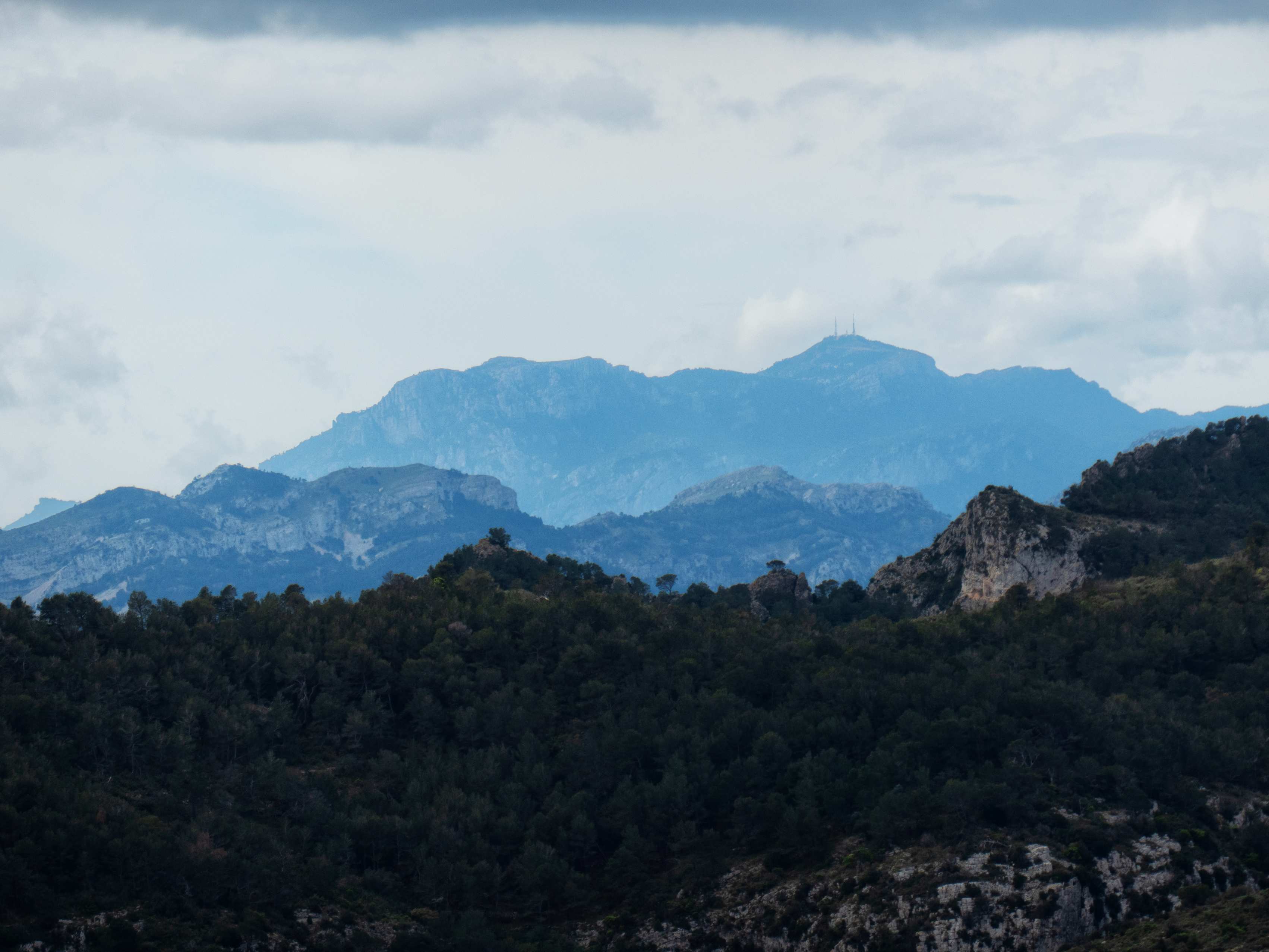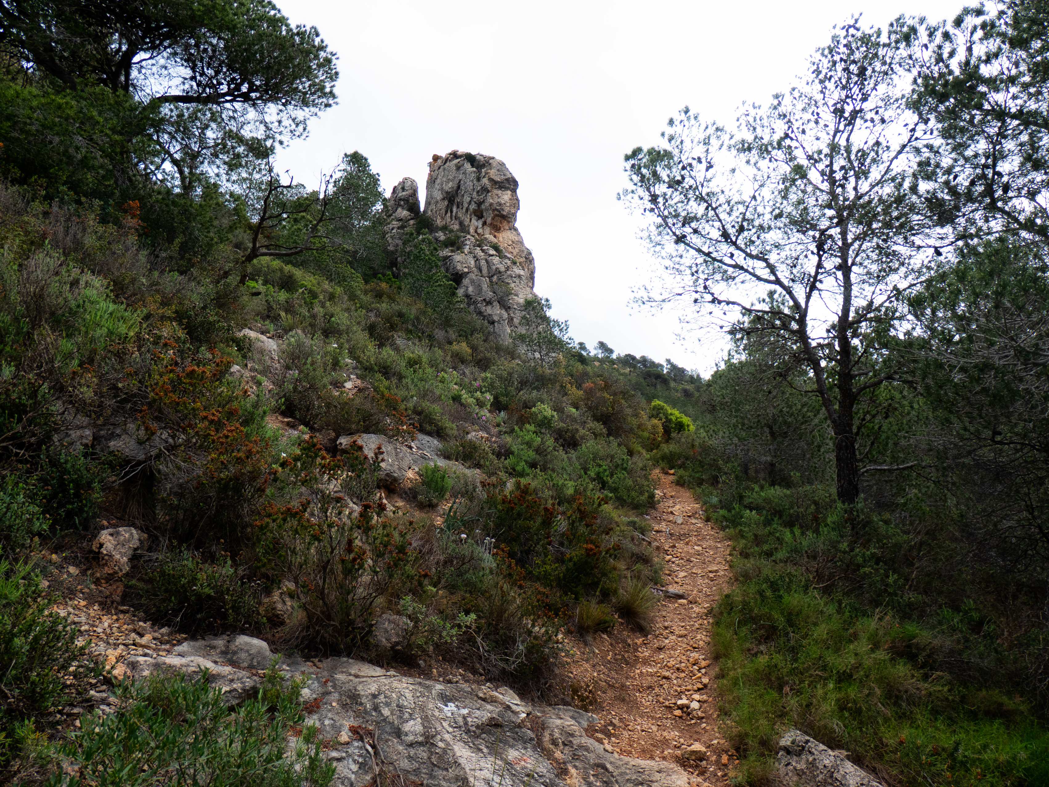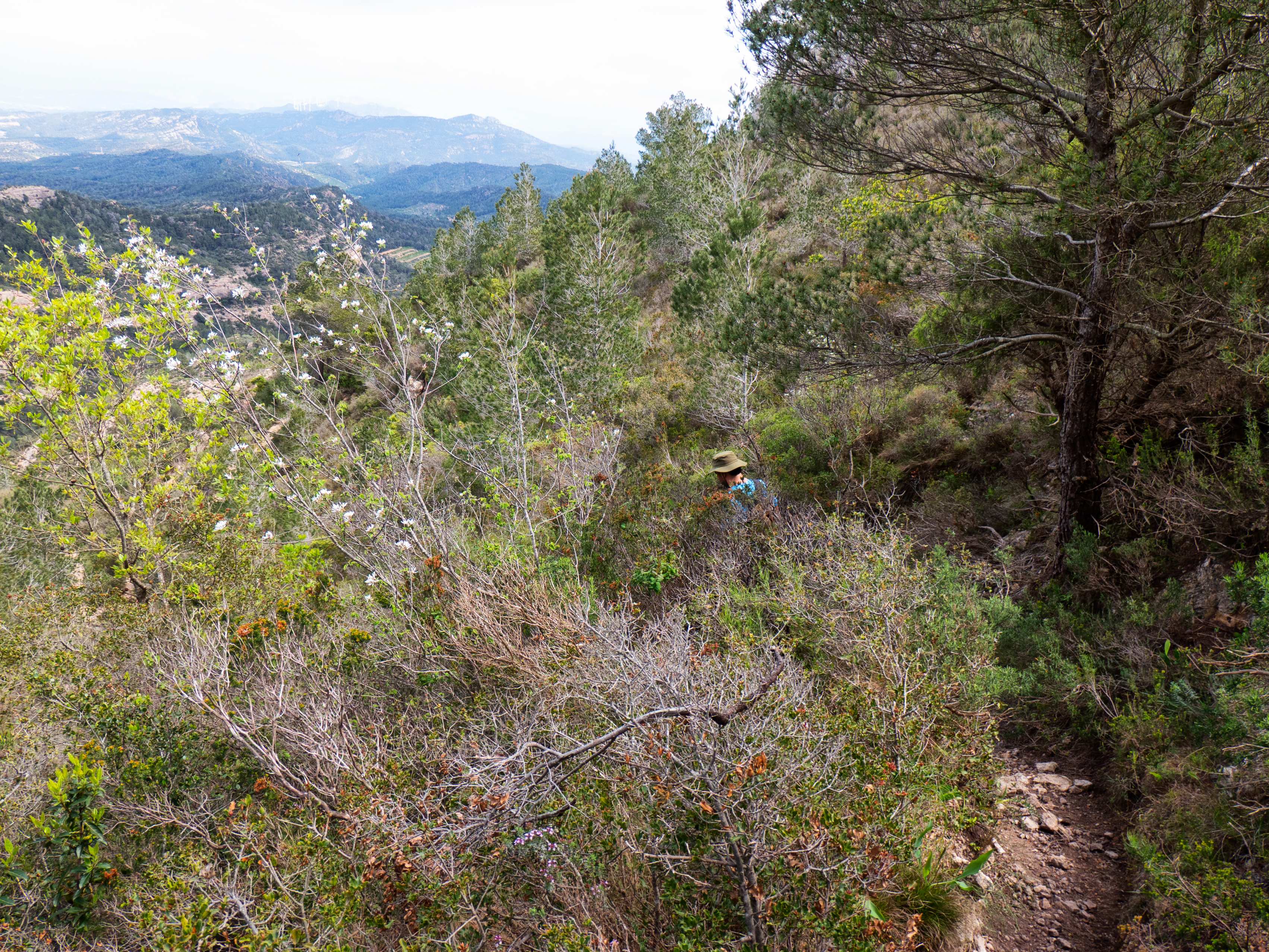 En nuestro descenso entre pinares, vemos aparecer la segunda cumbre más relevante de la zona, la abrupta pero atractiva Serra del Pebre, que teníamos previsto visitar pero que, por falta de tiempo, queda pendiente para otra ocasión.