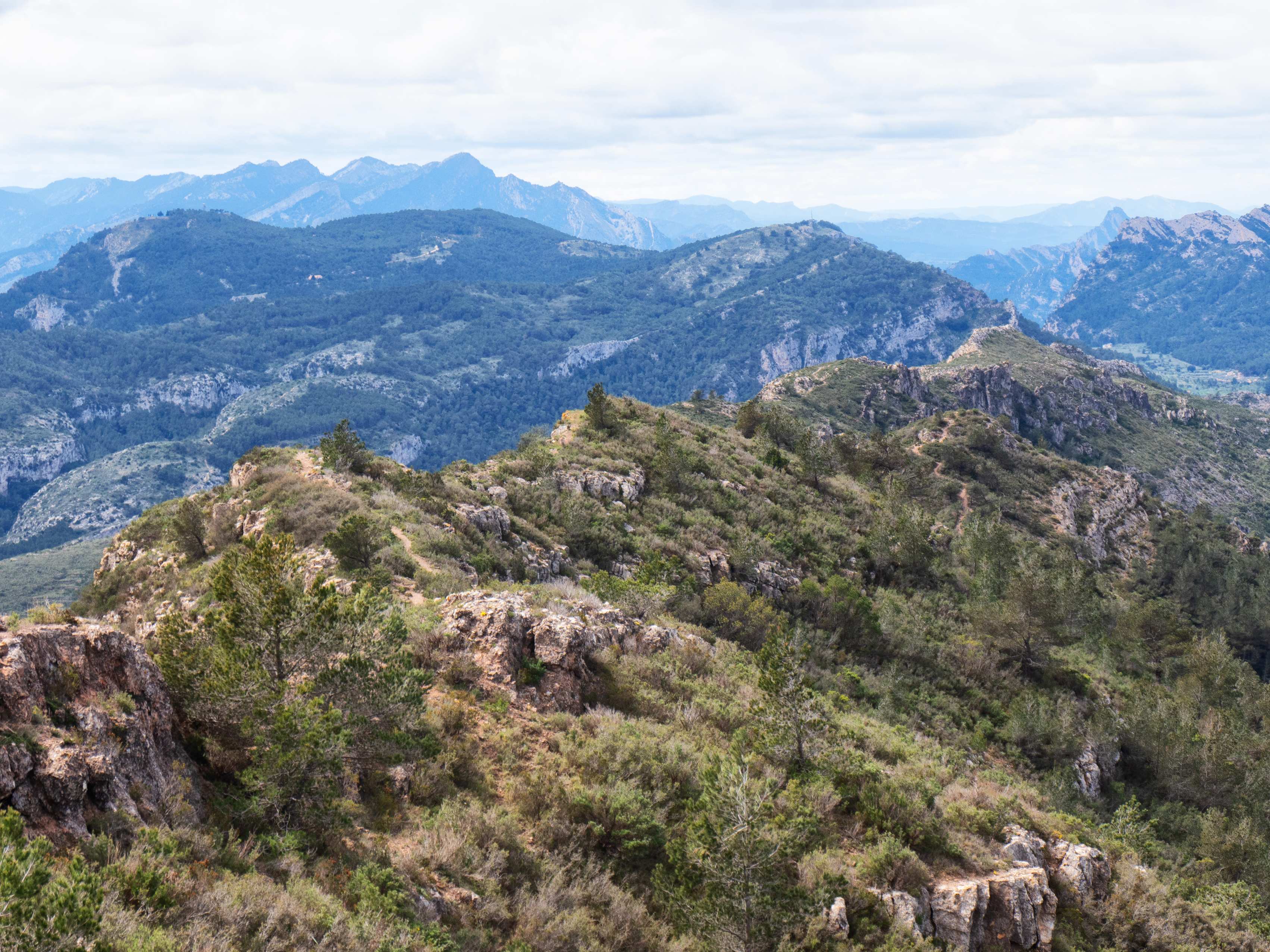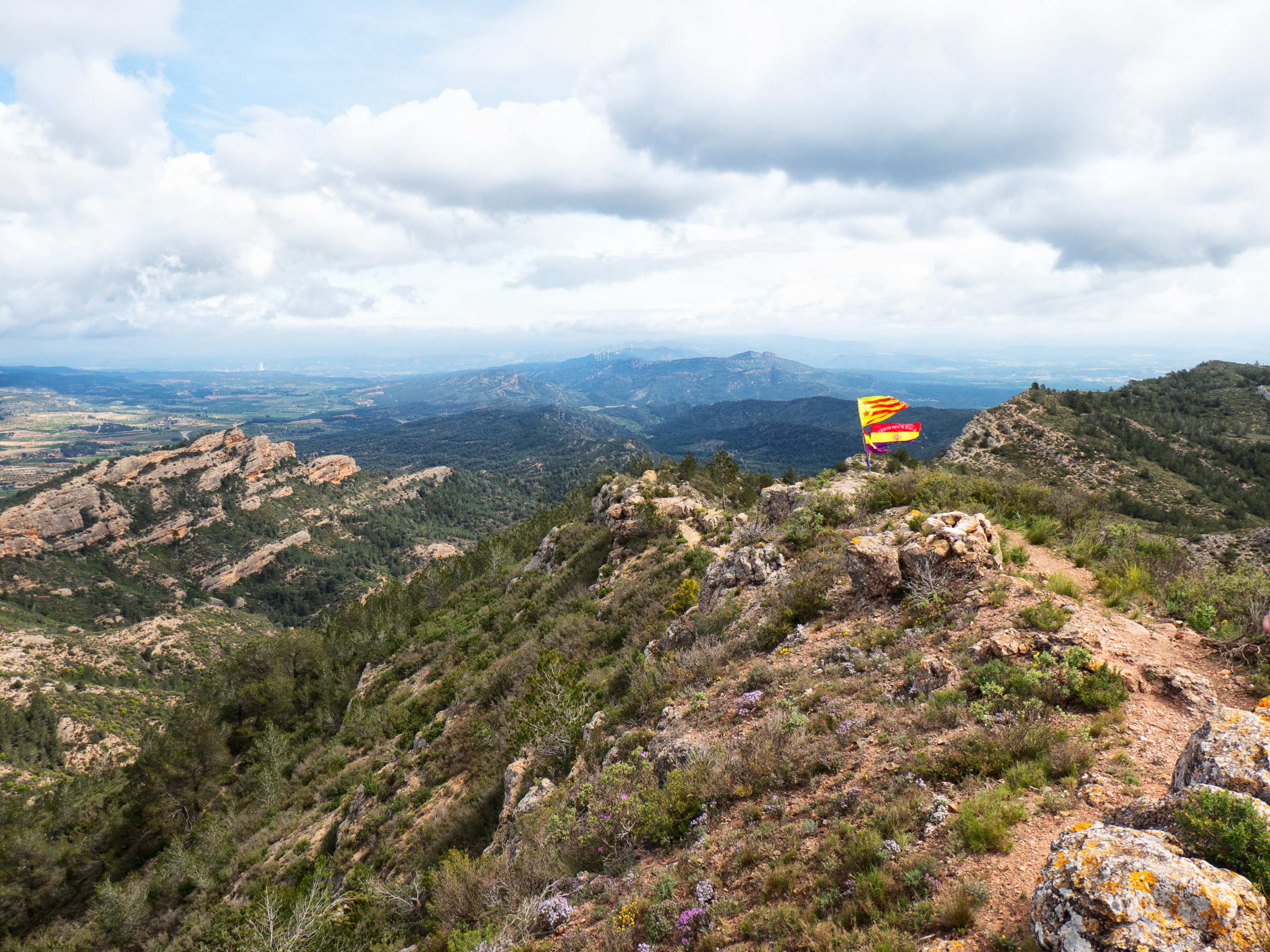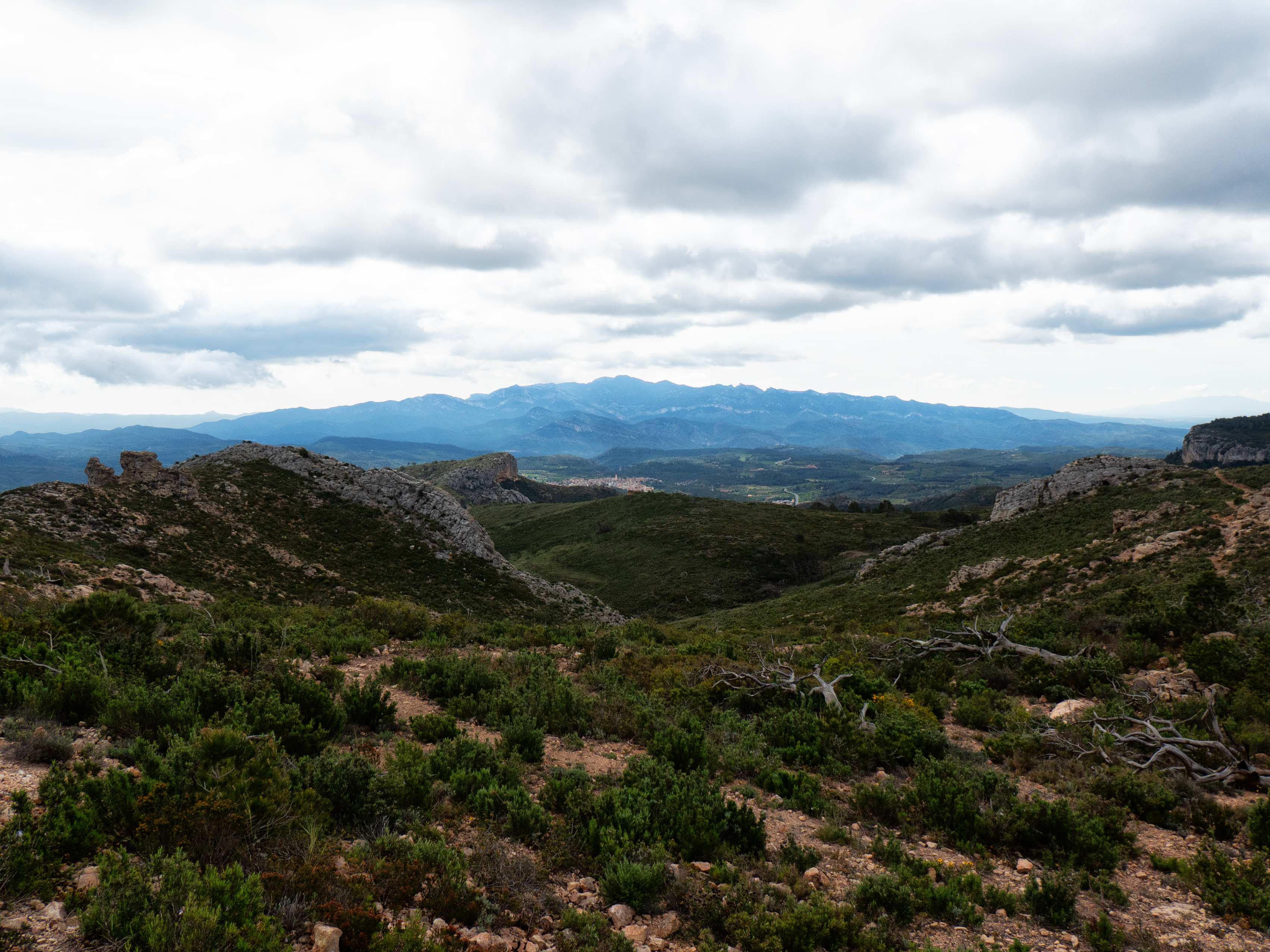 Desde lo alto de la sierra se aprecian con claridad sus rasgos característicos: laderas cubiertas de matorral de las que emergen riscos y dientes calizos. Al mismo tiempo, en el horizonte lejano se distingue la principal cordillera de la mitad sur de Catalunya: los Ports de Tortosa-Beseit.
